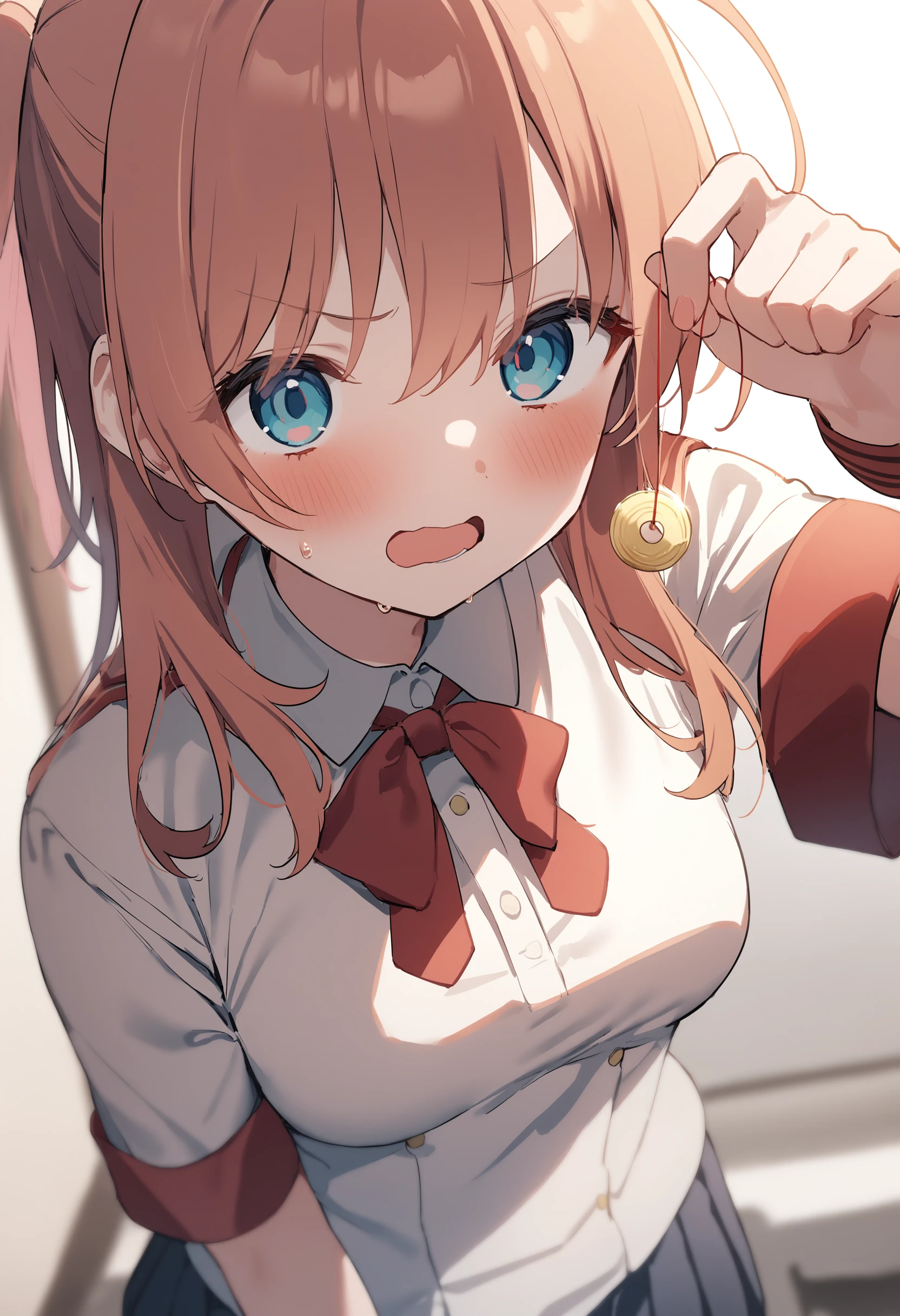 トリガーだけでも大体出ますが looking at viewer, hand up, coin on string 辺りは入れたほうが??します。ただし指が紐を掴む動作をしていても紐がそこから出ているか、硬貨の大きさは適切かなどはランダムなので多少ガチャはいります。