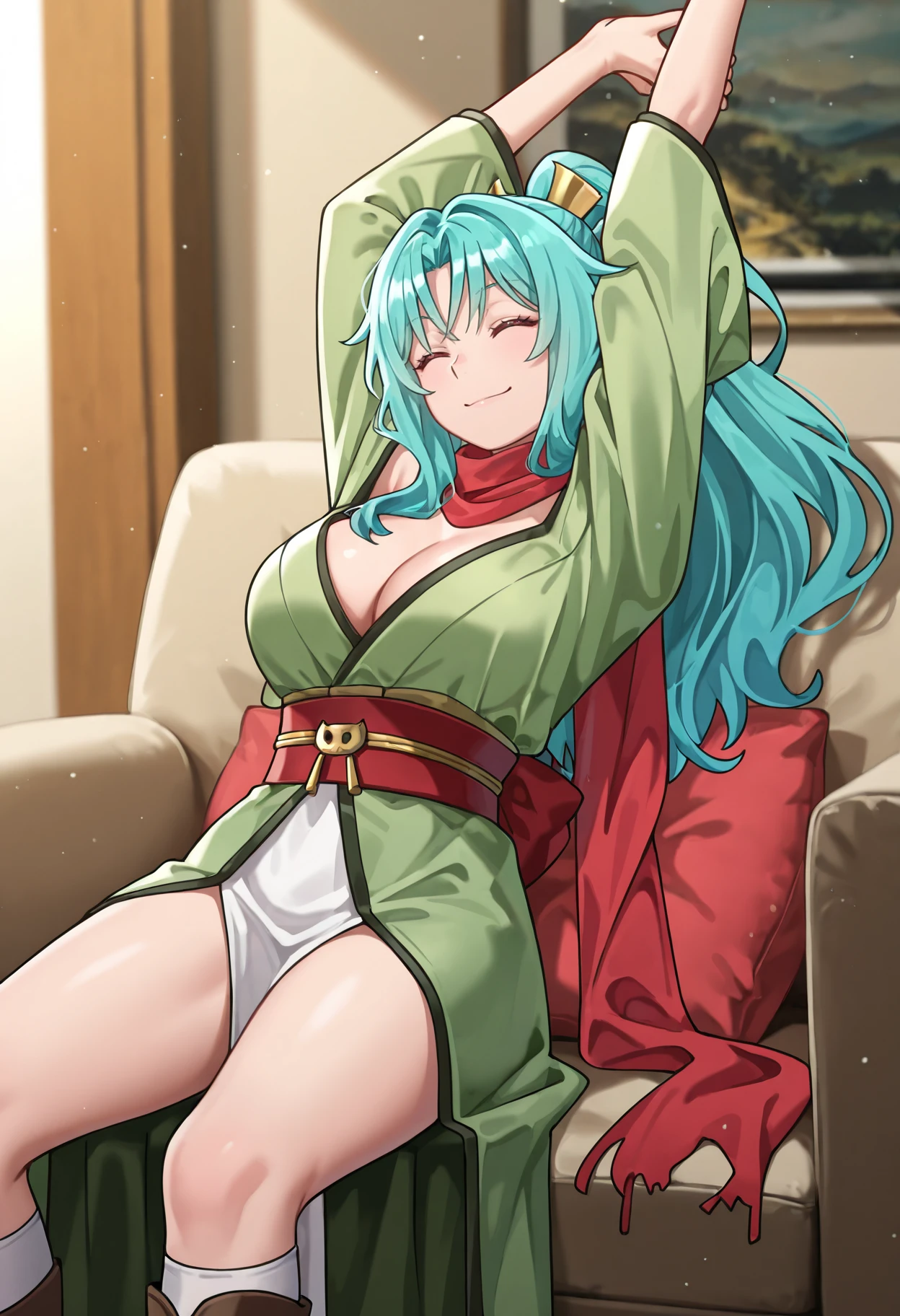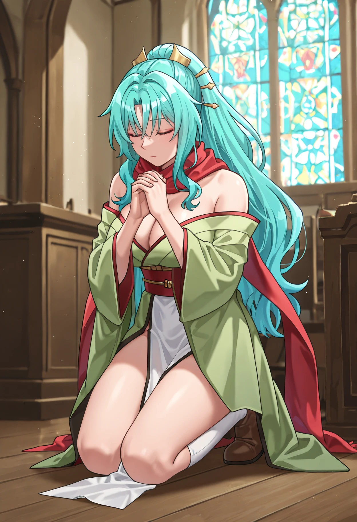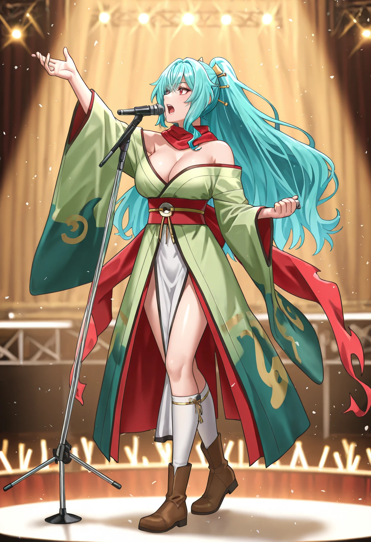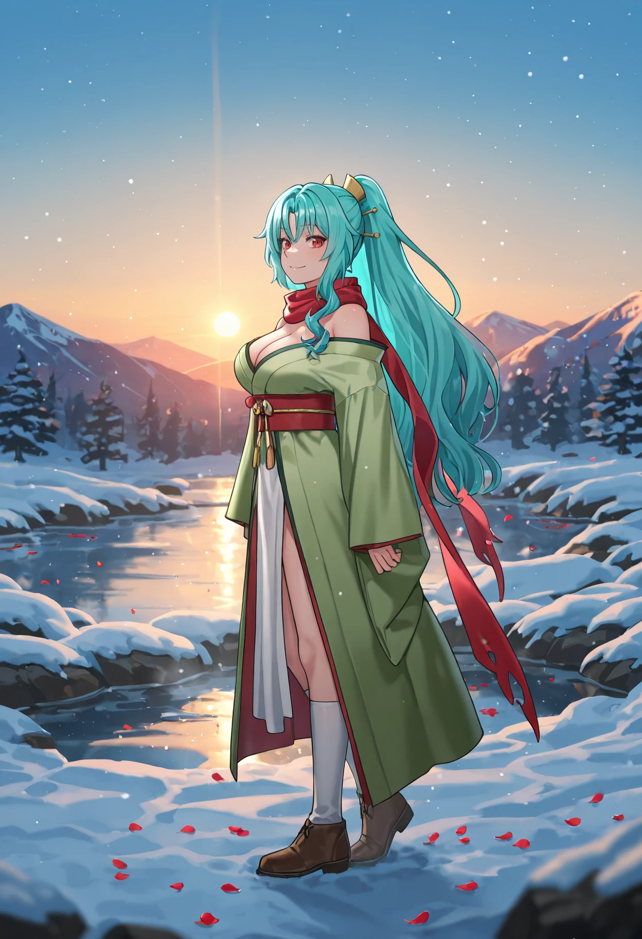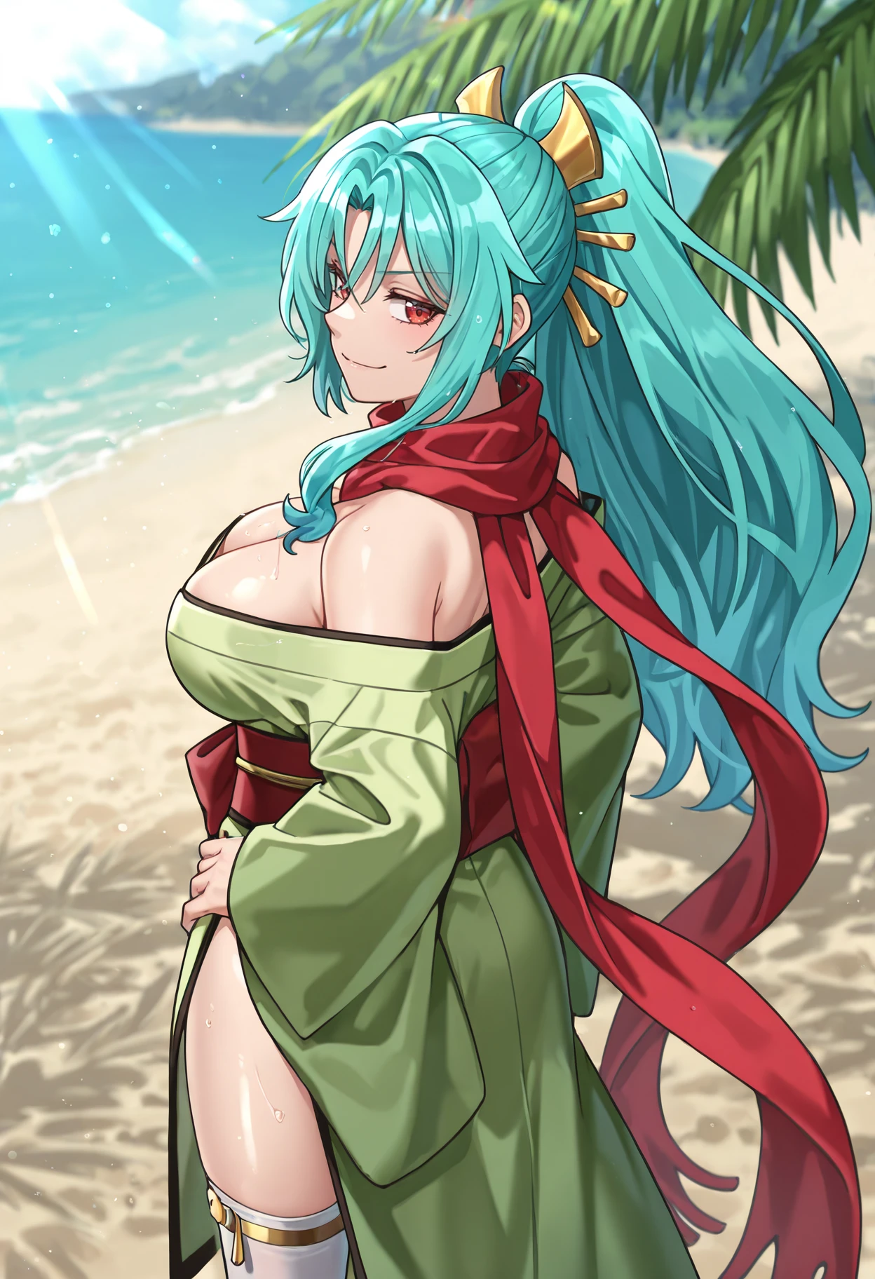 red scarf, hair ornament, cleavage, green kimono, bare shoulders, off shoulder, wide sleeves, long sleeves, red sash, white pelvic curtain, white kneehighs, brown footwear