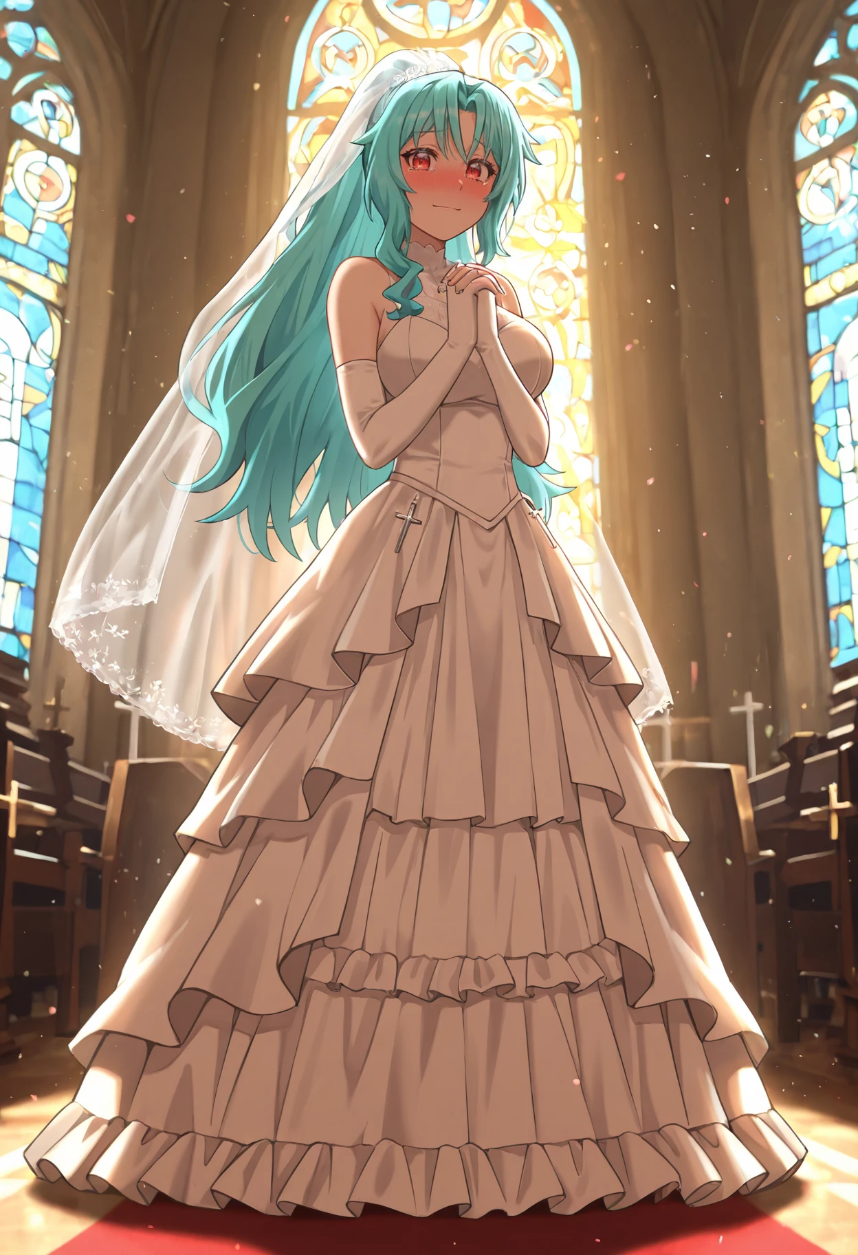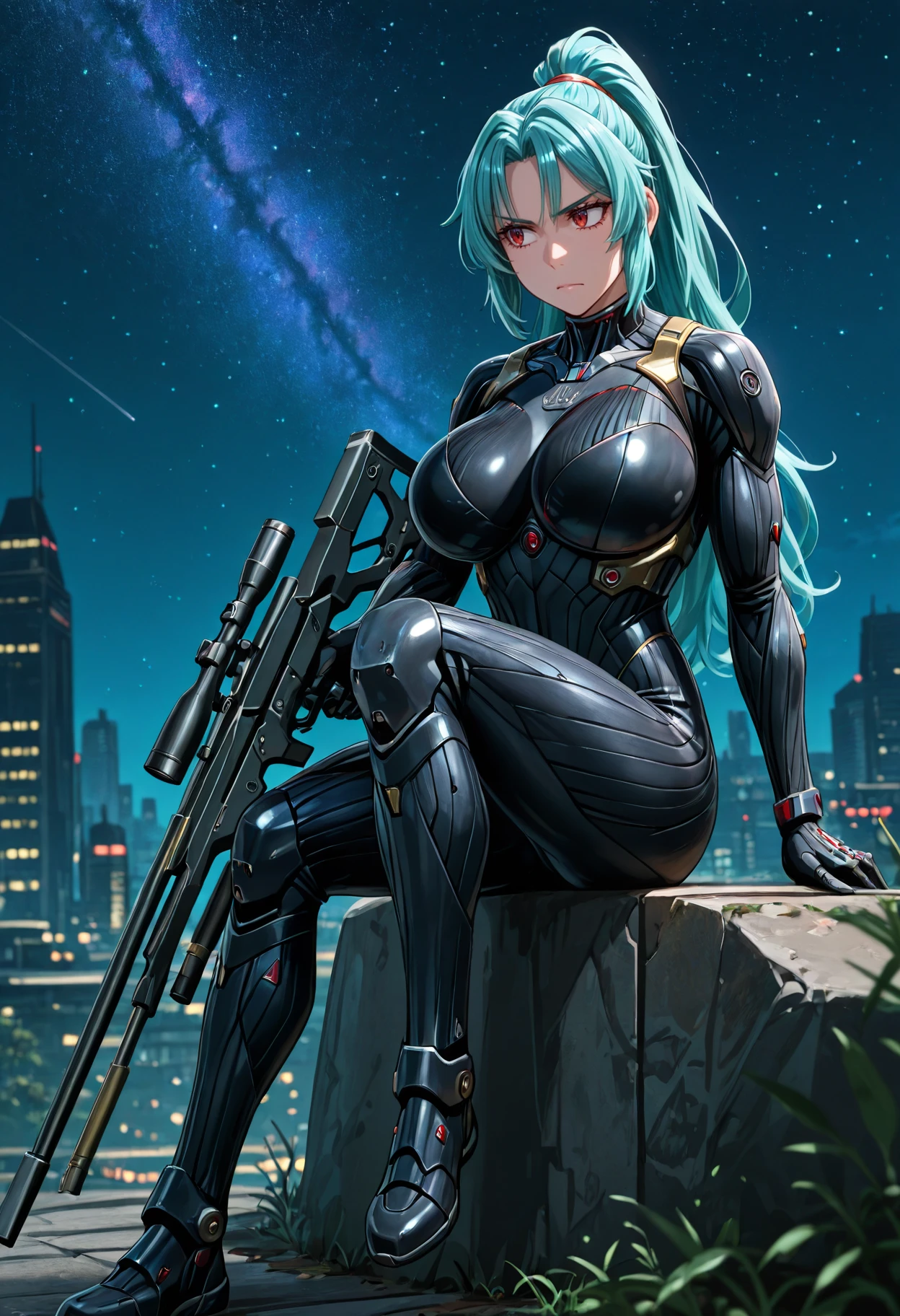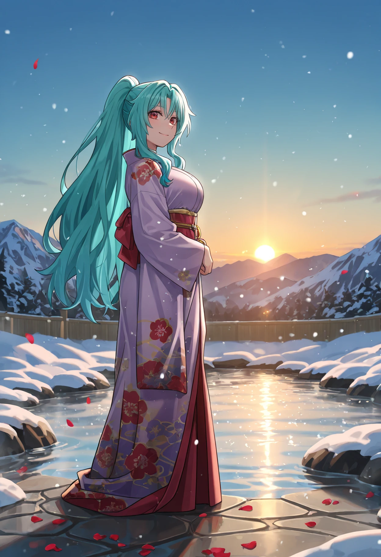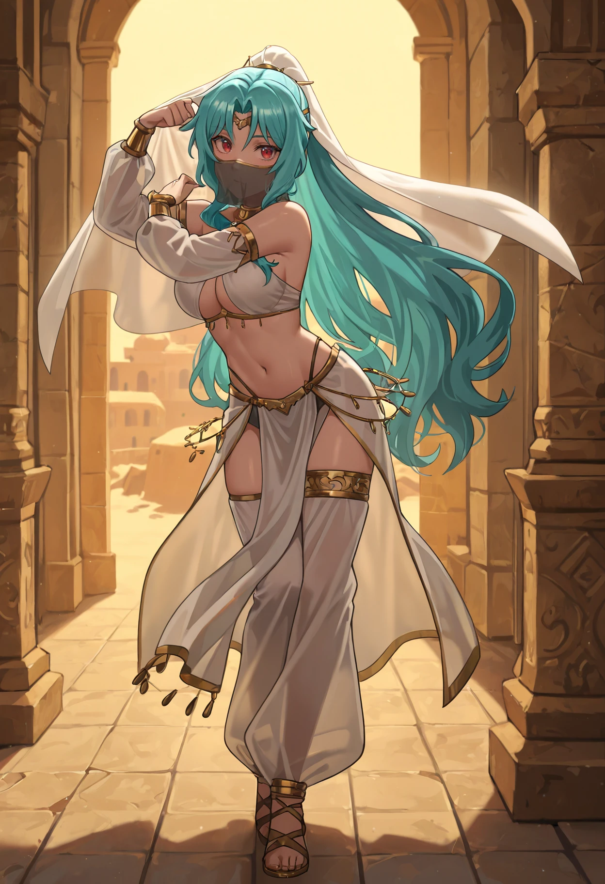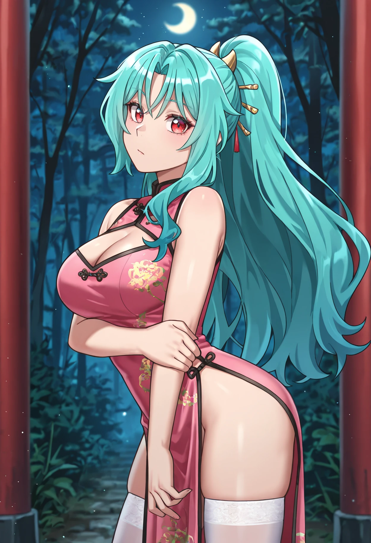 tomoexl, red eyes, aqua hair, ponytail, long hair