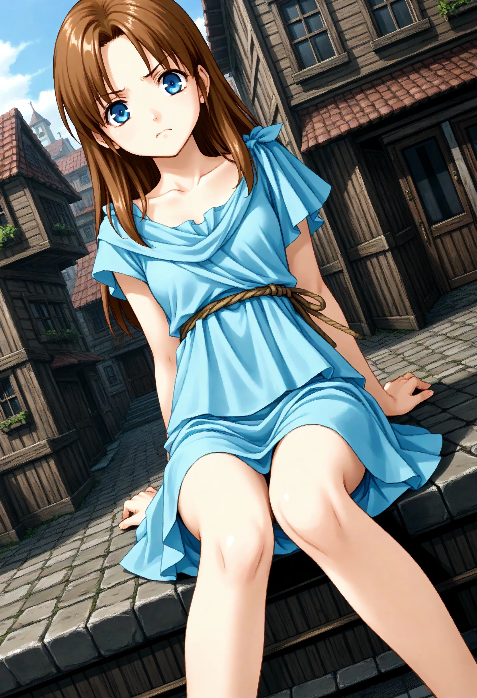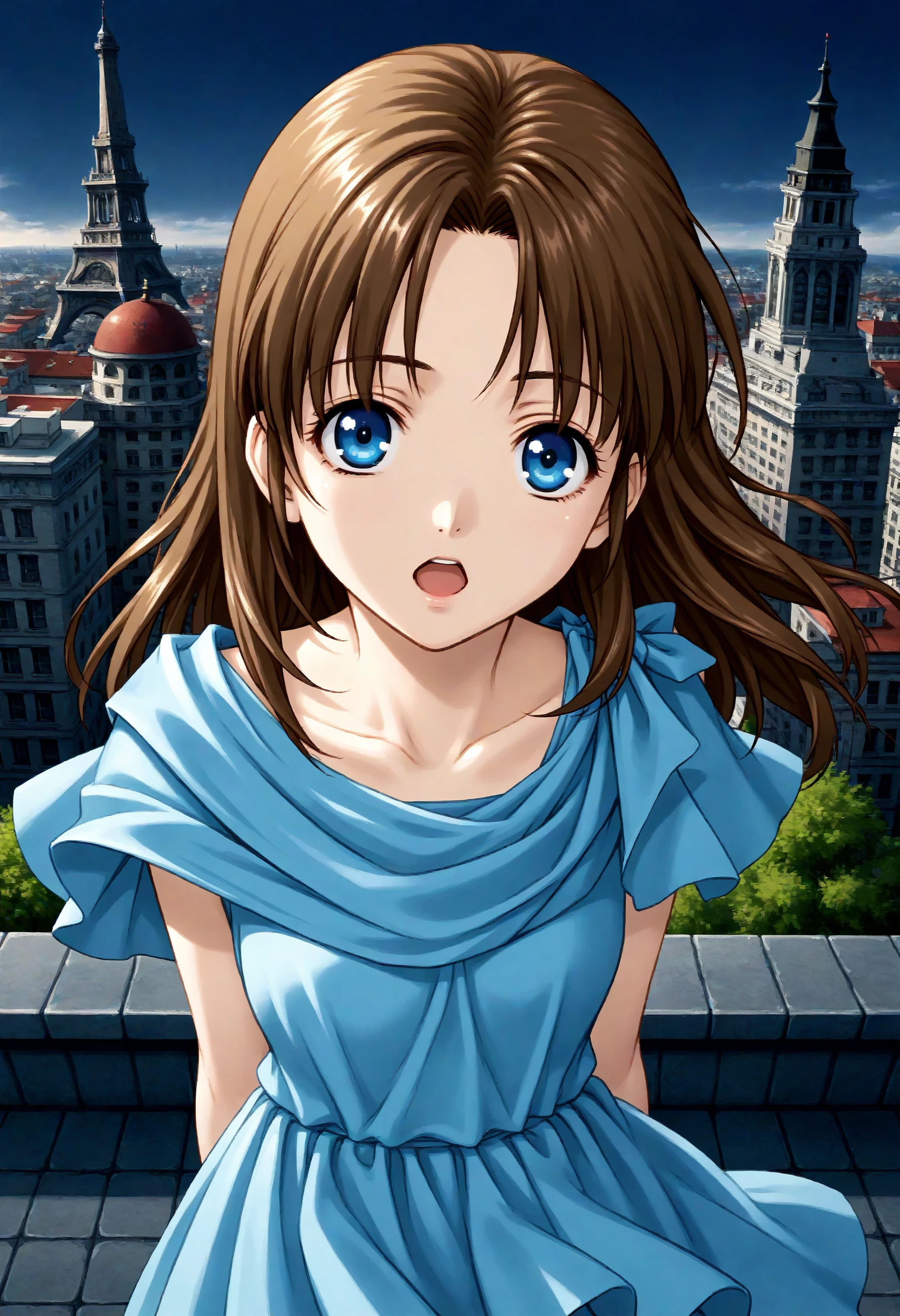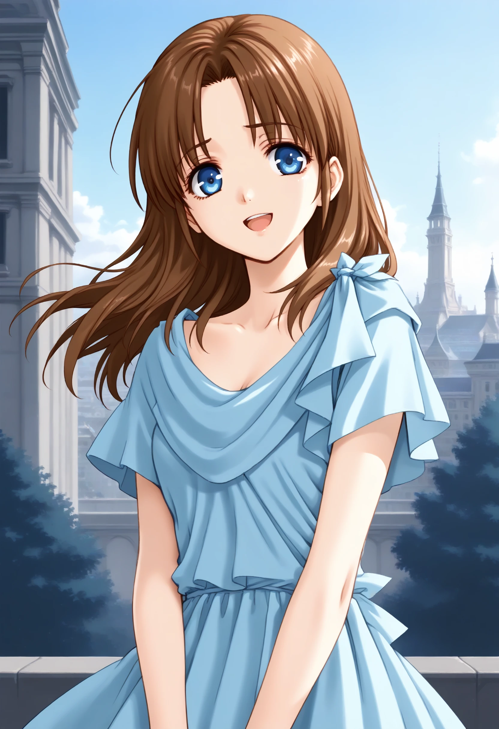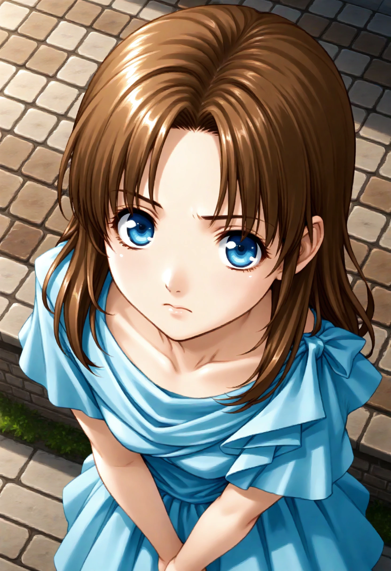 If it is not stable, please add brown hair, long hair, blue eyes, blue dress.