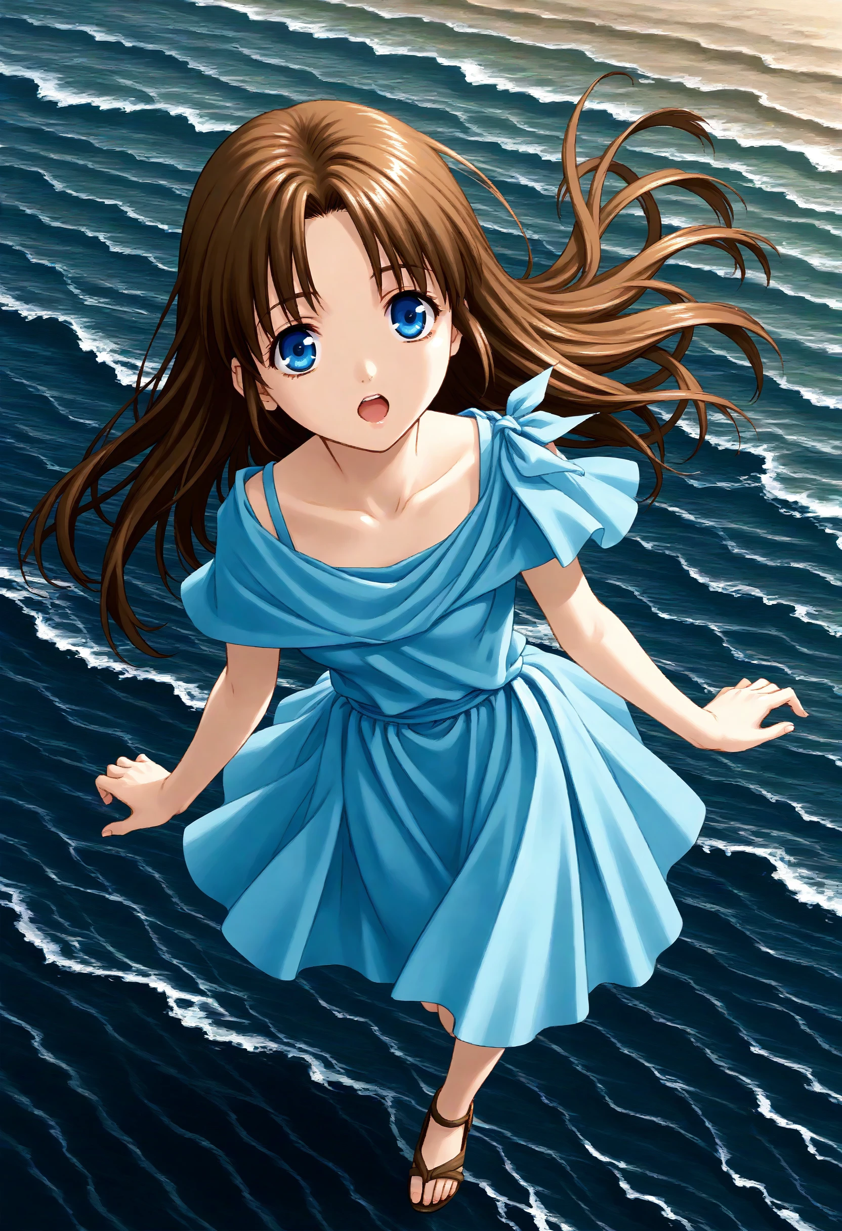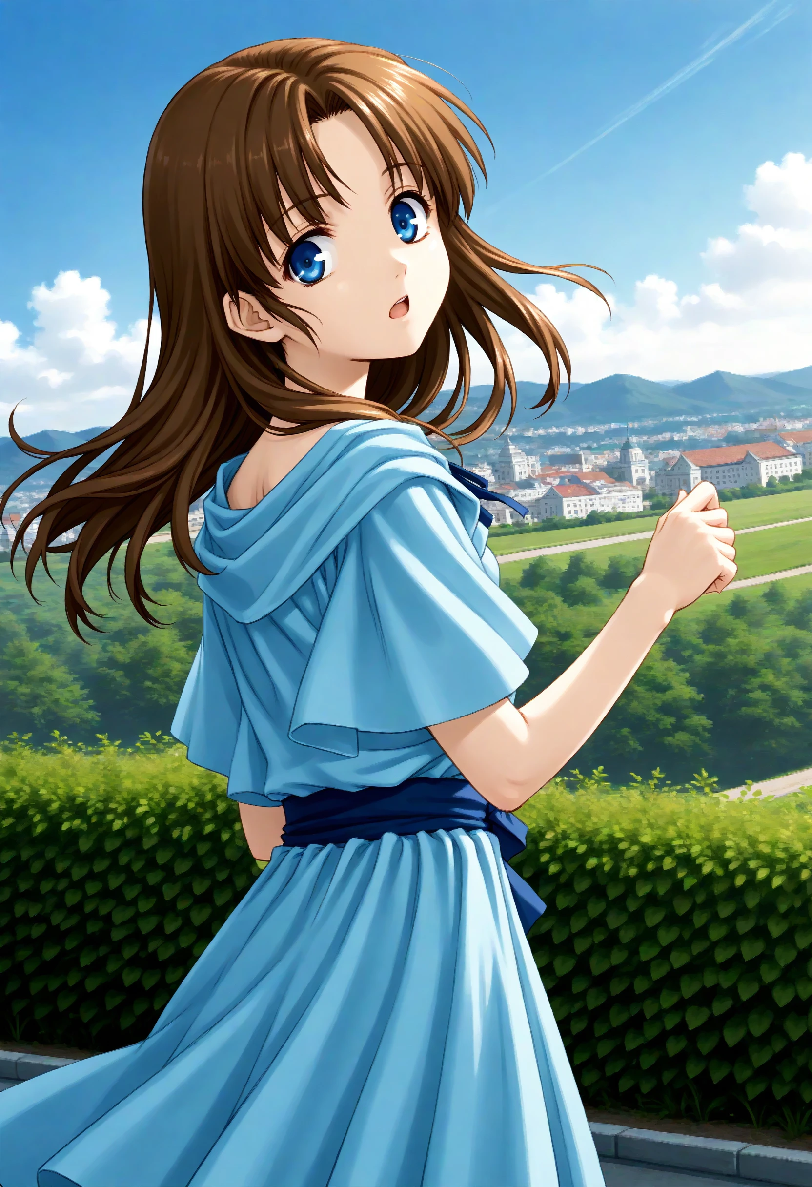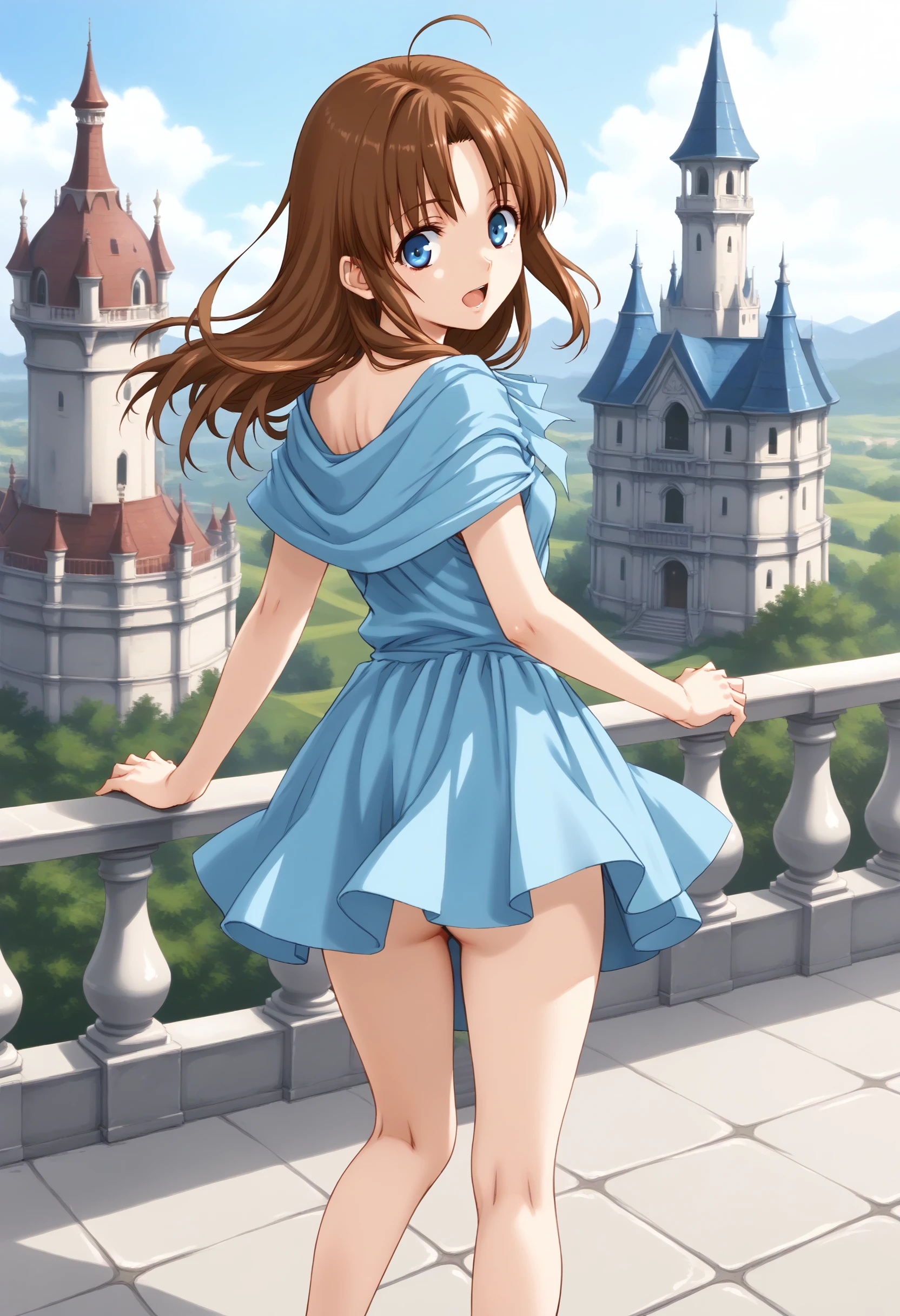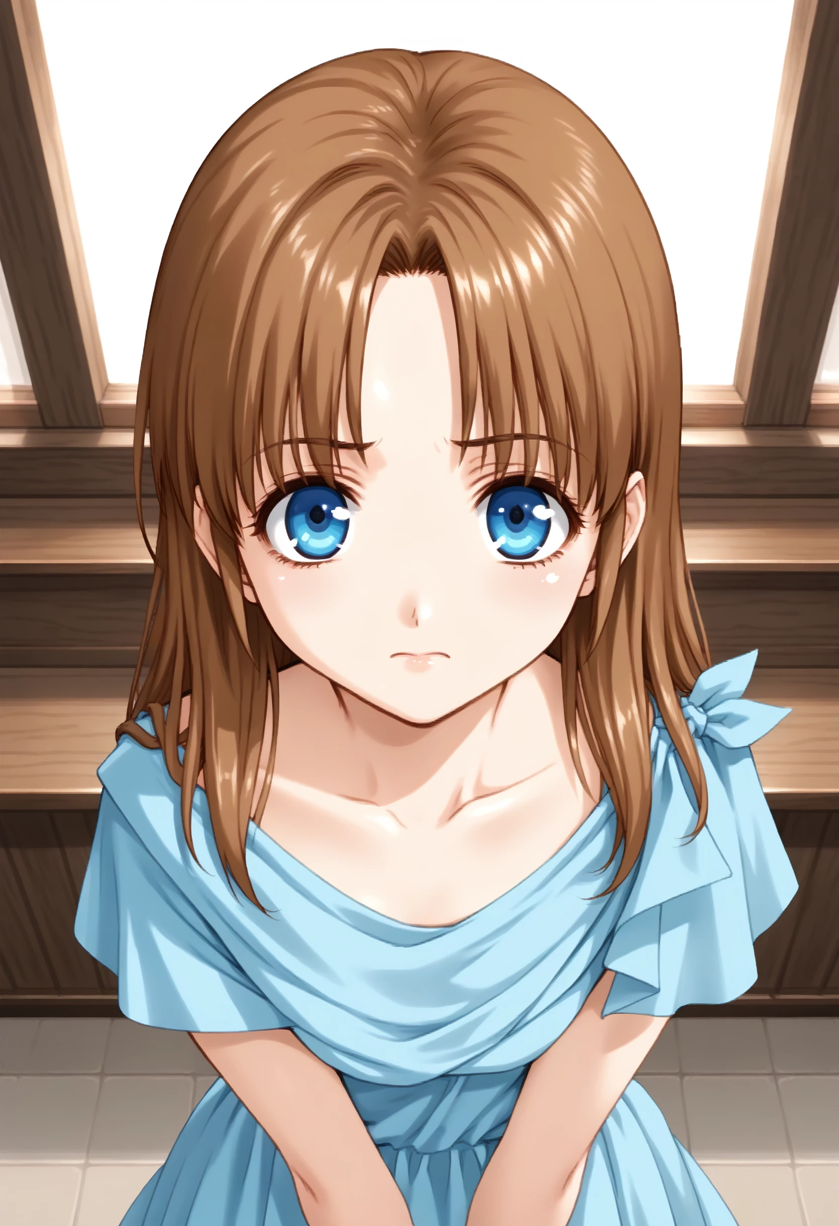 If it is not stable, please add brown hair, long hair, blue eyes, blue dress.