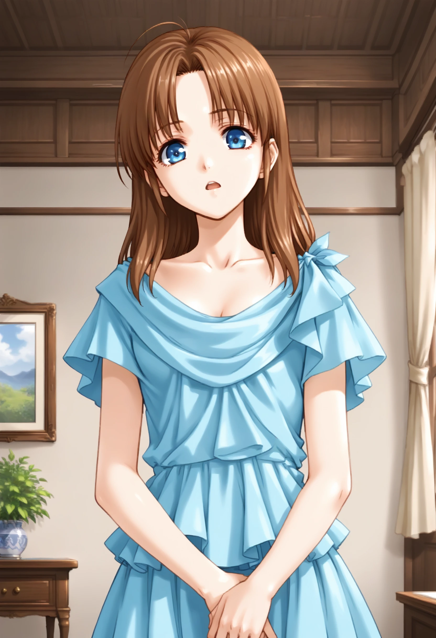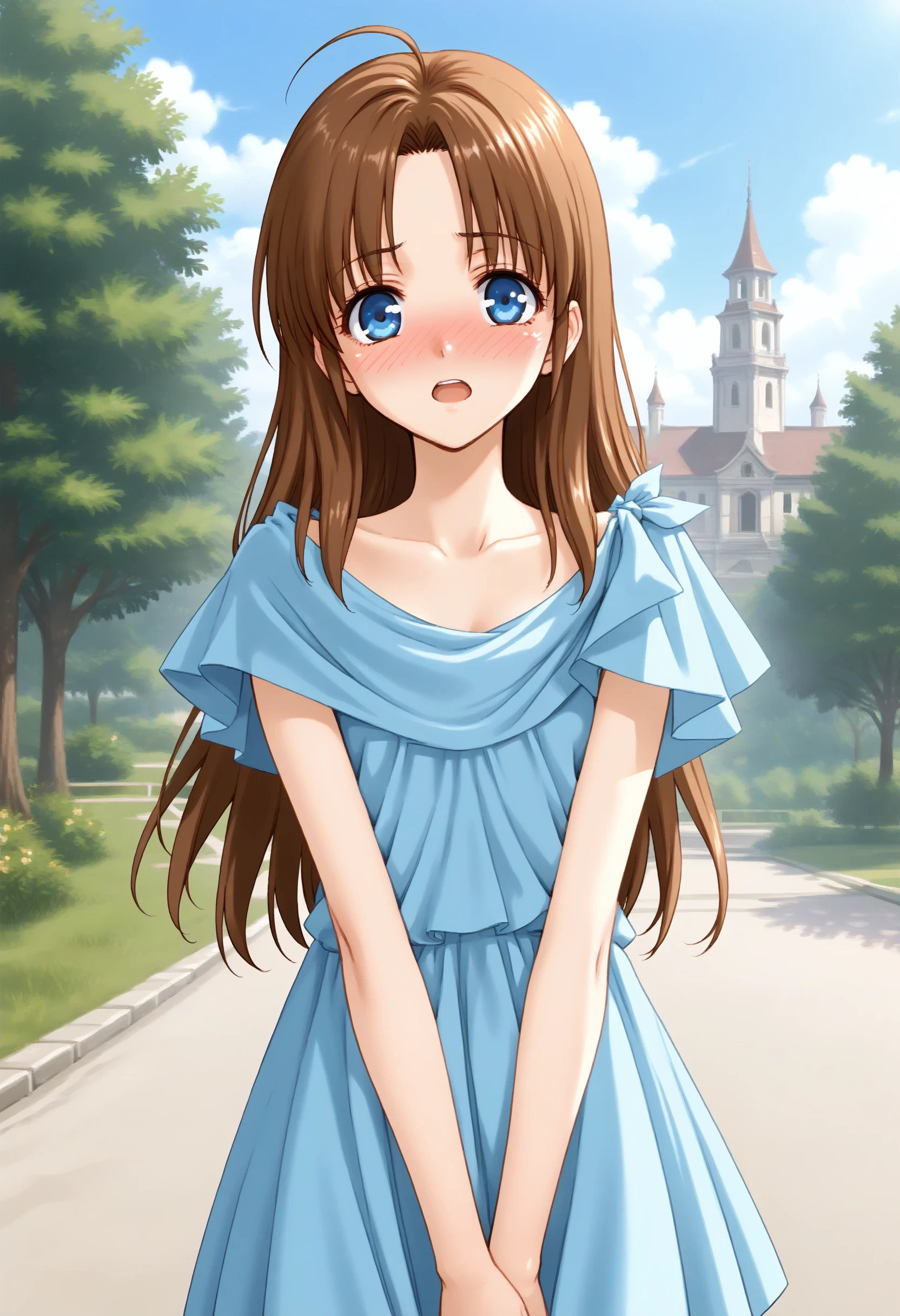 ??しない場合は brown hair, long hair, blue eyes, blue dress を入れて下さい。