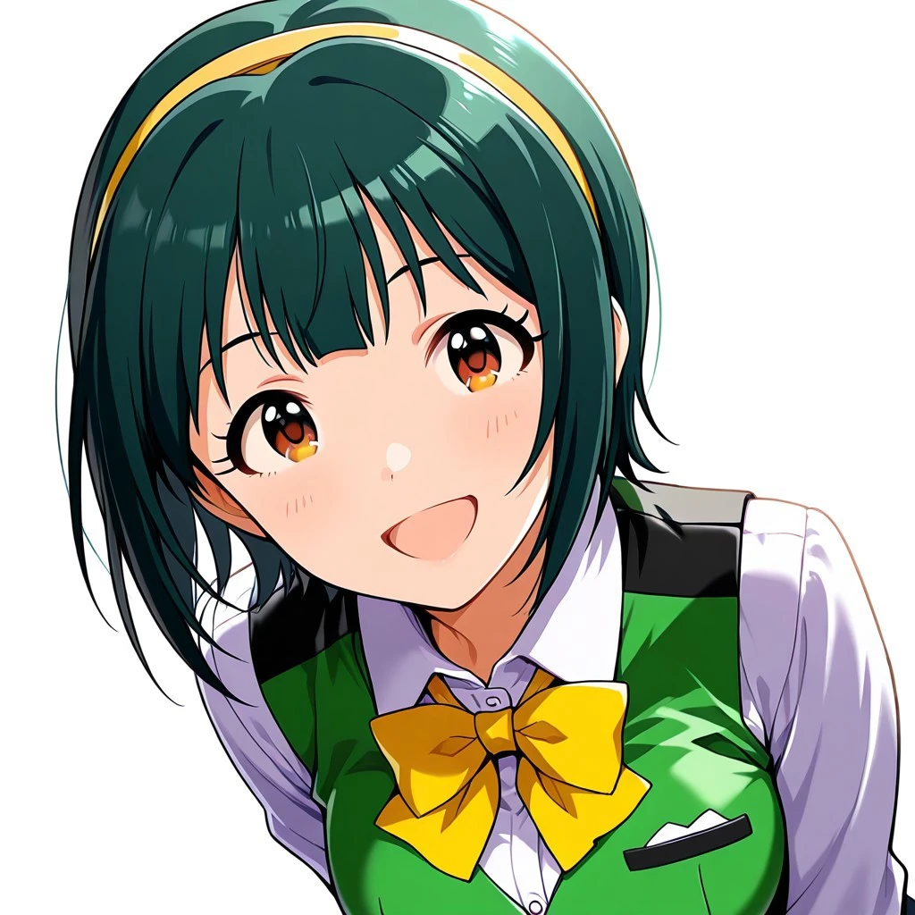 dark green hair,very short hair,bangs,brown eyes,hairband,yellow band,medium breasts
