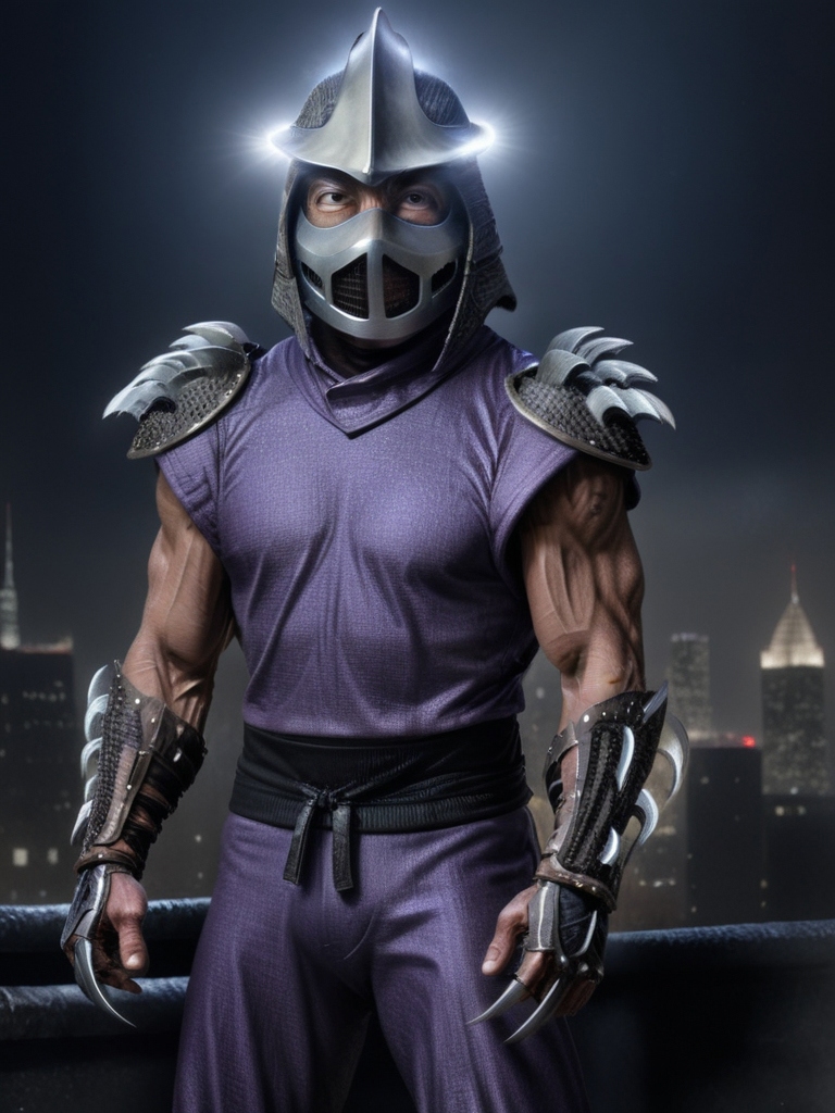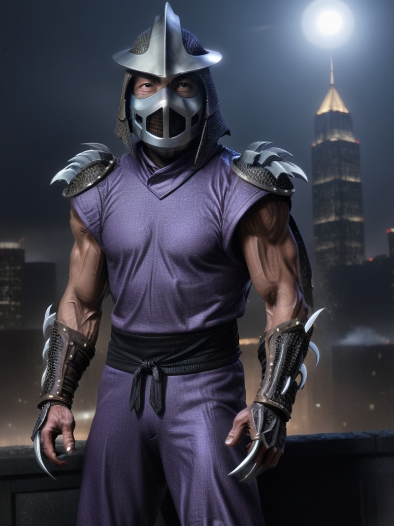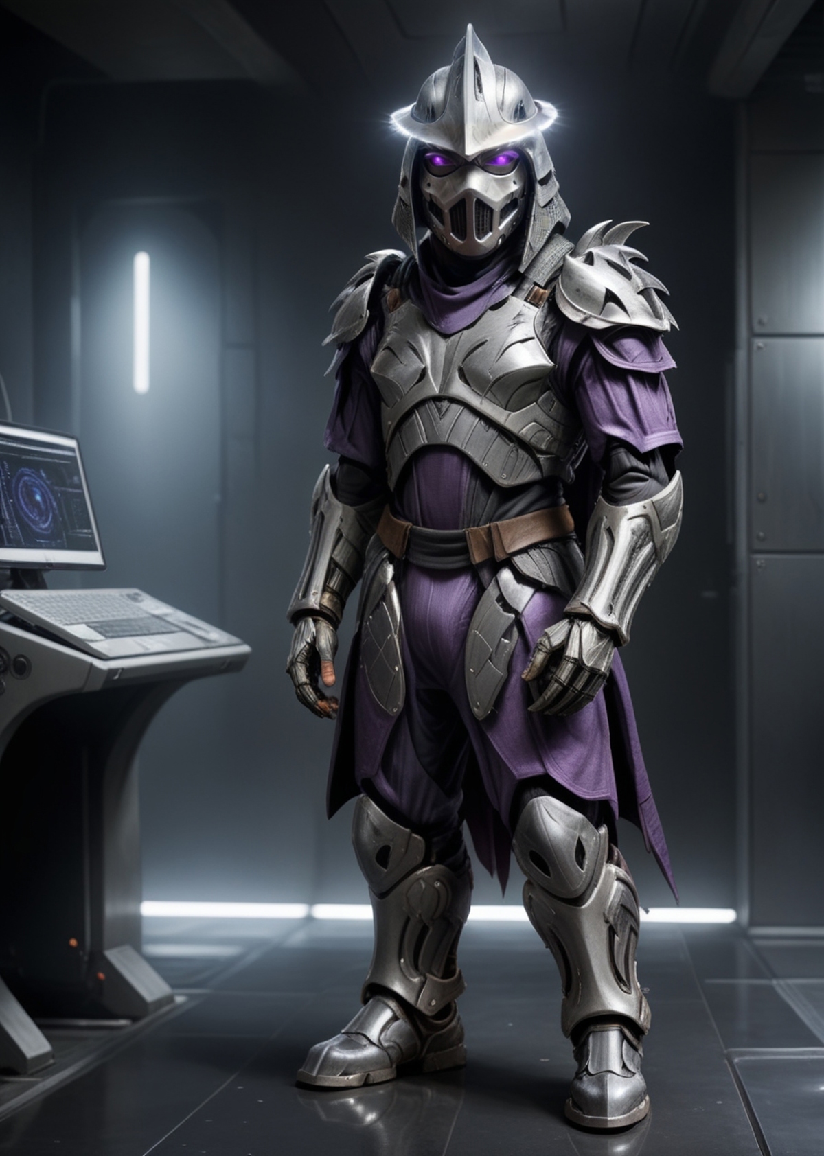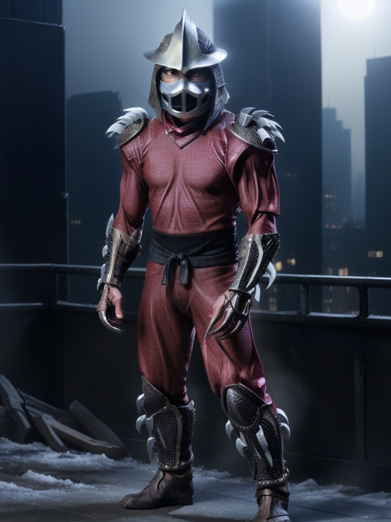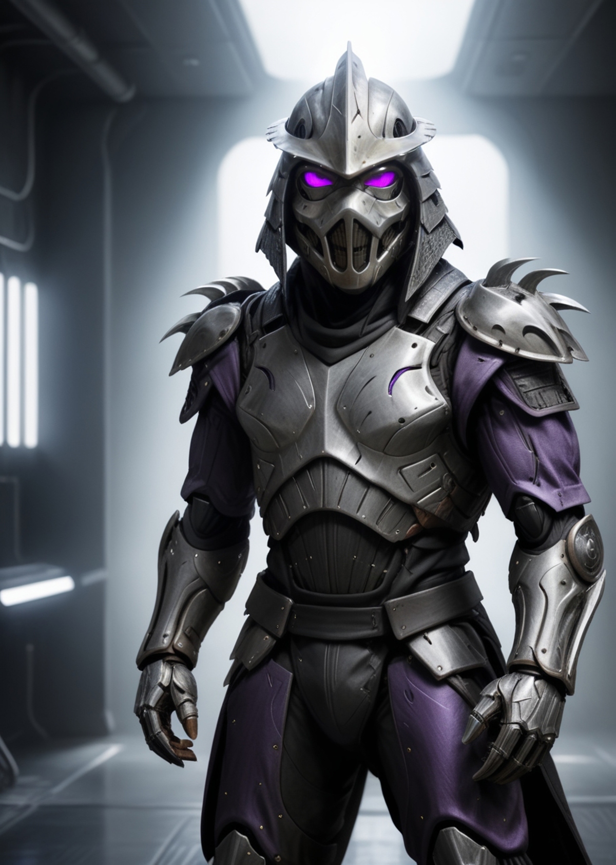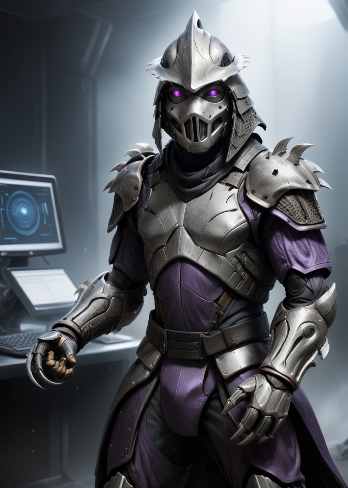 Depending on what your desire for outfit "a TMNTShredder 1man armored samurai knight with claw gauntlets, wearing a purple/red-purple outfit with pauldrons and metal samurai helmet with mask" (exchange purple or red-purple for whichever style you prefer, or exclude the highlighted text entirely to get more artistic variations of the outfit).