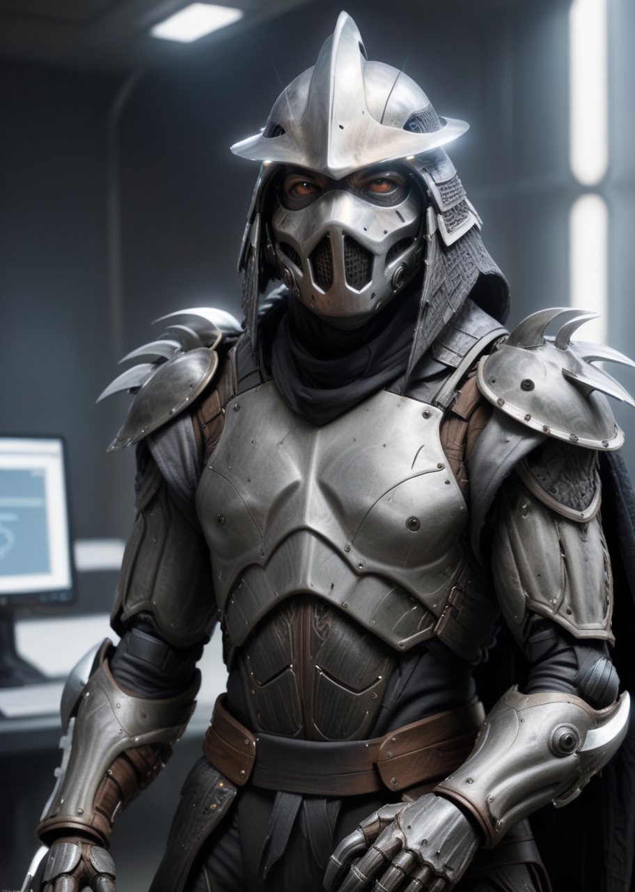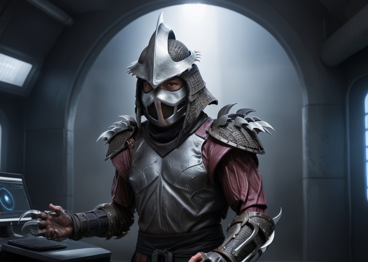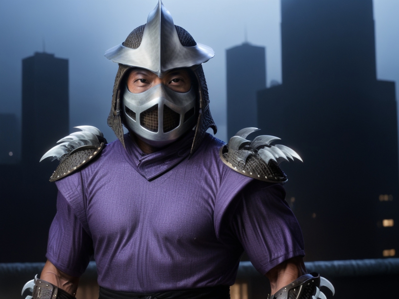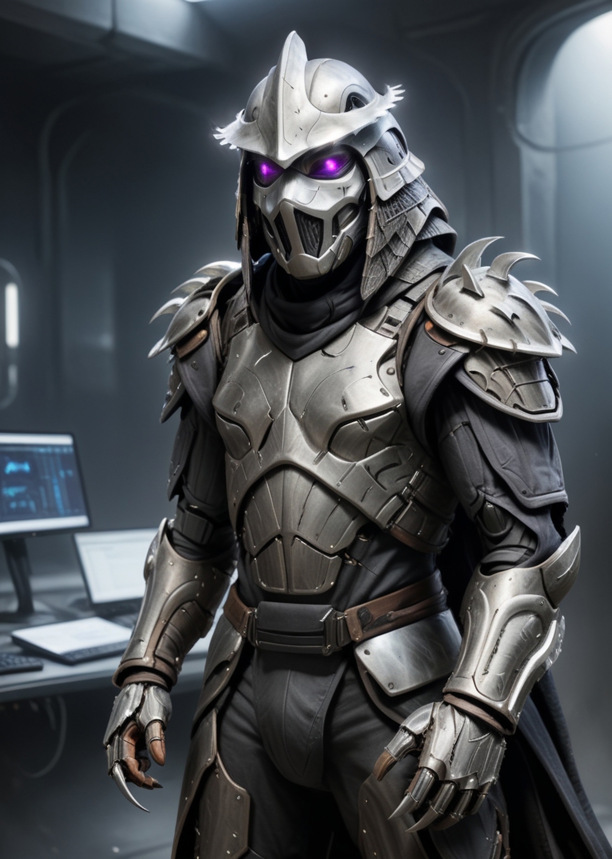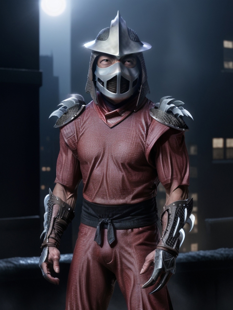 Depending on what your desire for outfit "a TMNTShredder 1man armored samurai knight with claw gauntlets, wearing a purple/red-purple outfit with pauldrons and metal samurai helmet with mask" (exchange purple or red-purple for whichever style you prefer, or exclude the highlighted text entirely to get more artistic variations of the outfit).