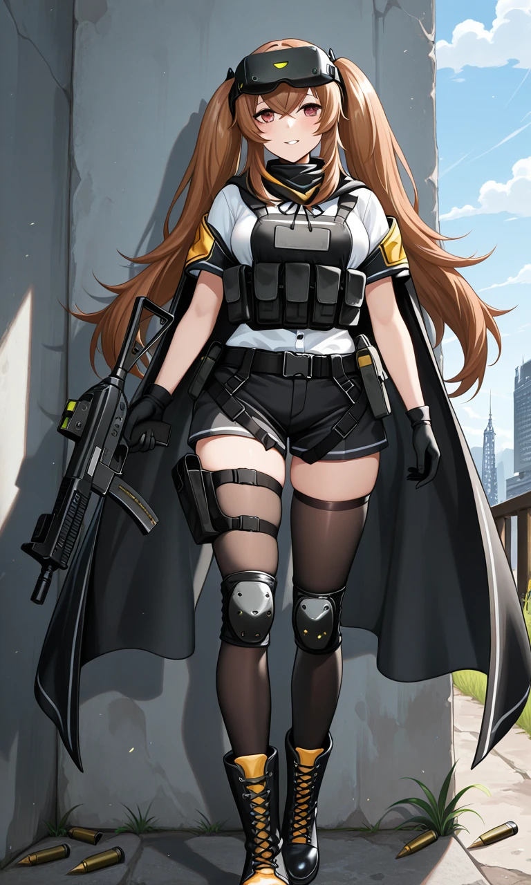 lenna ump9, twintails, type2, thighhighs, knee pads, shorts, single knee pad, tactical clothes, ammunition pouch, head-mounted display, black shorts, boots, black gloves, pouch, magazine \(weapon\), cape, short sleeves,