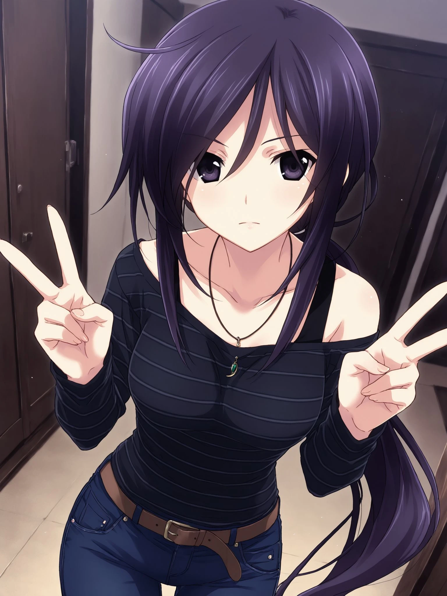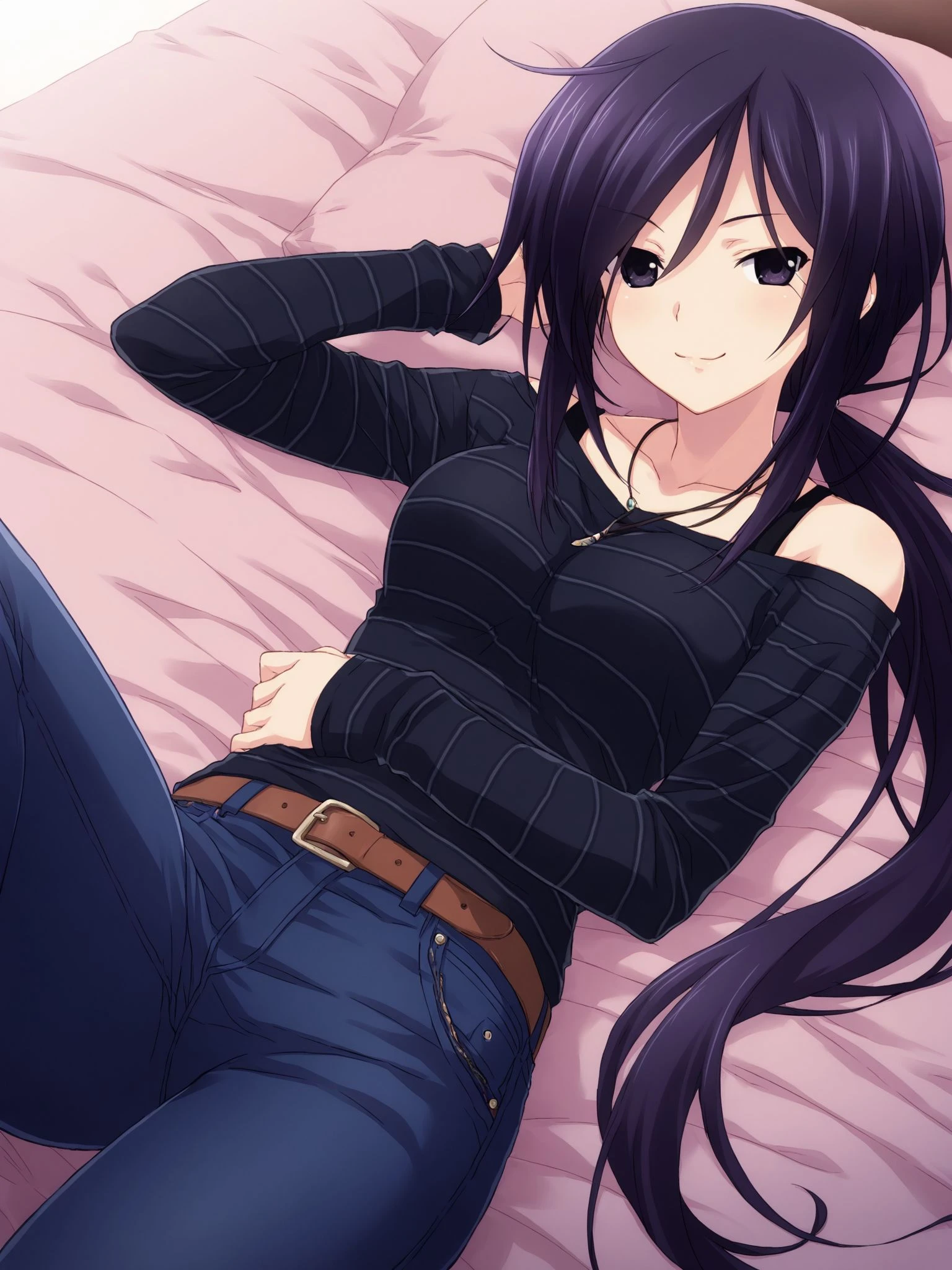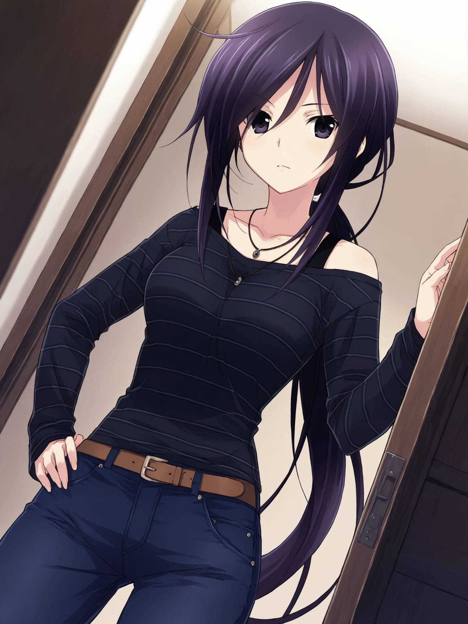 striped shirt,black shirt,off shoulder,long sleeves,necklace,blue pants,denim,jeans,belt,