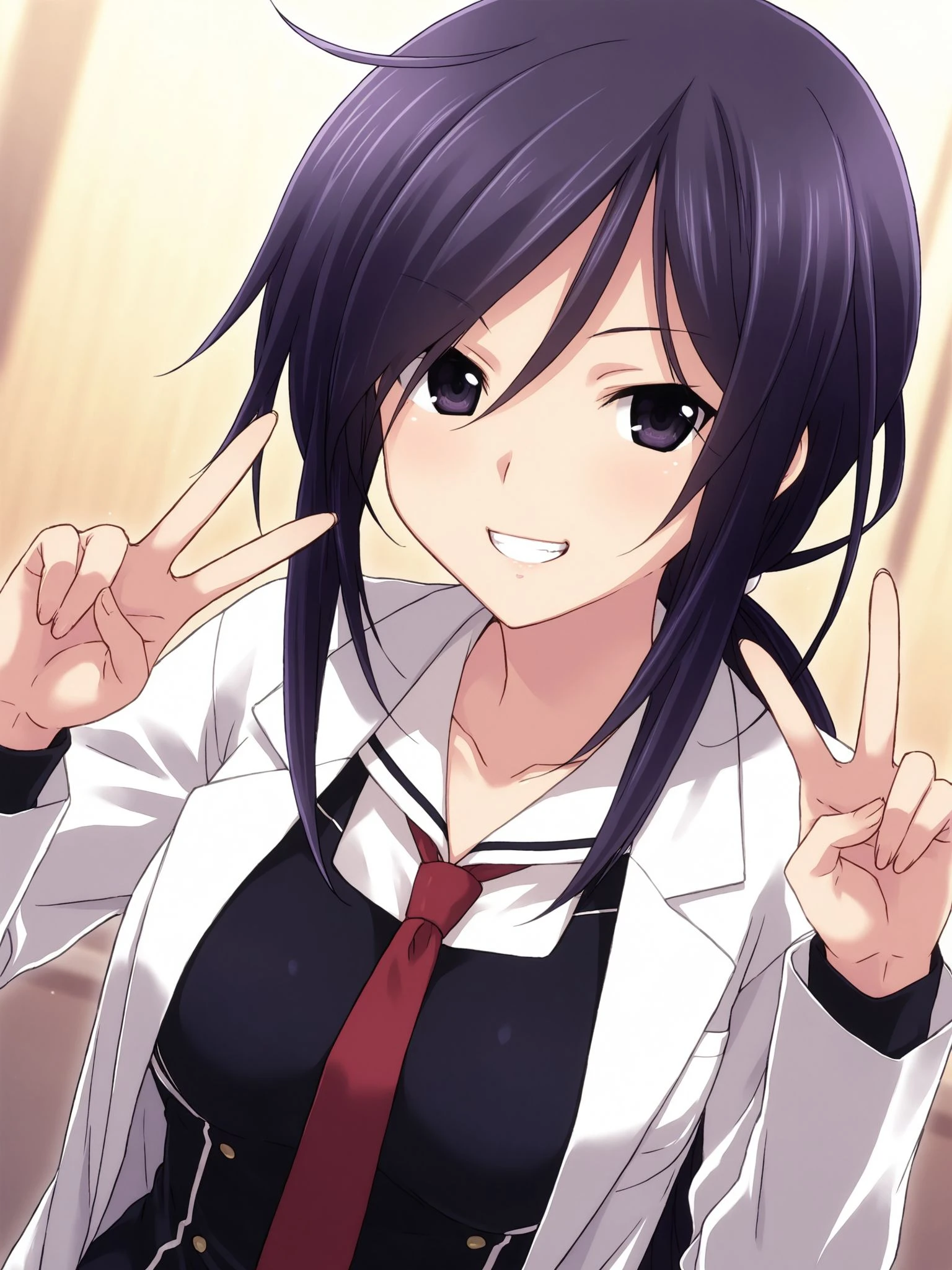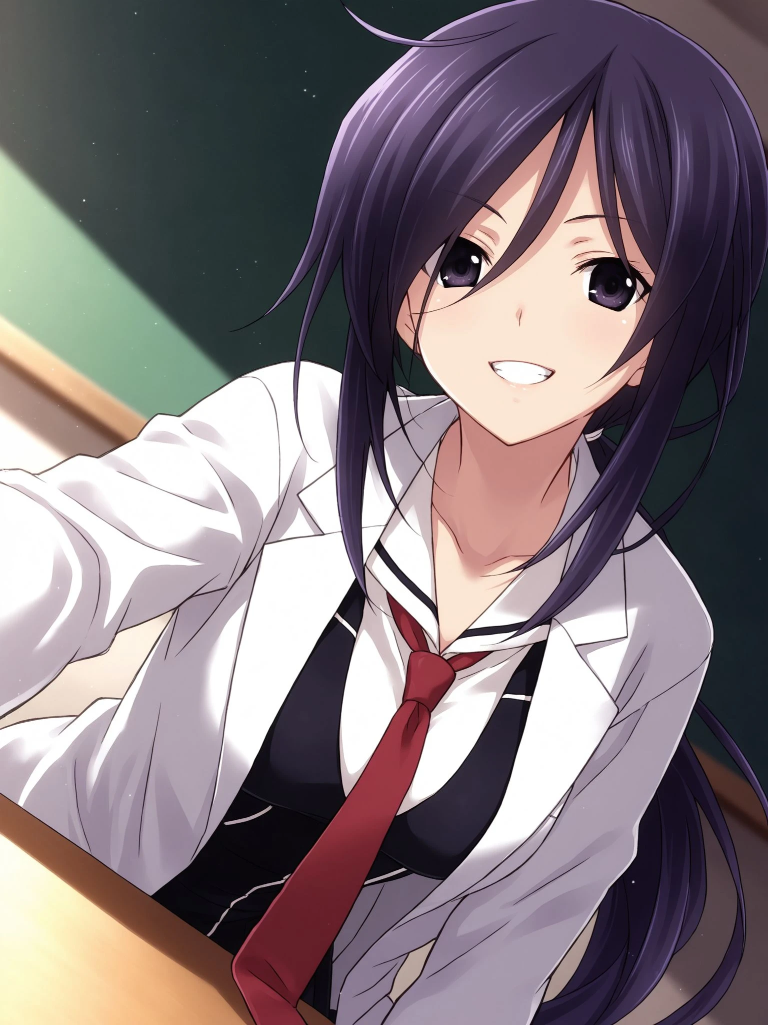 cckunosato,low ponytail,long hair,purple hair,black hair,hair between eyes,purple eyes,black eyes,medium breasts,