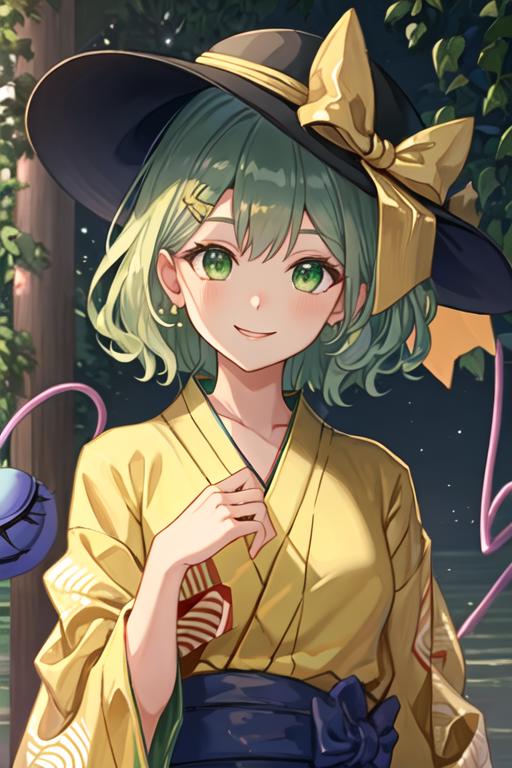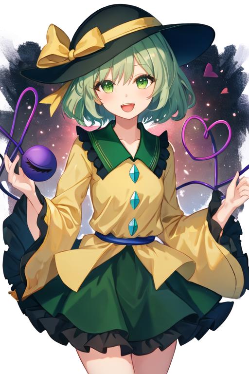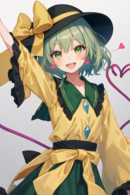 The trigger word is komeiji_koishi_touhou, and the recommended tags are best quality, masterpiece, highres, solo, {komeiji_koishi_touhou:1.15}, third_eye, hat, green_eyes, black_headwear, short_hair, green_hair, ribbon, smile, bow, upper_body, heart, bangs, hat_ribbon, hat_bow, hair_between_eyes.