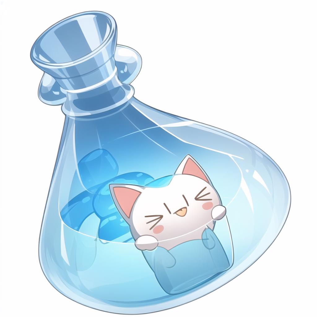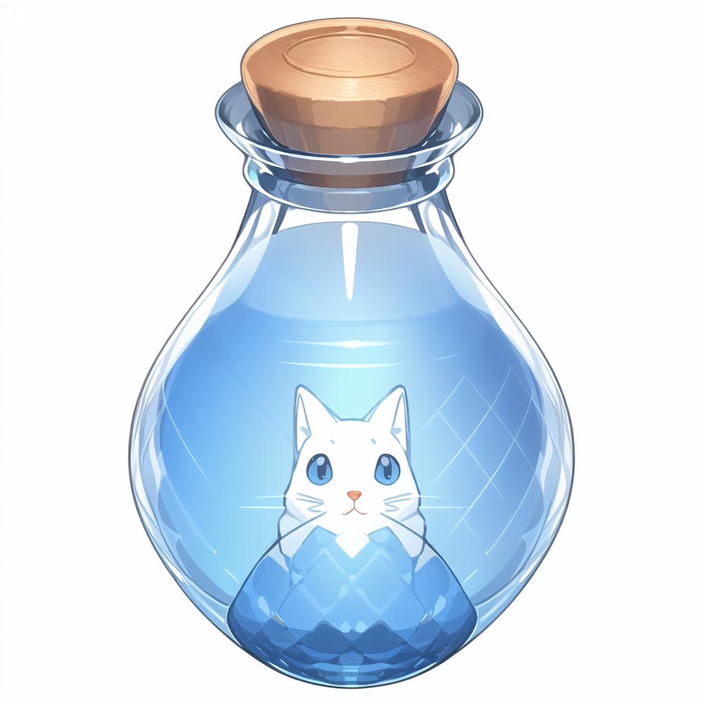 Kitten shaped bottle, game bottle, beautiful pattern, no person, still life, transparent, white background, reasonable structure, game icon, (2d),<lora:Gameiconresearch_bottle3:0.6>