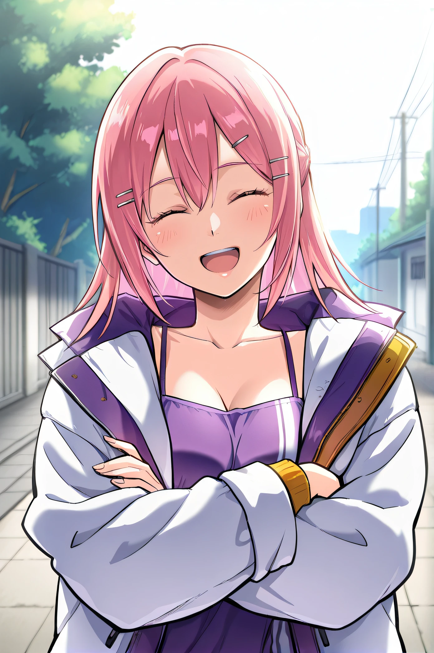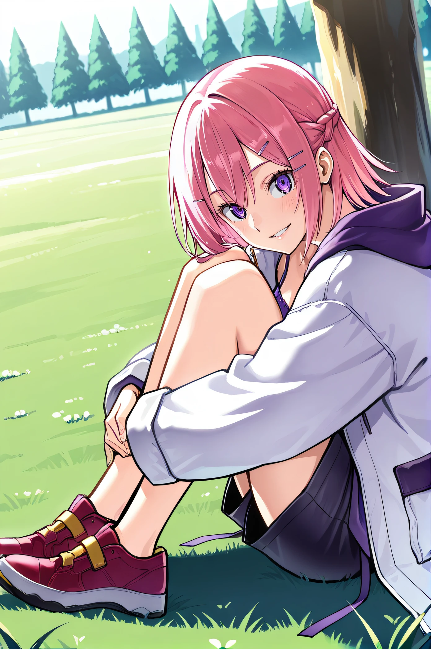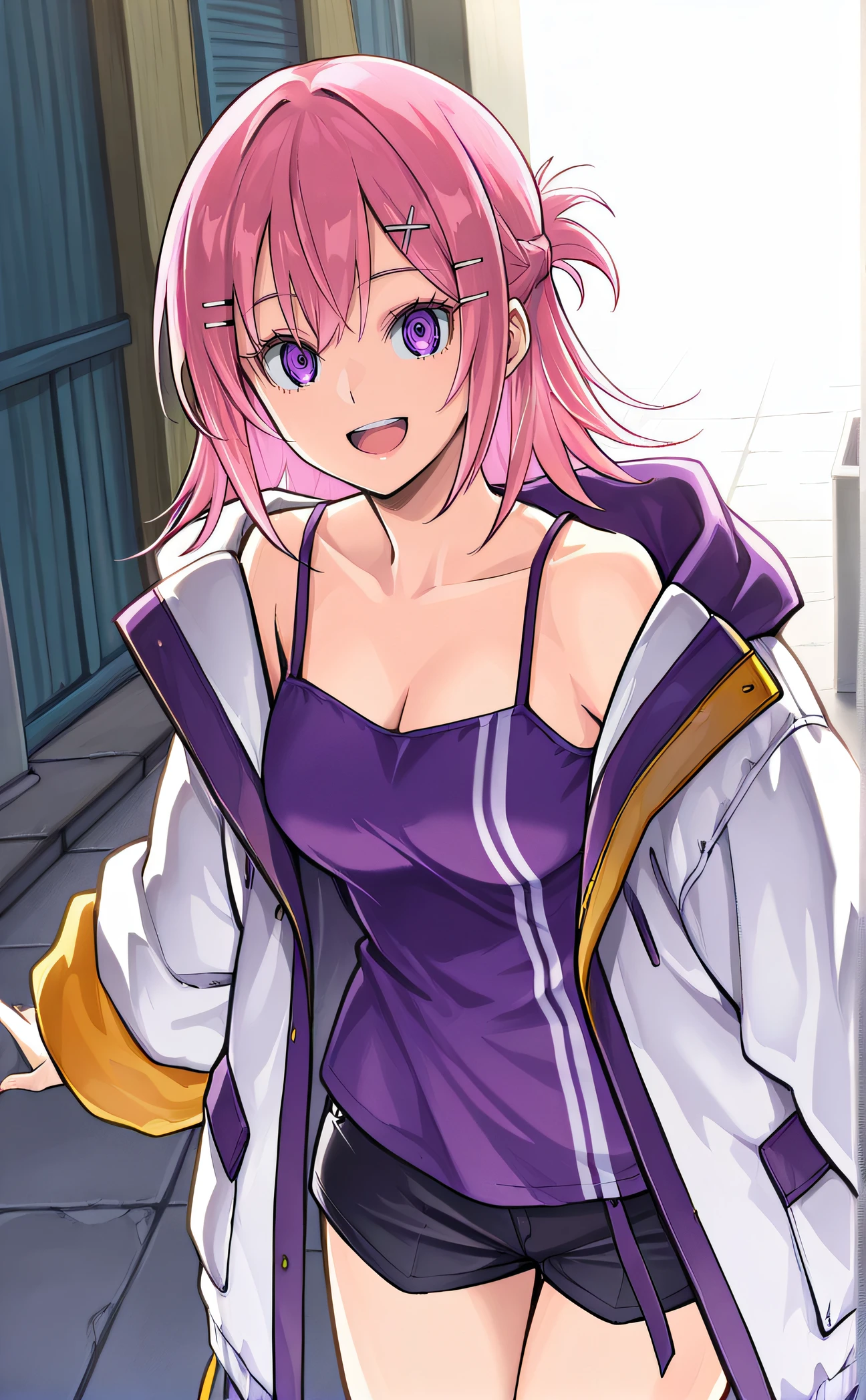 yuuki, pink hair, hairclip, short hair, braid, purple eyes, purple camisole, white jacket, long sleeves, black shorts, red shoes