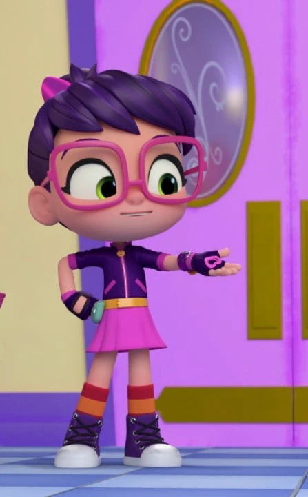 Abby Hatcher, purple hair, short ponytail, pink bow in hair, pink glasses, fingerless gloves, green eyes, purple shoes, striped socks
