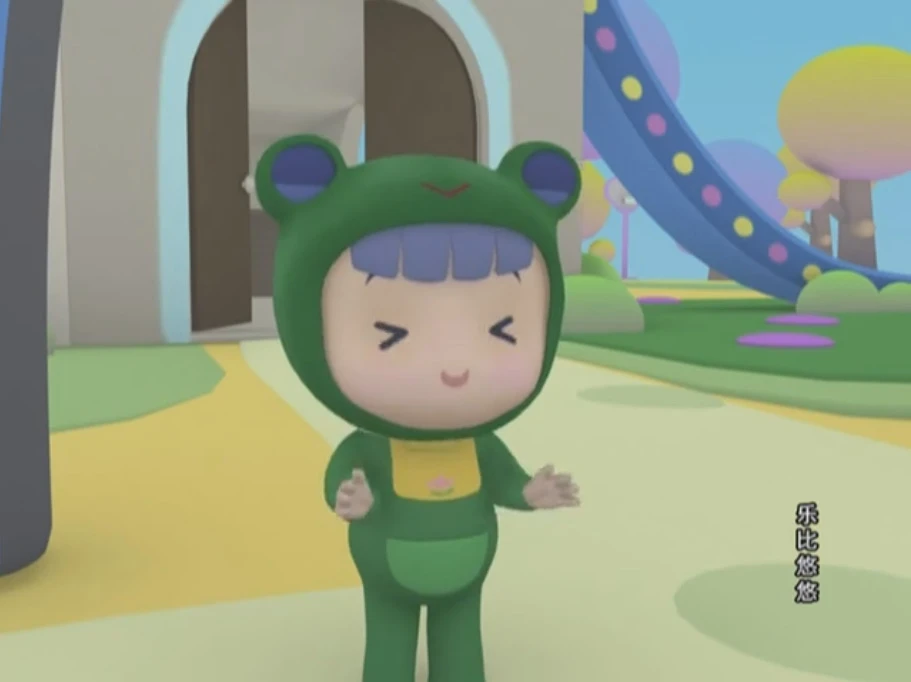Rubi, star, blue hair, black eyes, frog costume, rose lips