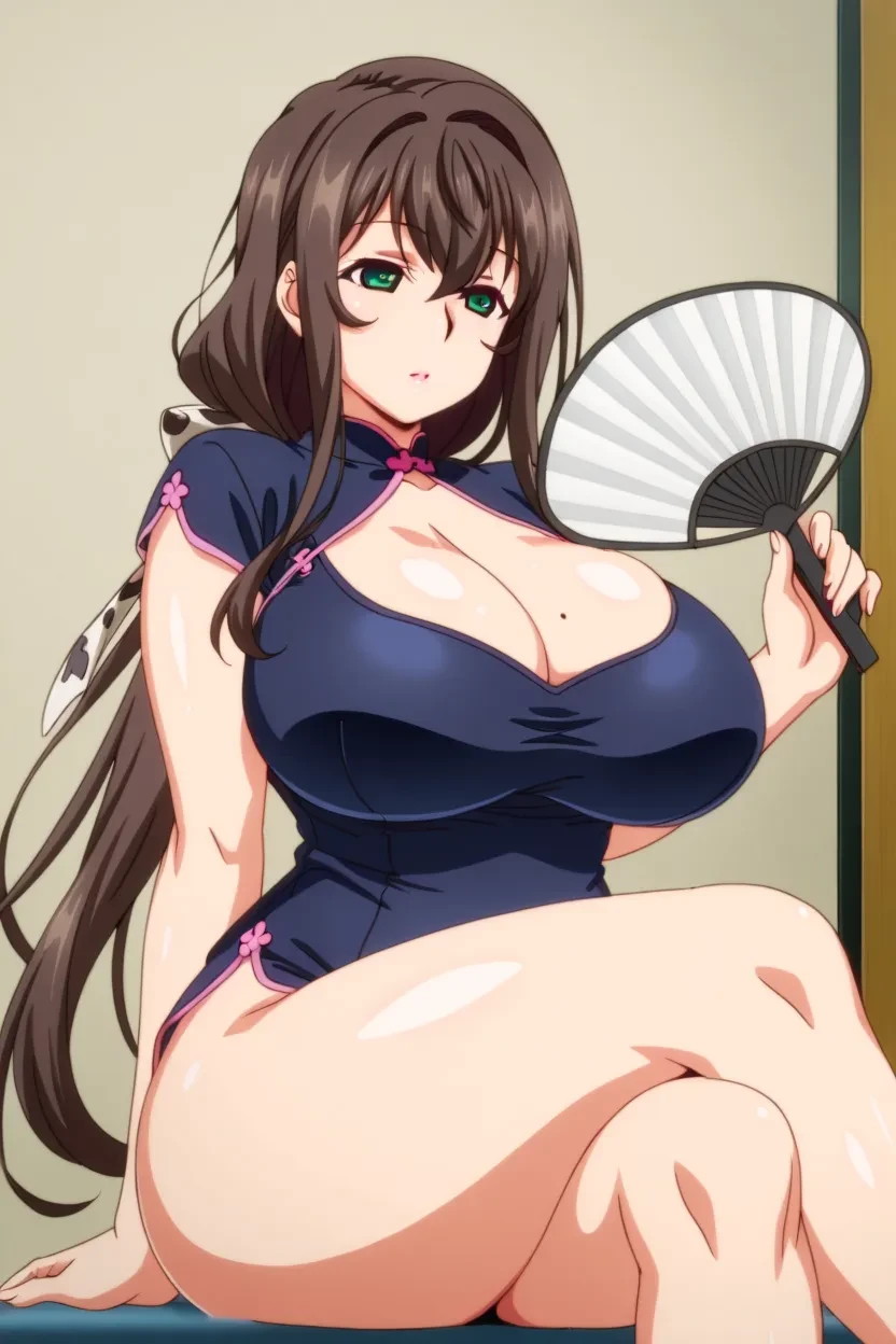 1girl, Kasumi (Tanetsuke Ojisan to NTR Hitozuma ), hair ribbon, long hair, brown hair, green eyes, lips, glossy lips, thick lips, massive breasts, mole on , Tanetsuke Ojisan to NTR Hitozuma _art style, HD, 4k, superb quality, flawless