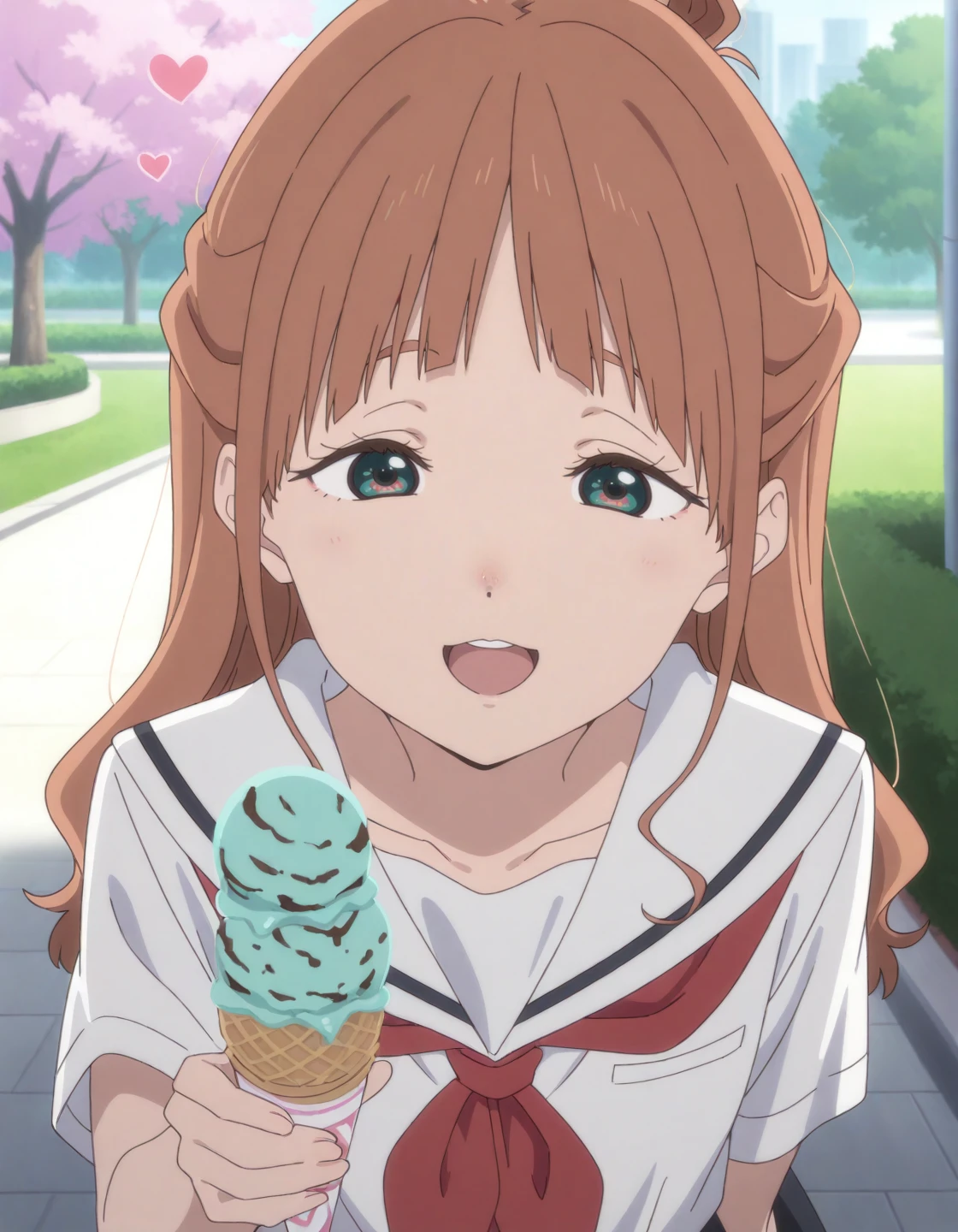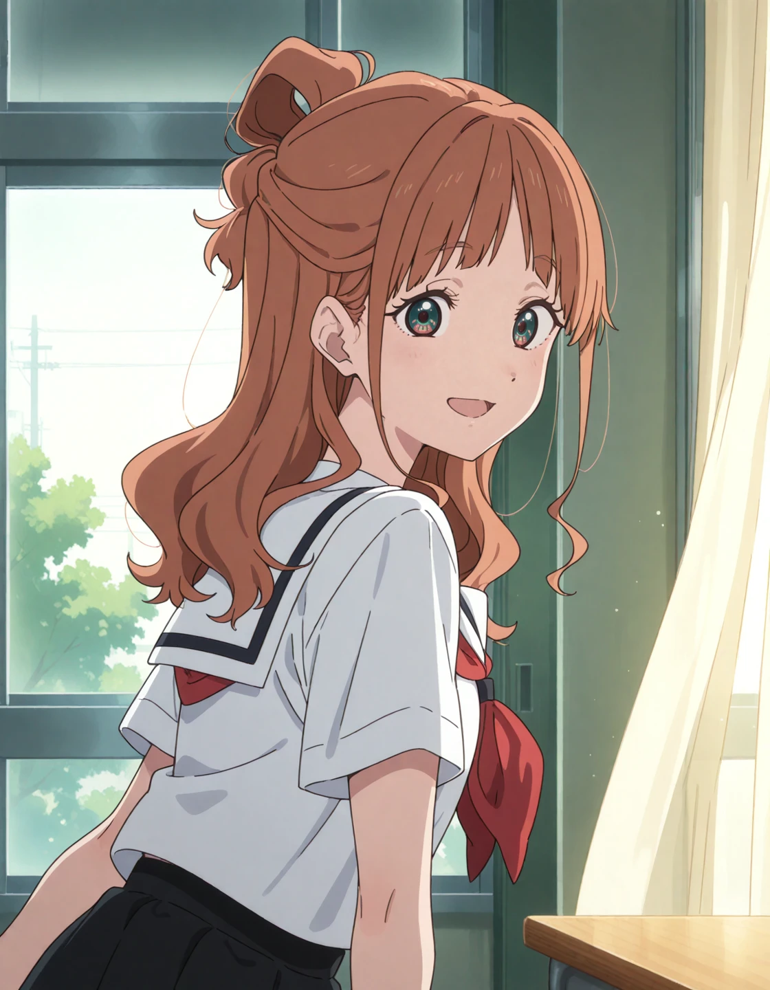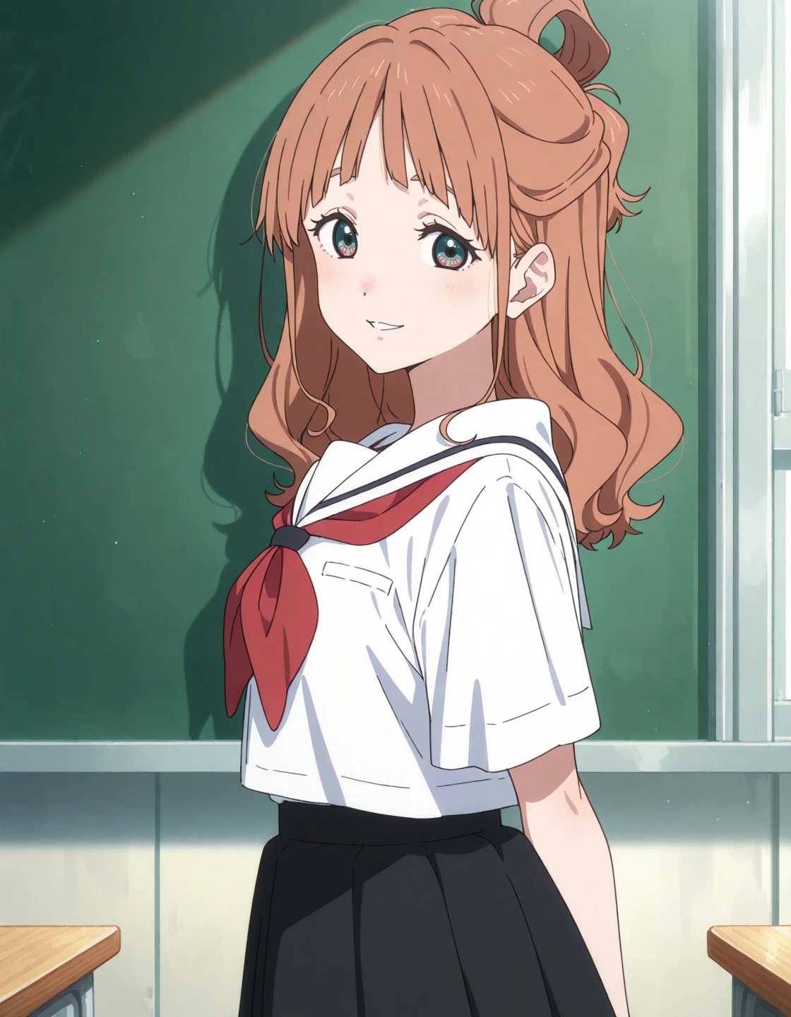 nakamaru tokiko, brown hair, half updo, hair rings, tokiko's eyes, white sailor collar, white shirt, short sleeves, red neckerchief, black skirt, black socks