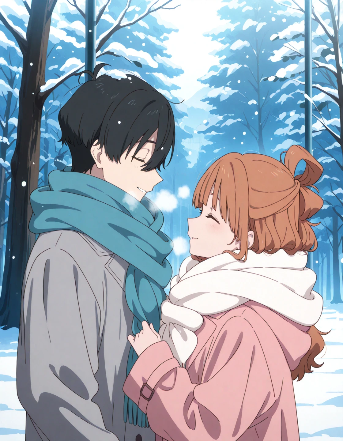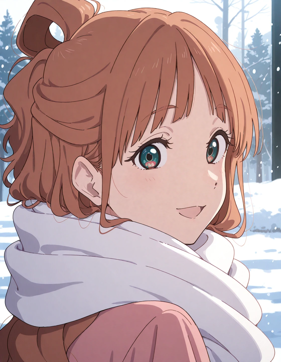 nakamaru tokiko, brown hair, half updo, hair rings, tokiko's eyes, pink coat, white scarf,