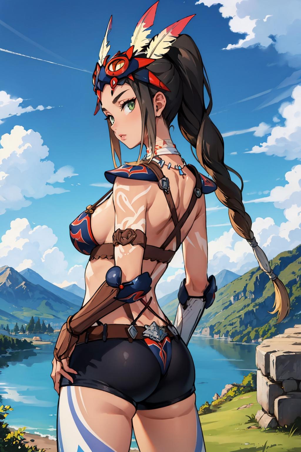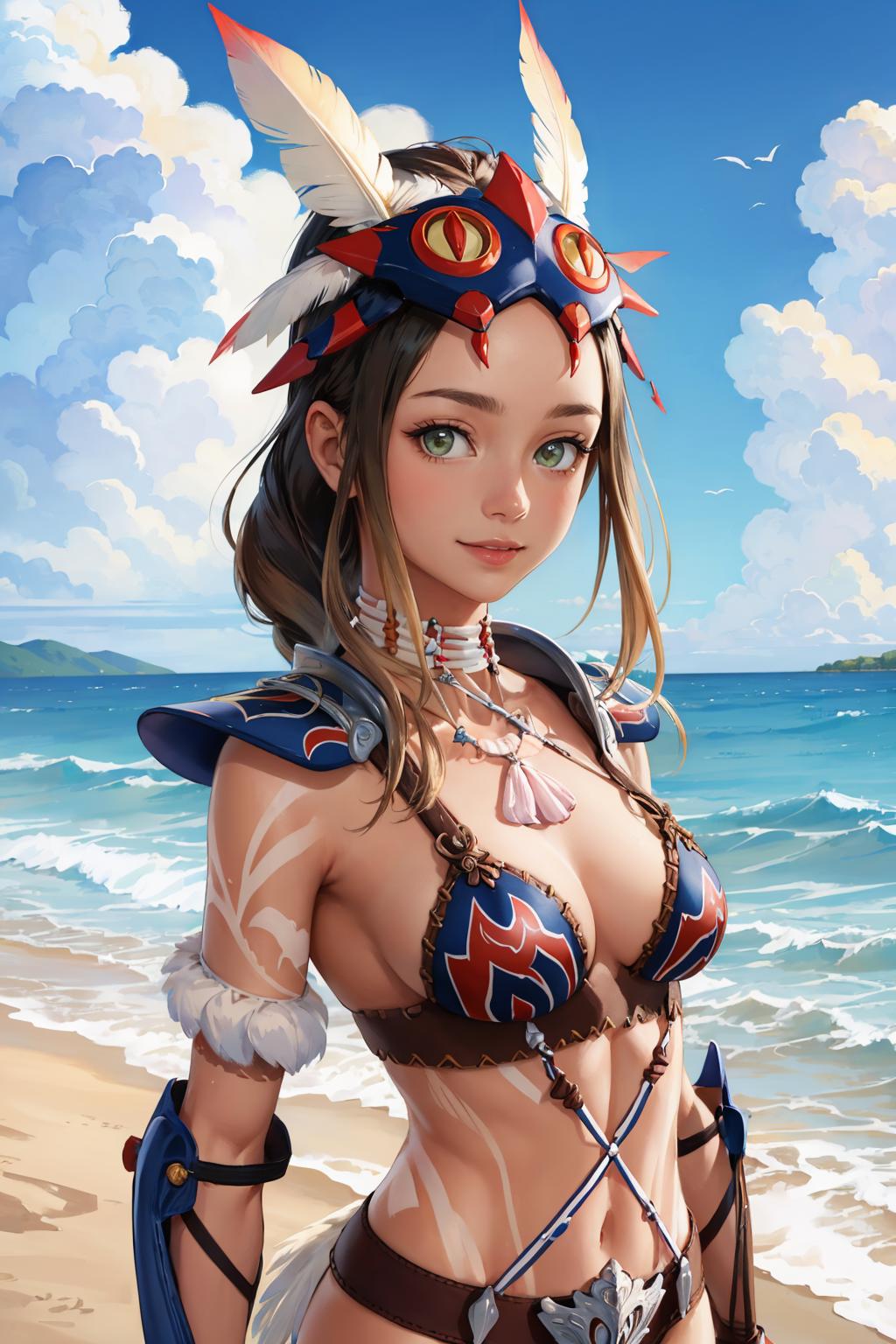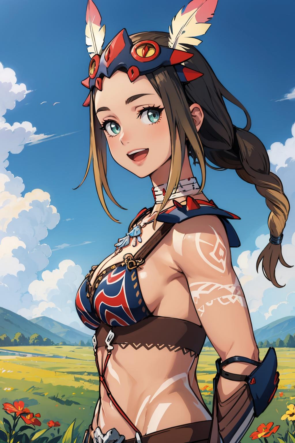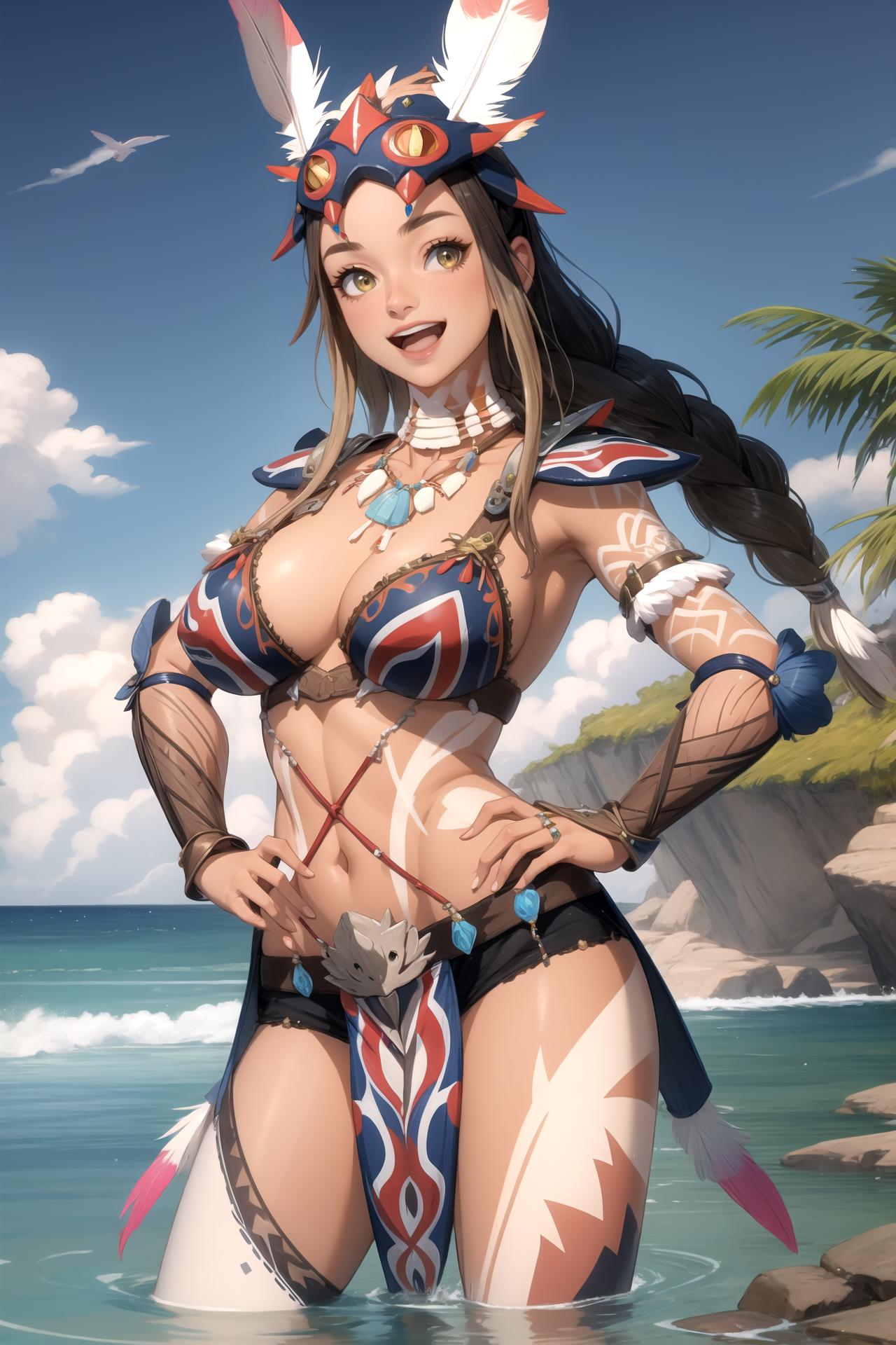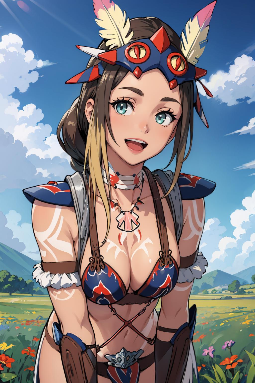 Add "headdress, feathers, necklace, tribal, bikini armor, vambraces, tattoo, bodypaint" for her typical look.