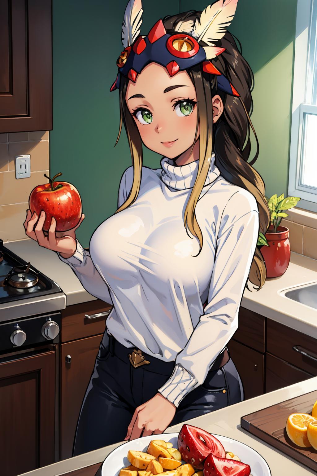 Her skin might come out too light on some models; add "tan" or "dark skin" to help.