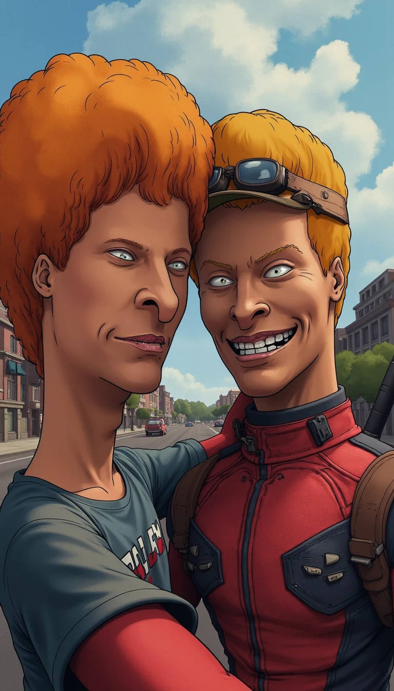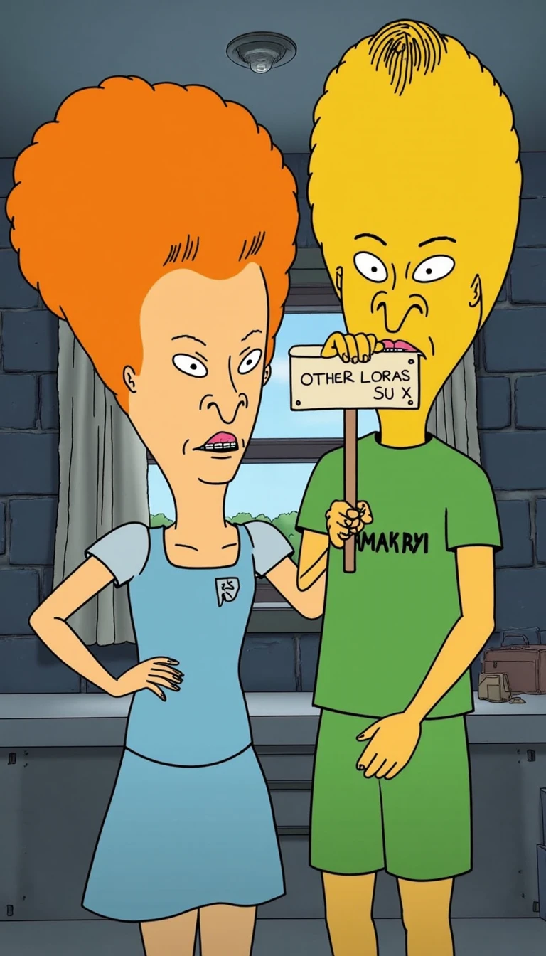 Hey, the 90s called and they ask you to pull your shirt over your head and get some TP for your bunghole Beavis and Butthead lora to take us down memory lane, with the fun of Flux understanding of prompts, trained on 17 images, AI-toolkit, default values