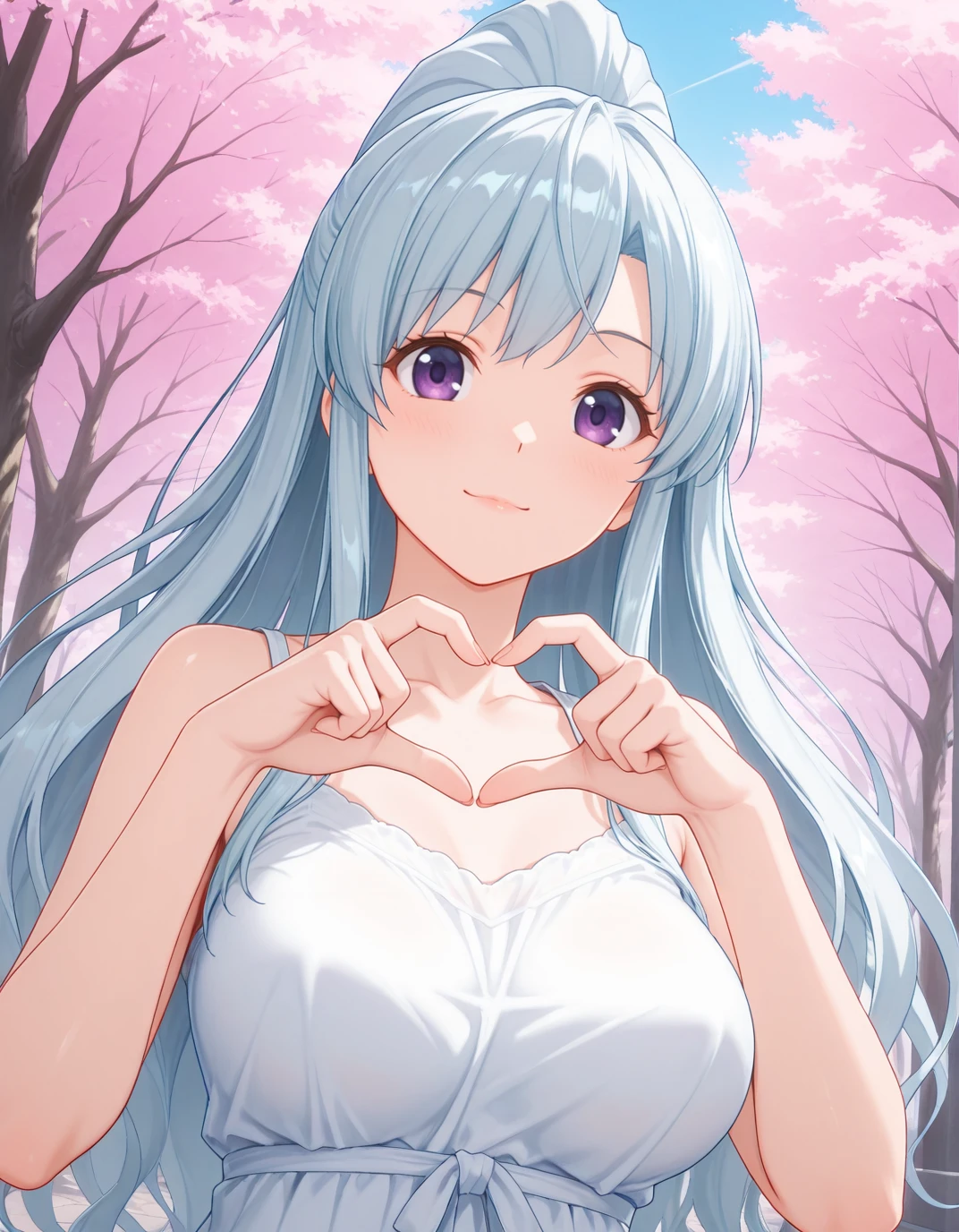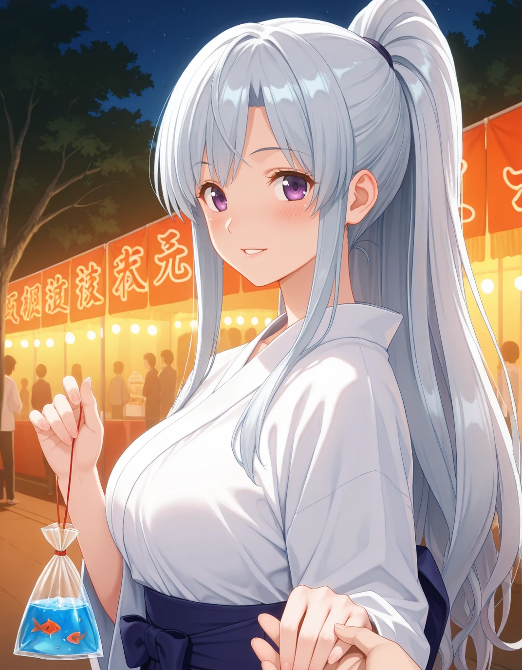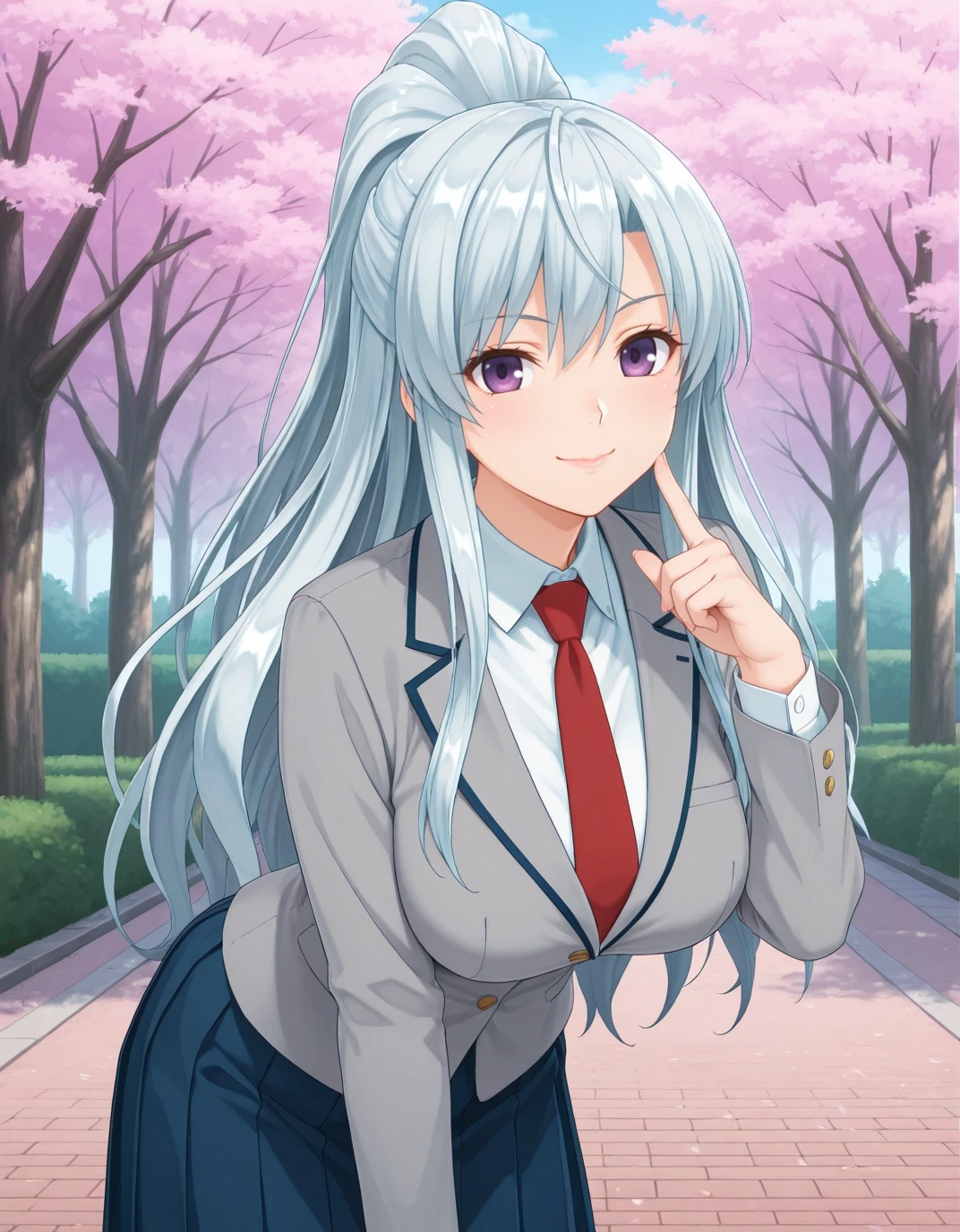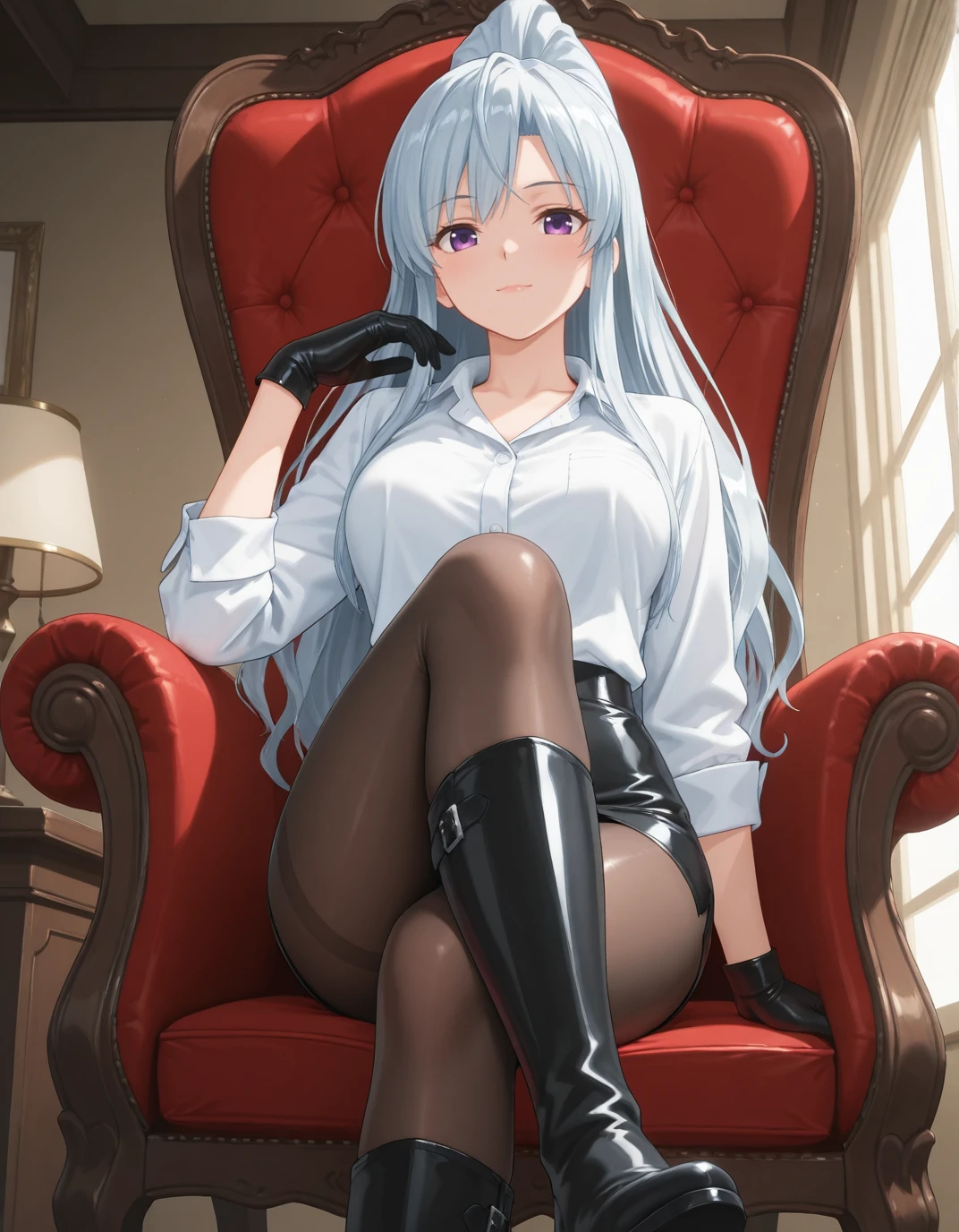 Basic trigger words: silver hair,very long straight hair, ponytail, dark purple eyes, thin lips, large natural breasts