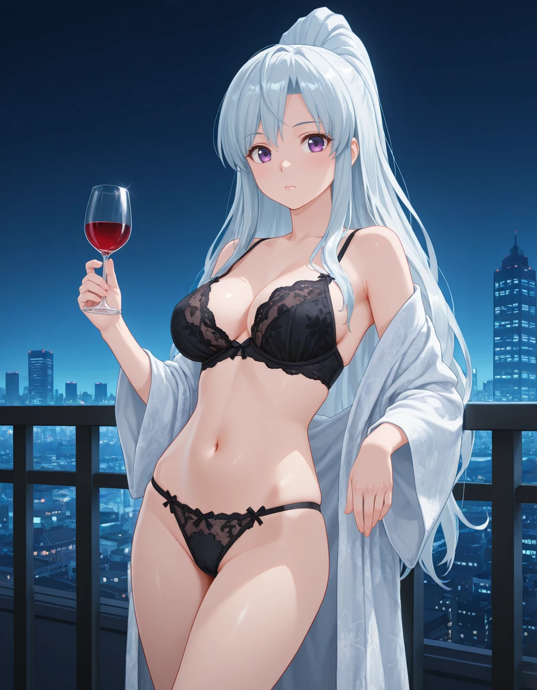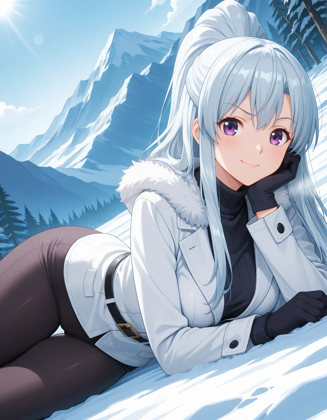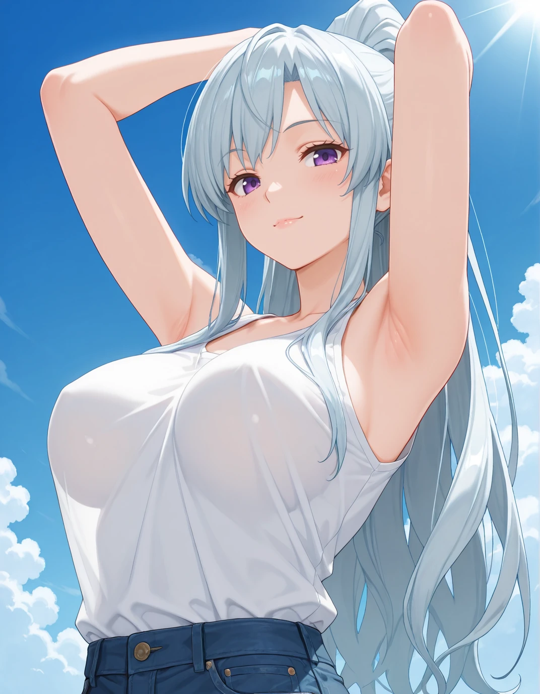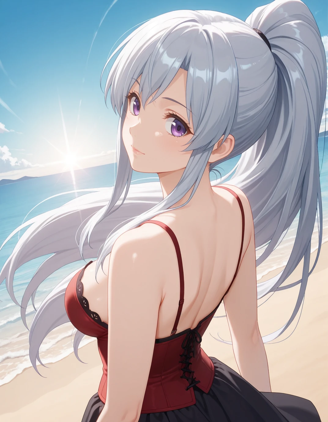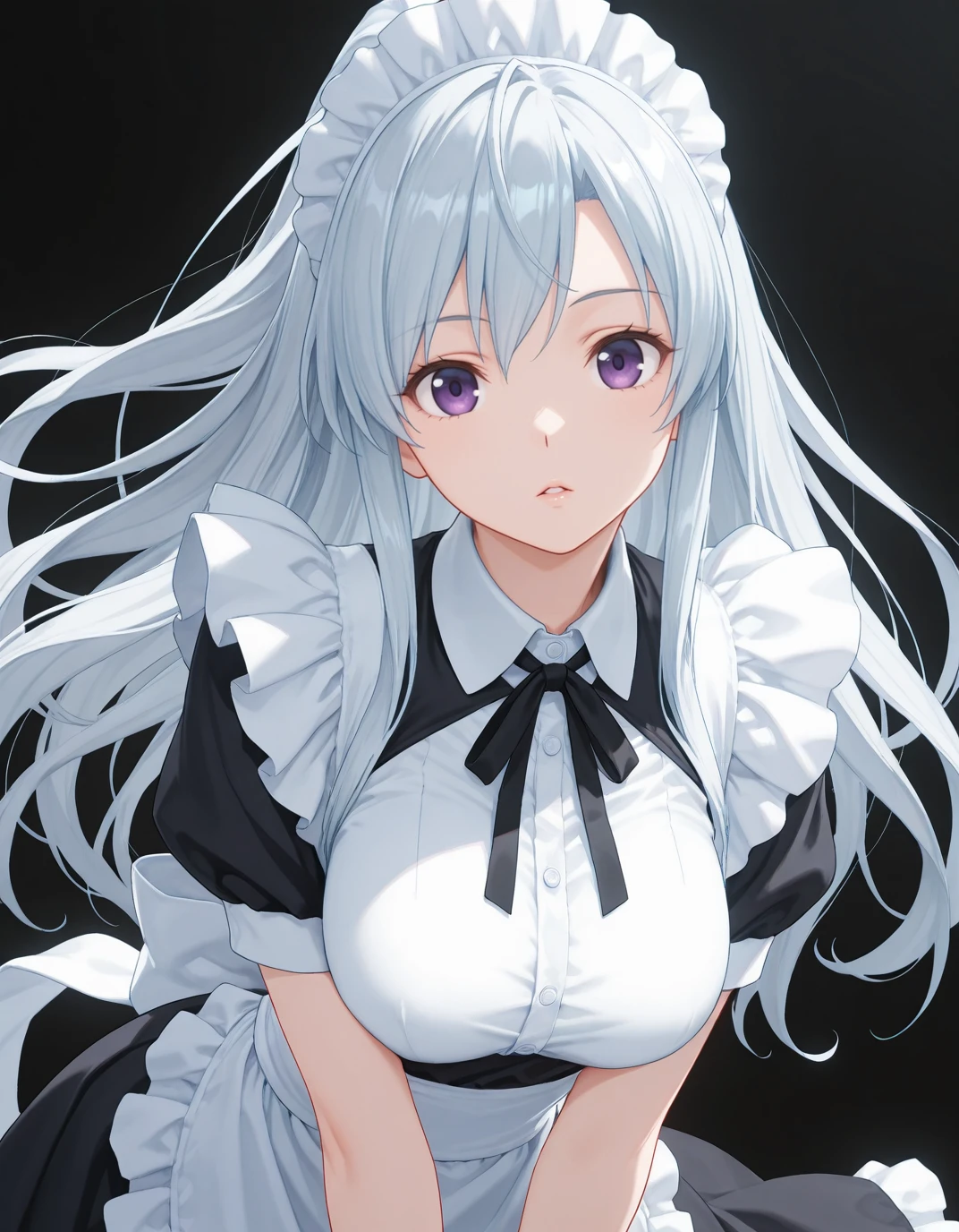 Basic trigger words: silver hair,very long straight hair, ponytail, dark purple eyes, thin lips, large natural breasts