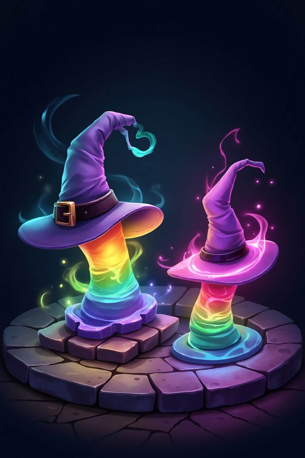 Glowing wizard hats, rainbow - colored, with swirling mist around, on dark stone - paved wizard square, cute cartoon rendering.