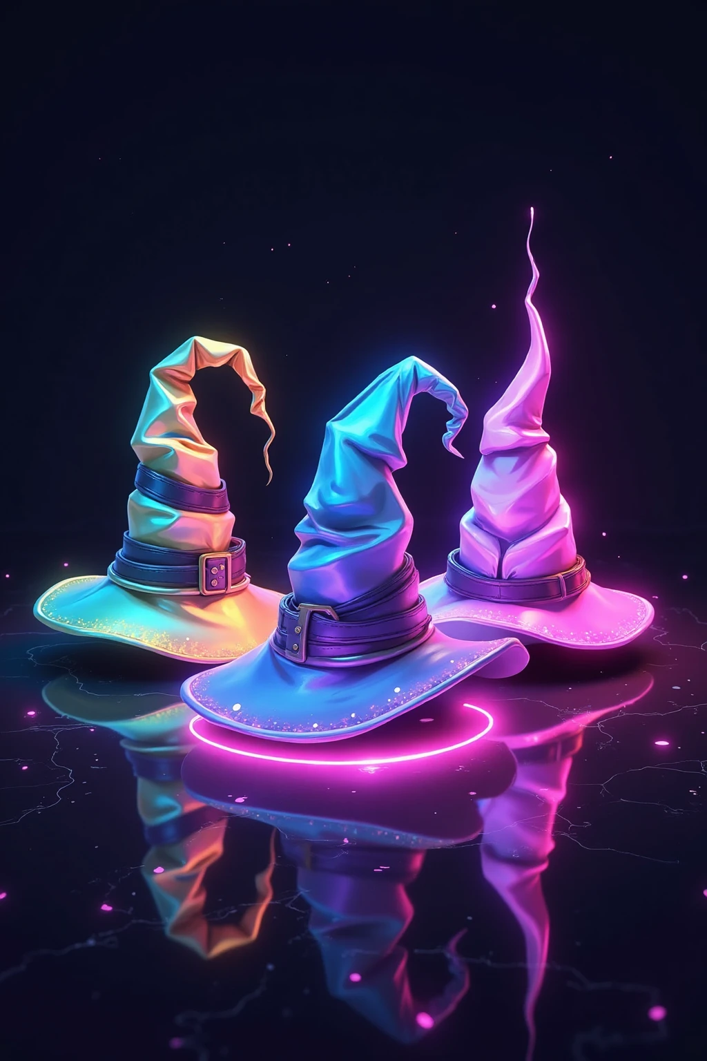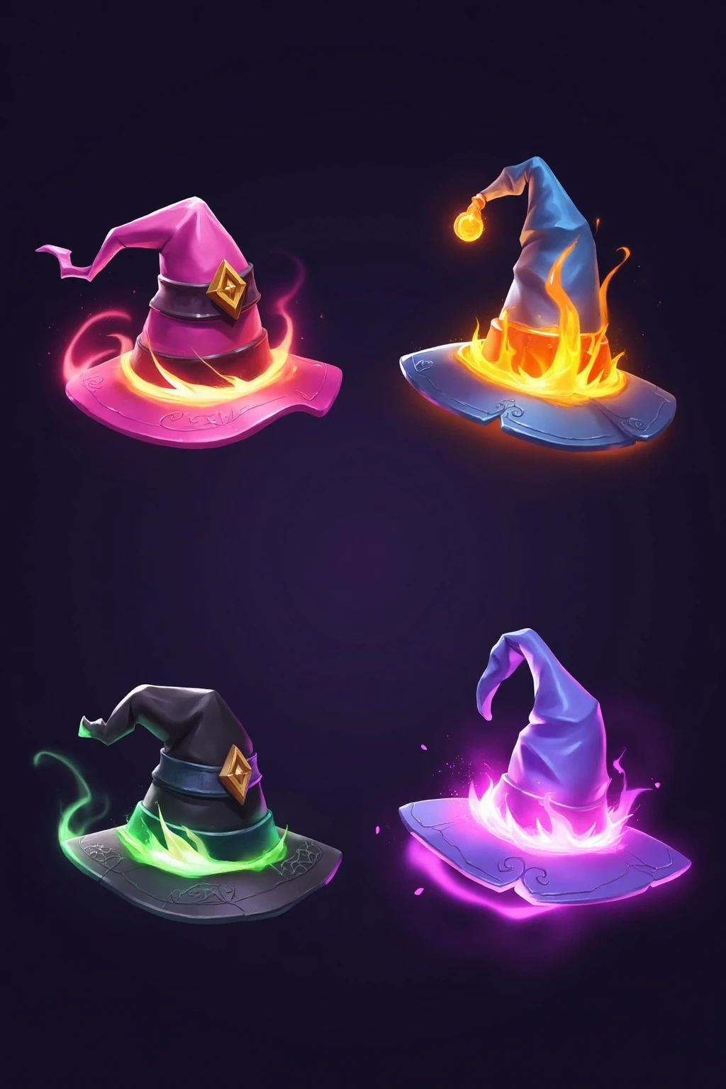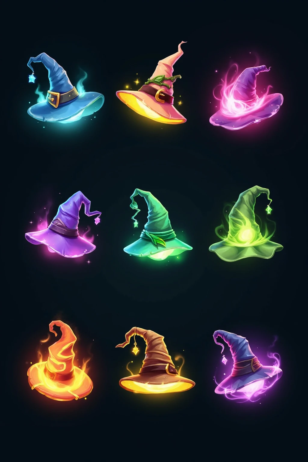 Glowing wizard hats, neon - lit, floating in starry night sky, each hat emits unique magic aura, sharp edges, fantasy game icon style.