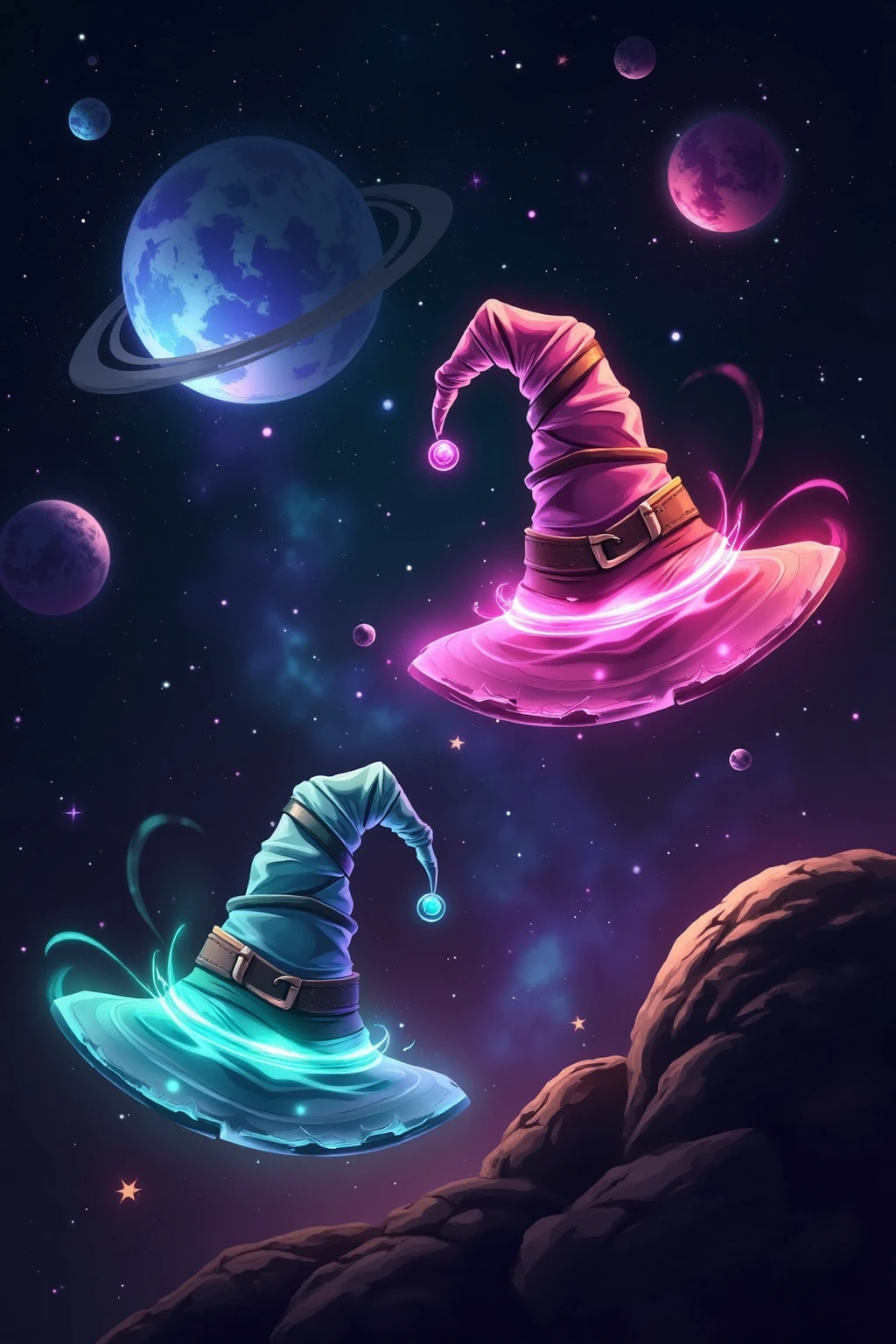 Glowing wizard hats, in cosmic space, star - dust glows, planet - shaped shadows, floating near galaxies, sci - fi fantasy art.