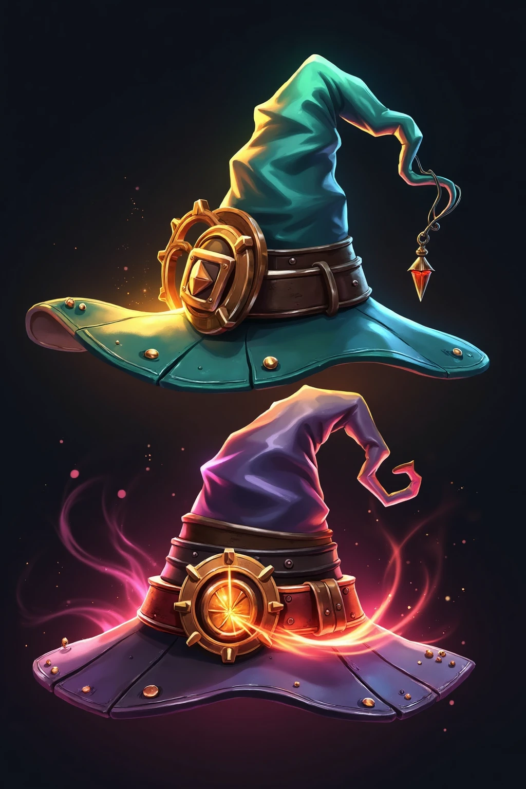 Glowing wizard hats, steampunk twist, gears on brims, copper - toned glows, steam - powered light effects, detailed rendering.