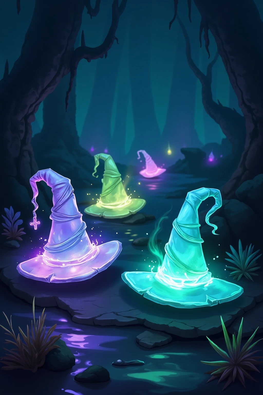 Glowing wizard hats, jungle magic, vine - entwined, leaf - shaped glows, earthy color blends, adventure game icon vibe.