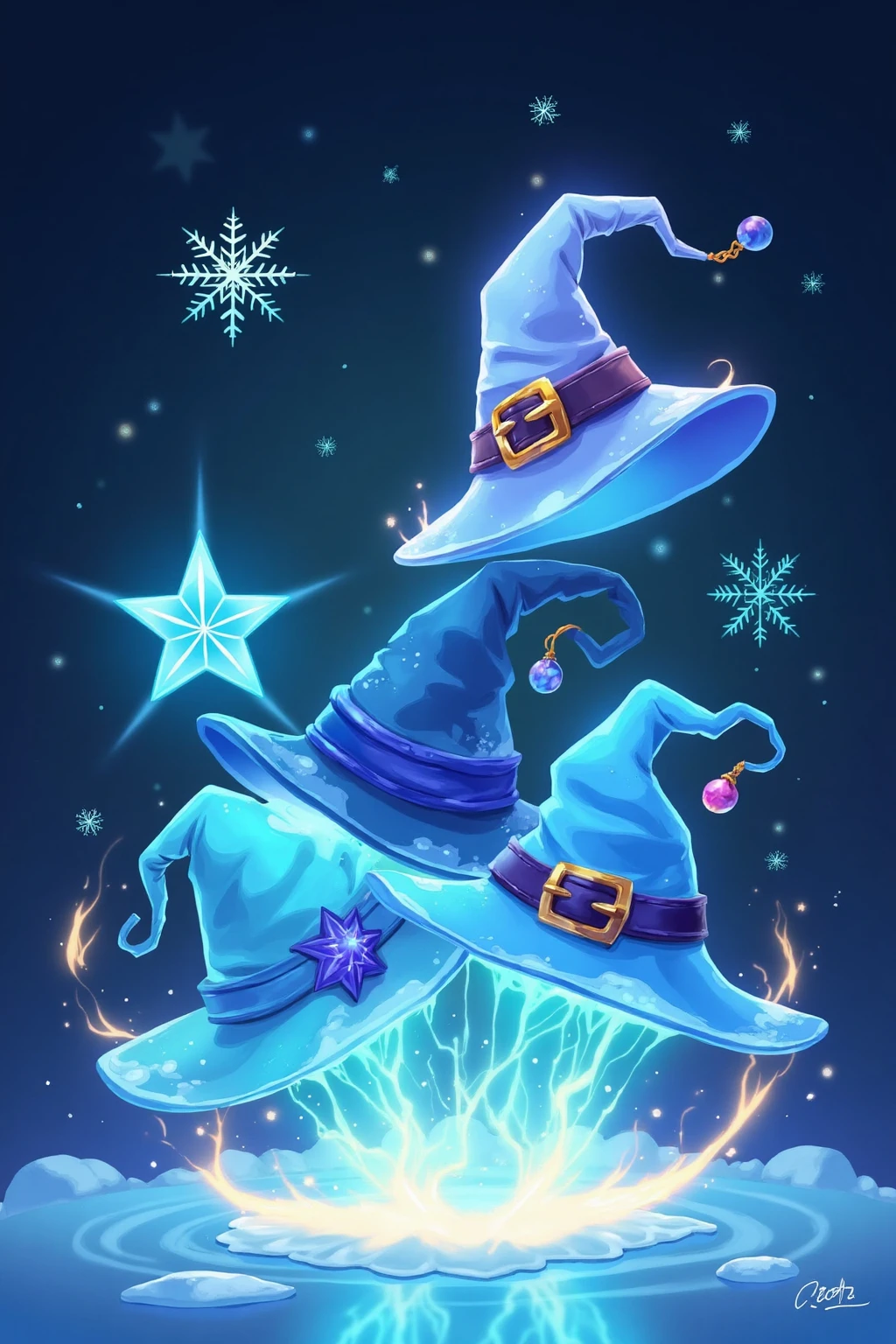 Glowing wizard hats, winter magic, frost - like glows, snowflake patterns, icy blue tones, holiday card illustration style.