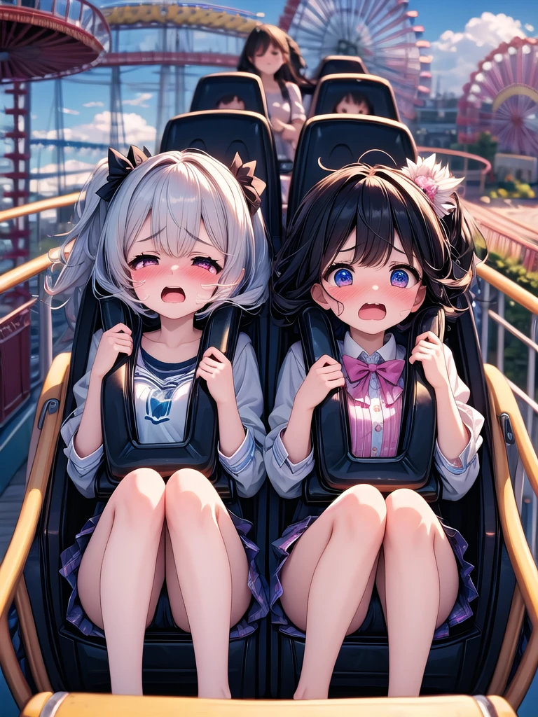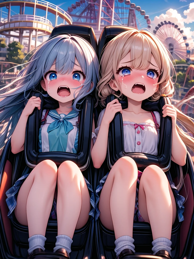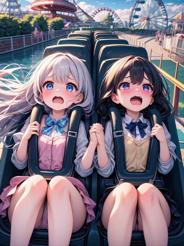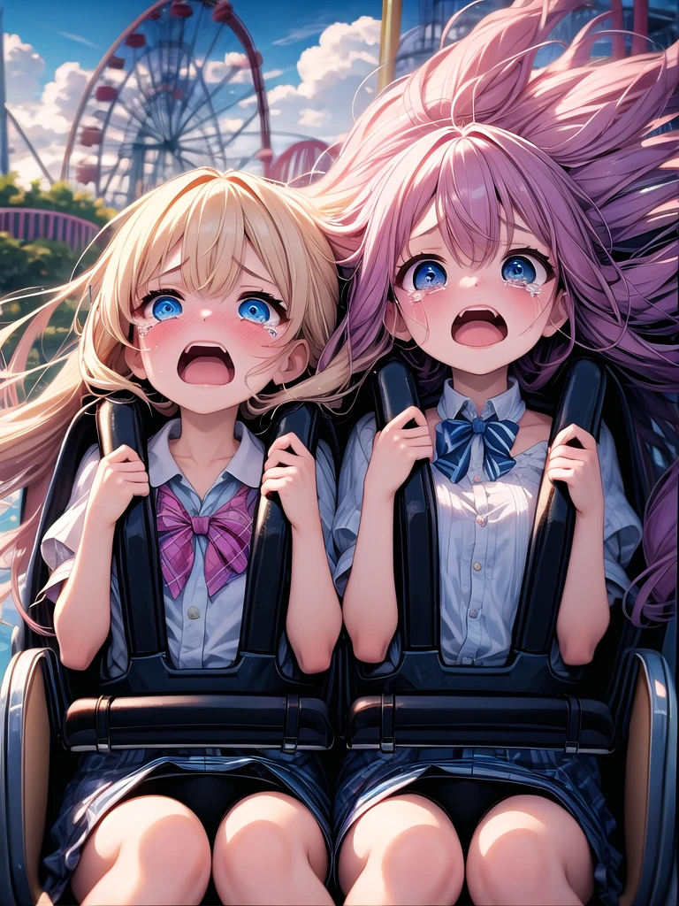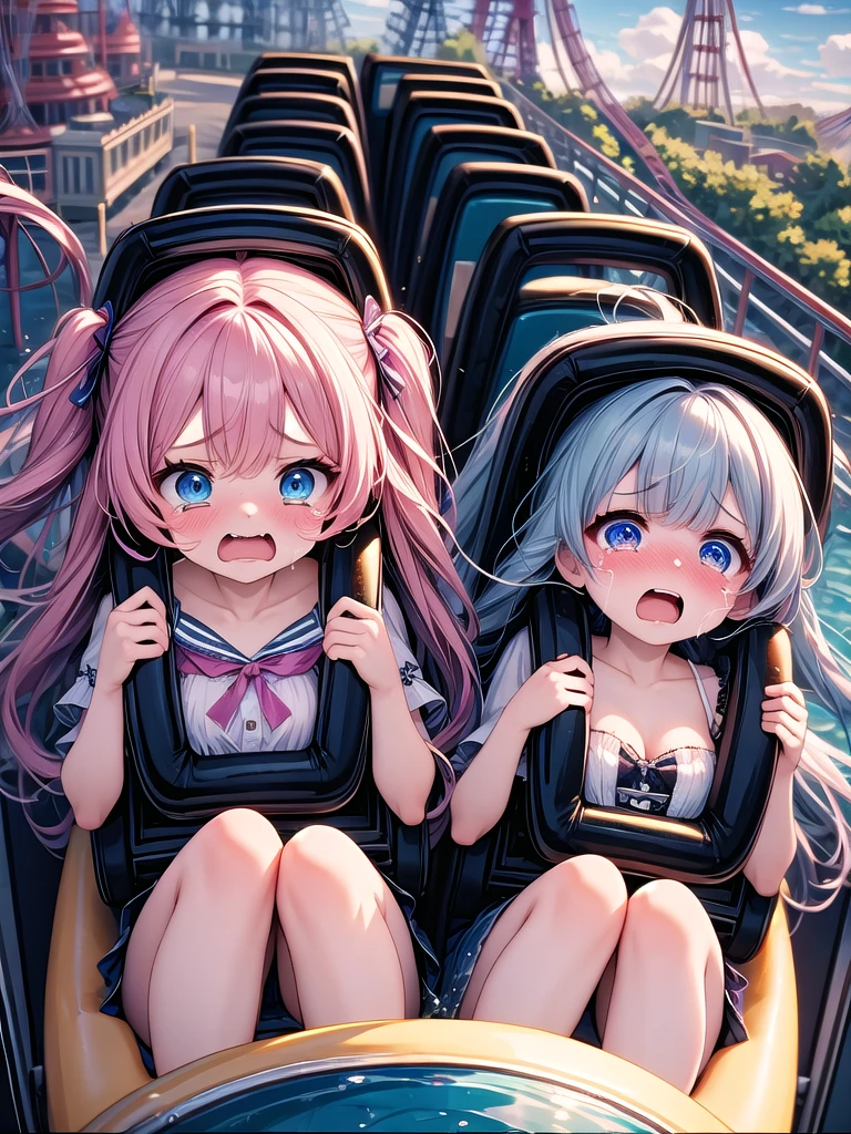roller coaster, vehicle focus, couple, 2girls, 3girls, 4girls, 5girls, 6+girls, multiple girls, hands on own chest, sitting, crying, scared, blush, tears, open mouth, long hair, messy hair, floating hair, symmetry, outdoors, overlooking, horizon, splashing, midair, spiral, cloudy sky, blue sky, motion blur, amusement park, full body,