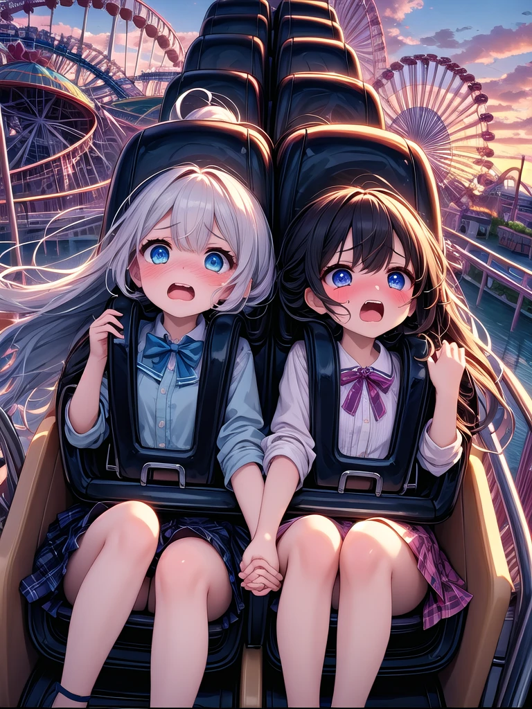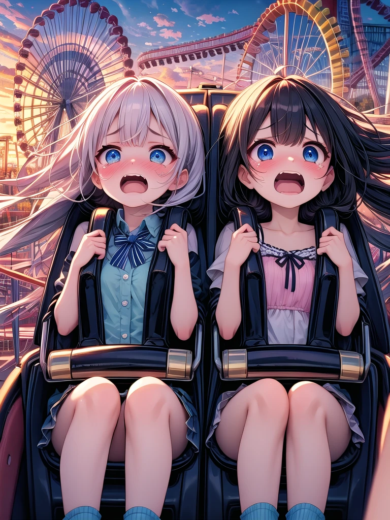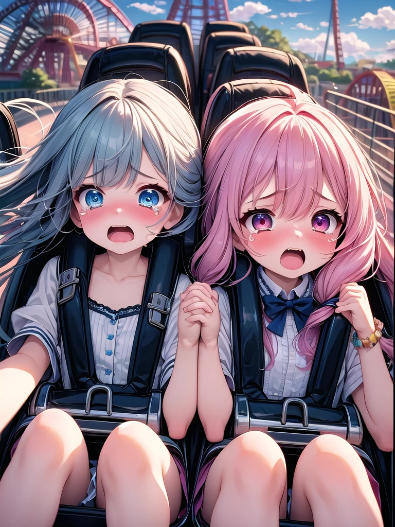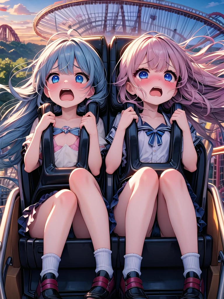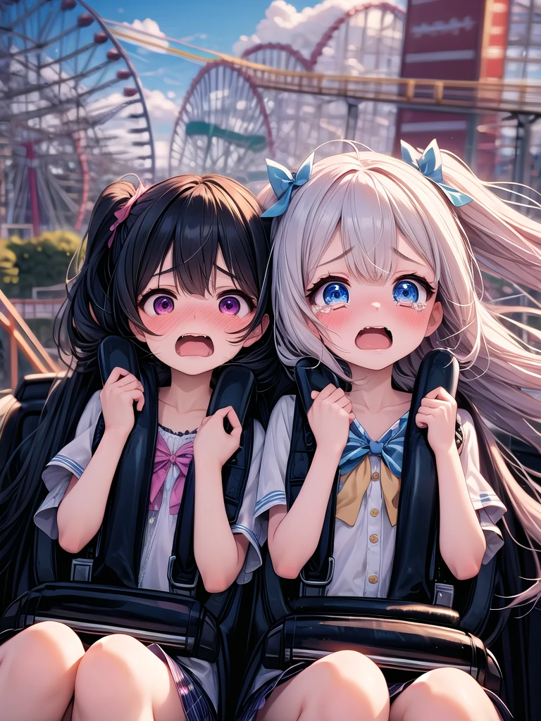 roller coaster, vehicle focus, couple, 2girls, 3girls, 4girls, 5girls, 6+girls, multiple girls, hands on own chest, sitting, crying, scared, blush, tears, open mouth, long hair, messy hair, floating hair, symmetry, outdoors, overlooking, horizon, splashing, midair, spiral, cloudy sky, blue sky, motion blur, amusement park, full body,