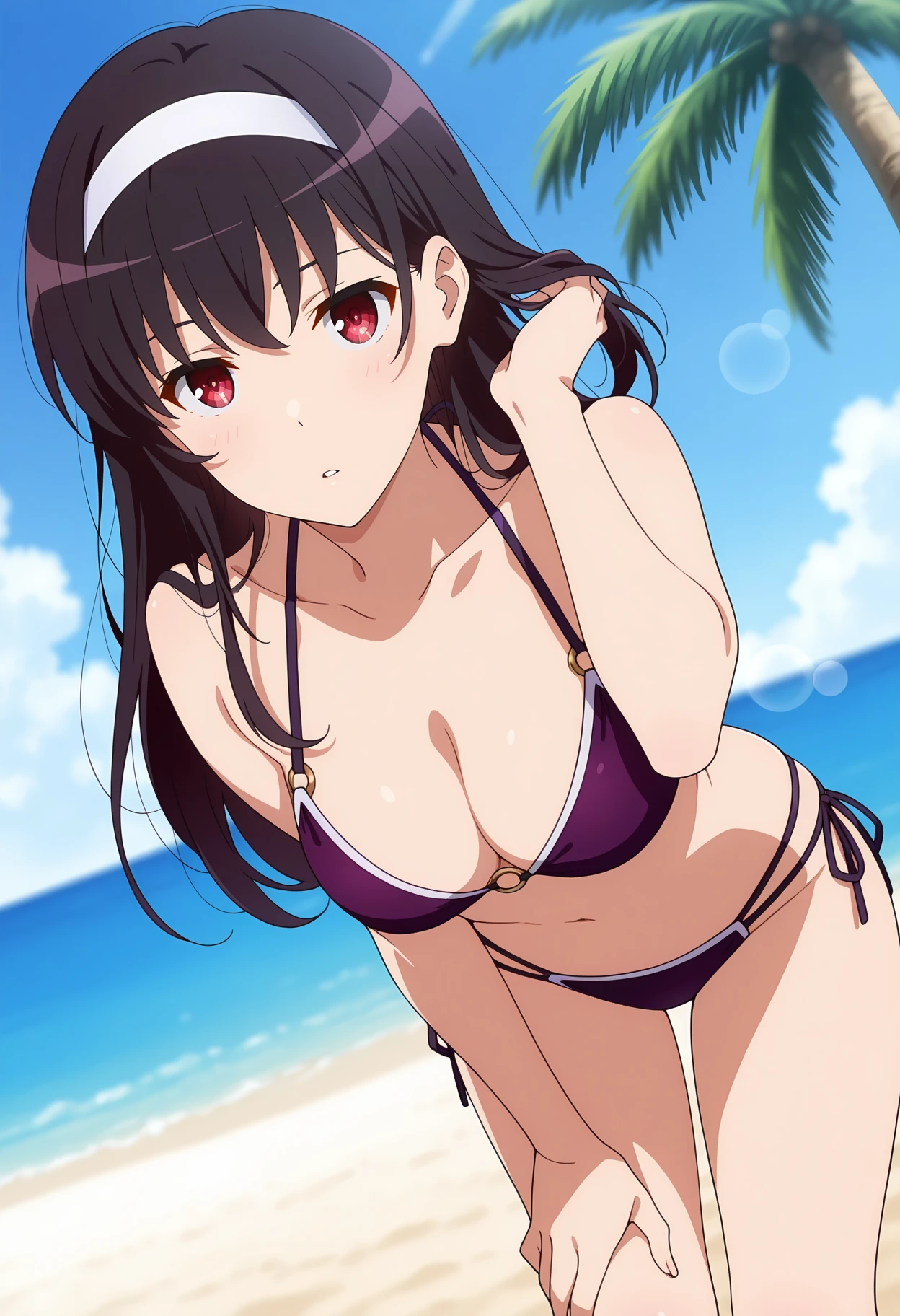 halterneck, o-ring top, purple bikini, cleavage, medium breasts, multi-strapped bikini bottom, side-tie bikini bottom