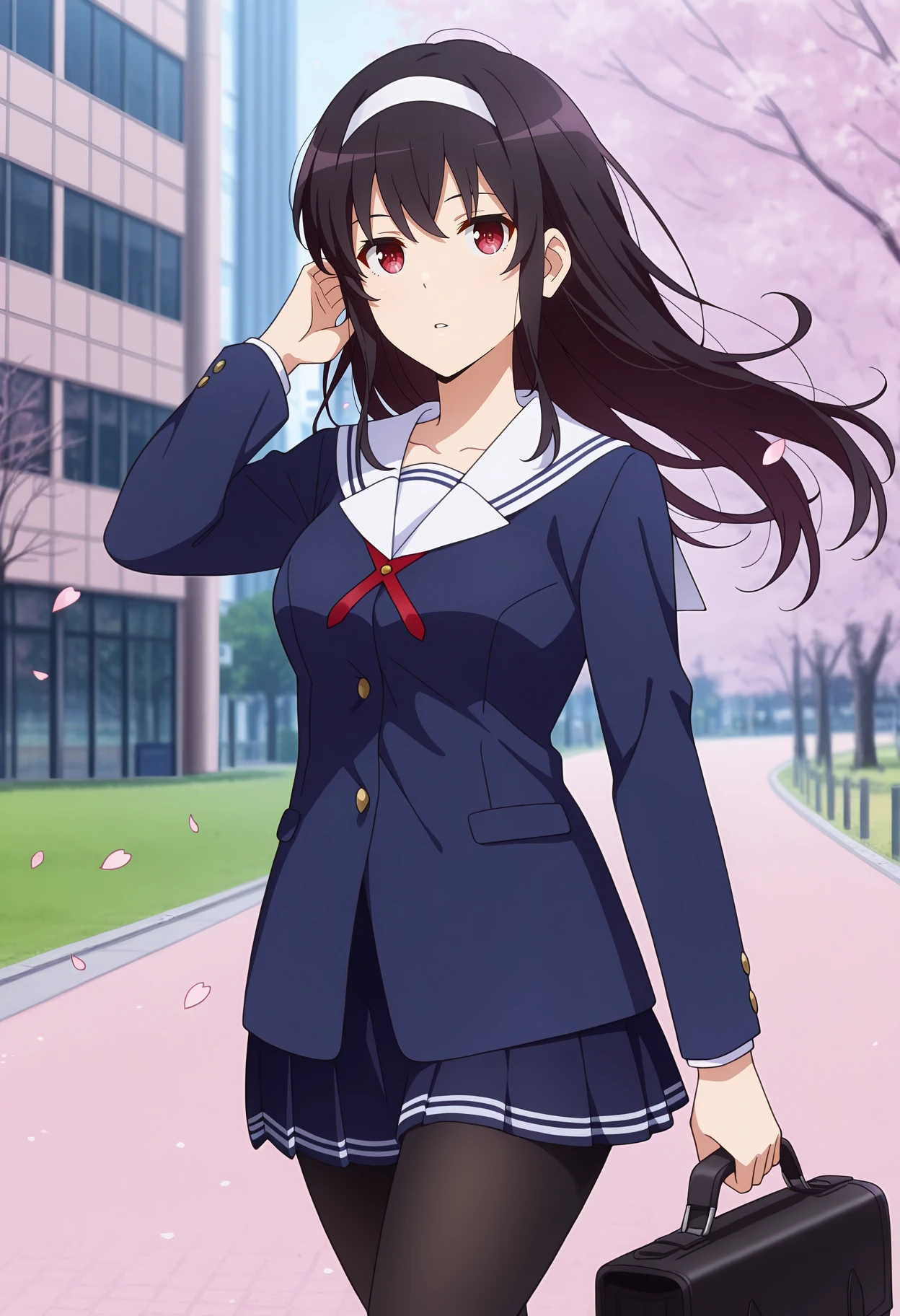 white sailor collar, blue jacket, red cross tie, white shirt, medium breasts, long sleeves, pleated skirt, miniskirt, blue skirt, black pantyhose