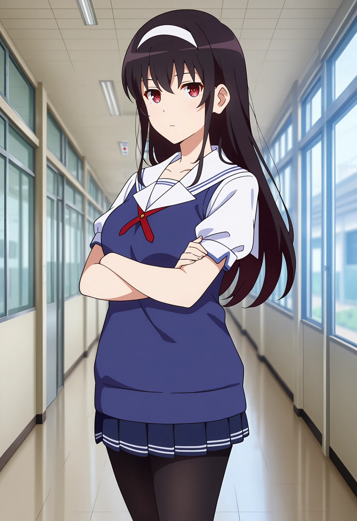 white sailor collar, sweater vest, blue vest, red cross tie, white shirt, puffy short sleeves, pleated skirt, miniskirt, blue skirt, black pantyhose