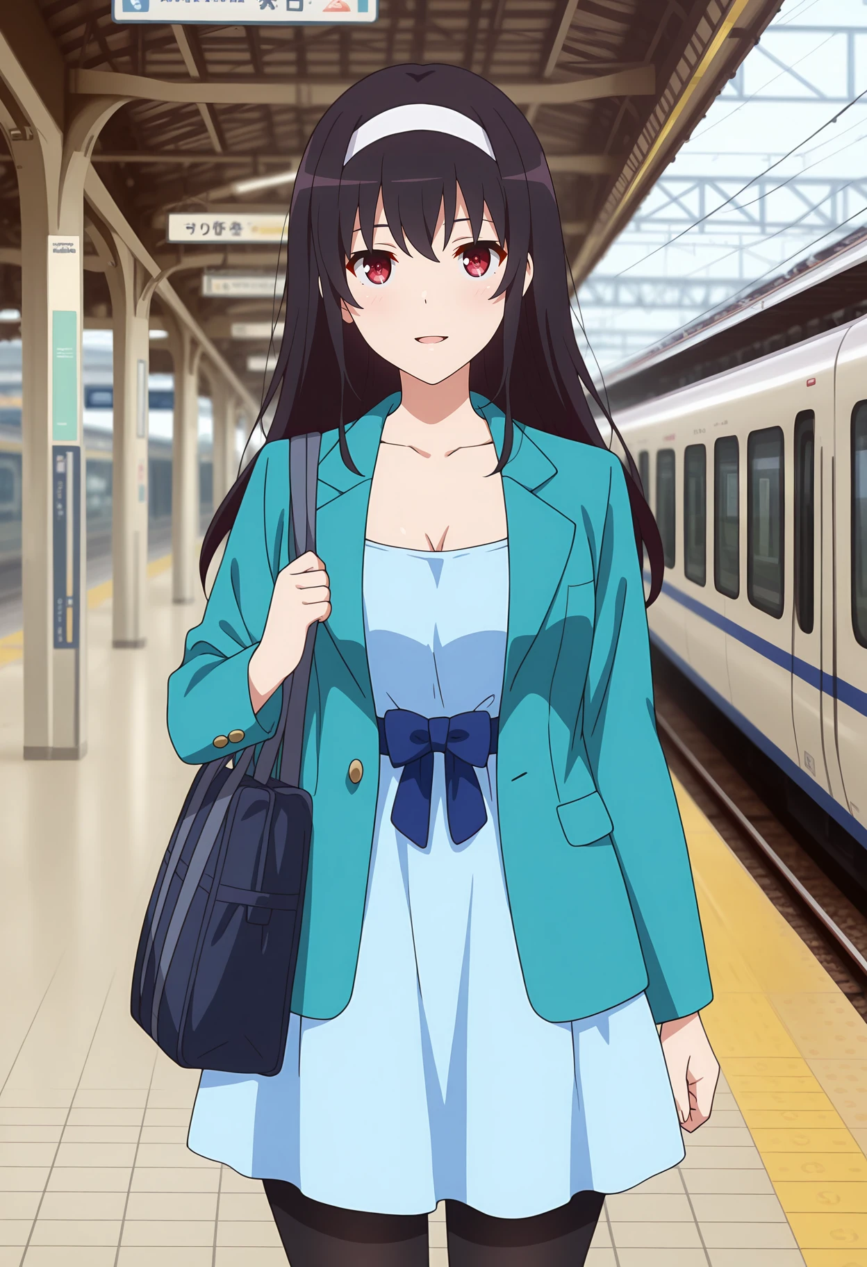 open jacket, aqua jacket, light blue dress, cleavage, medium breasts, waist bow, blue bow, black pantyhose