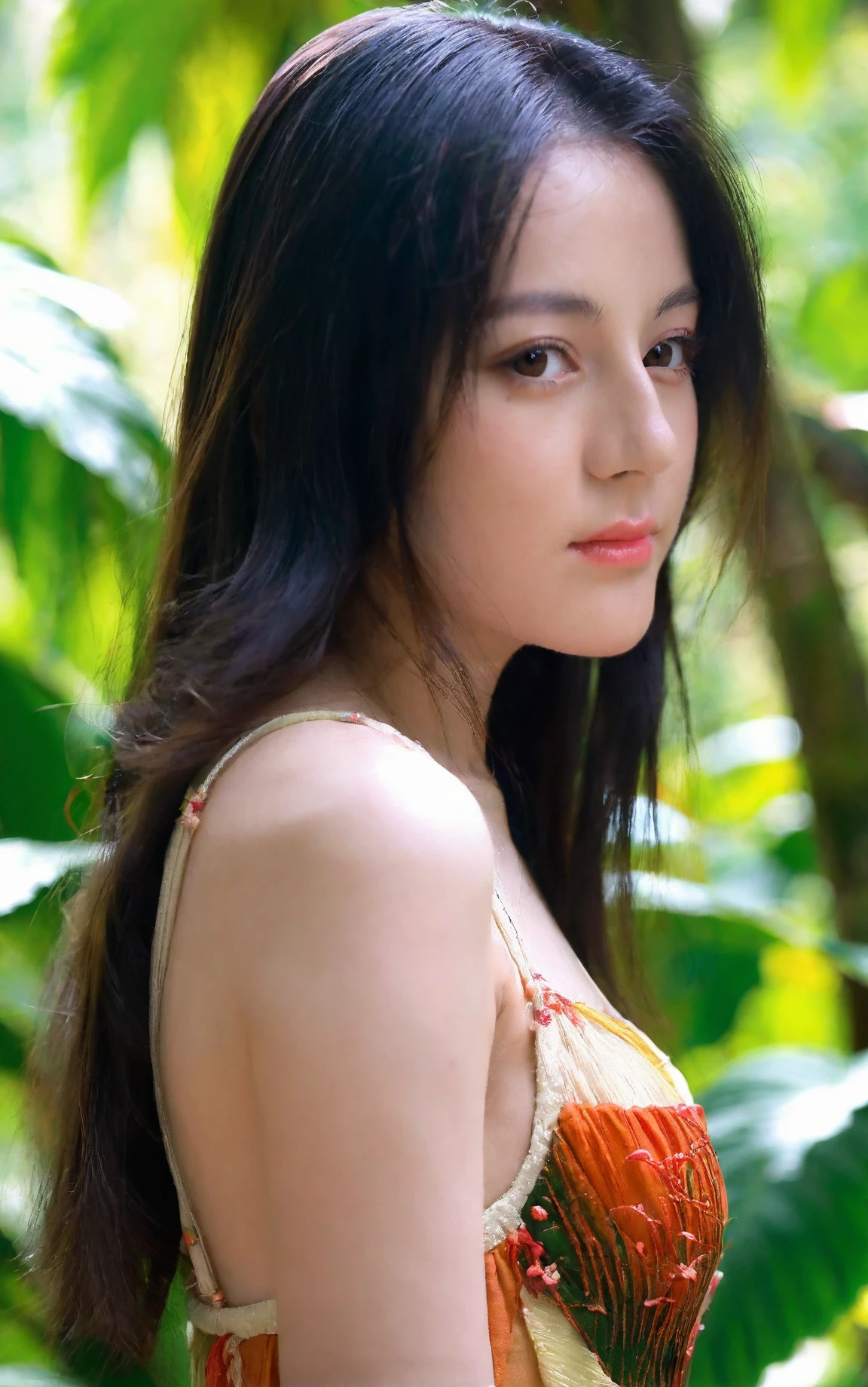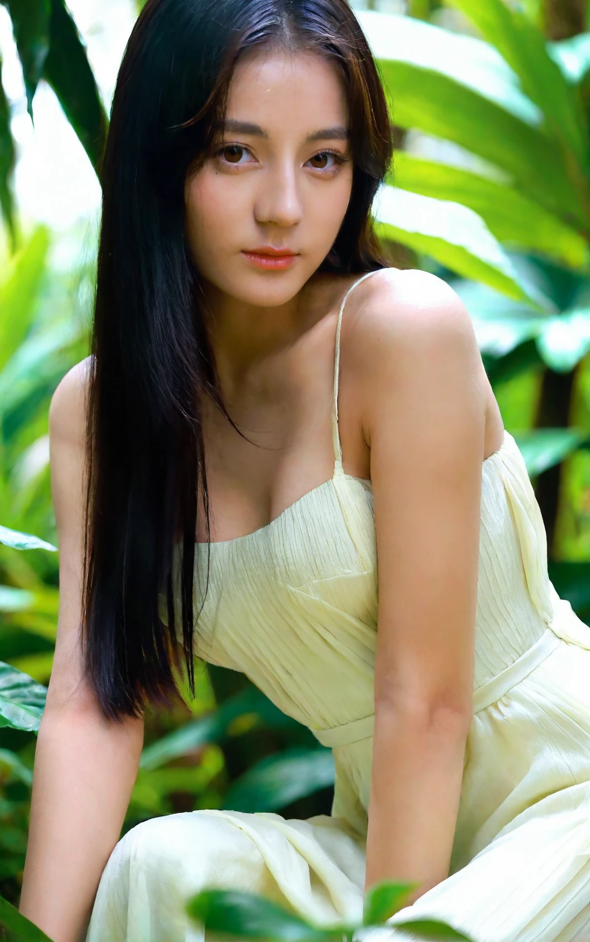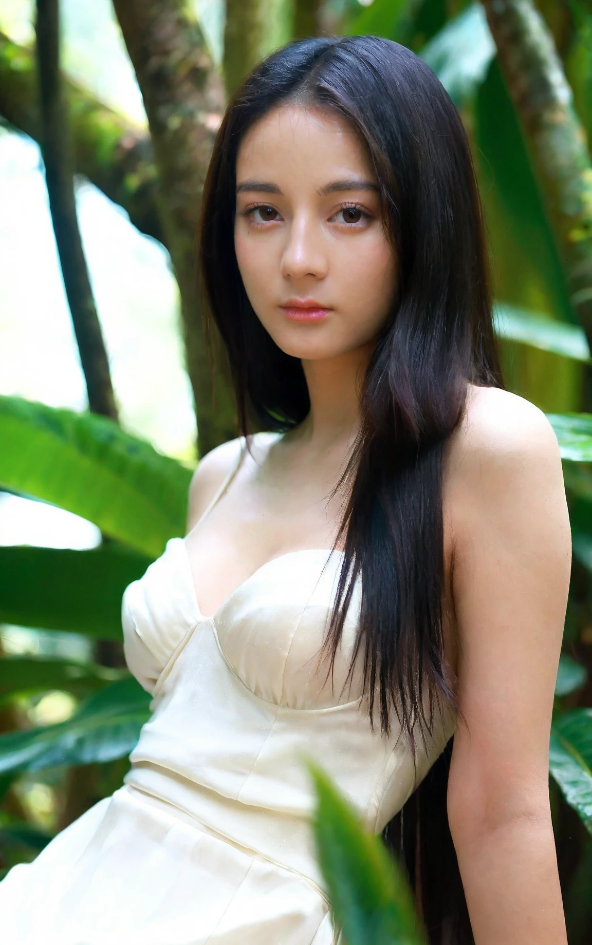 long hair, dilireba, long hair, breasts, solo, white dress, thighs, black hair, looking at viewer, realistic, medium breasts, bare shoulder, <lora:dilireba 55P computer PONY 1e-4 002:1>, (close up, portrait, face only), jungle,