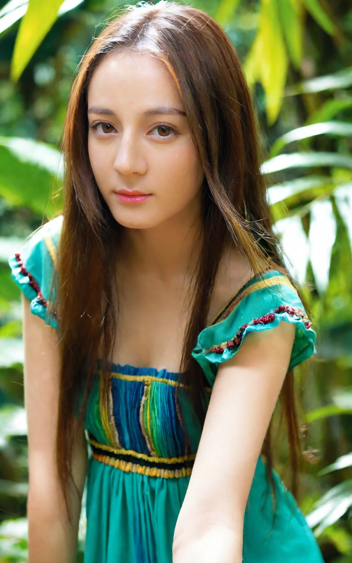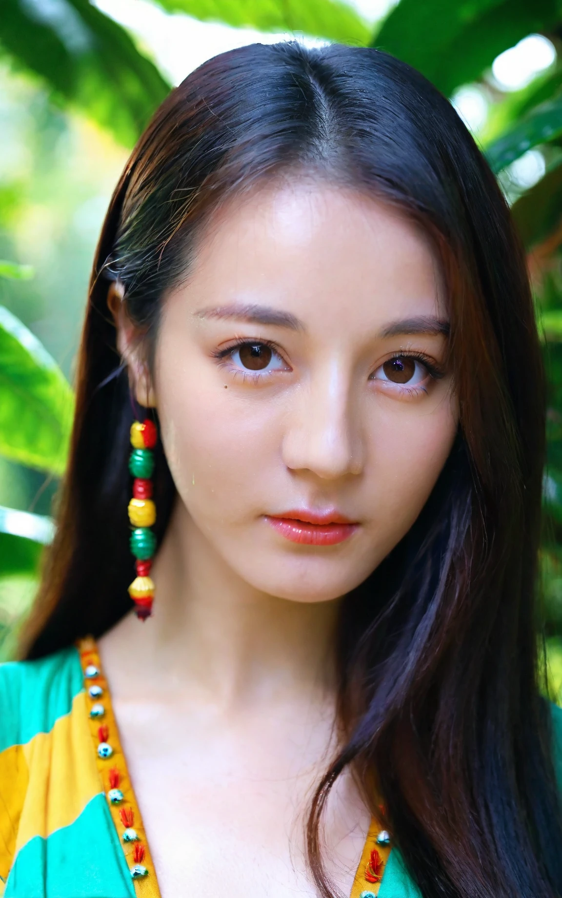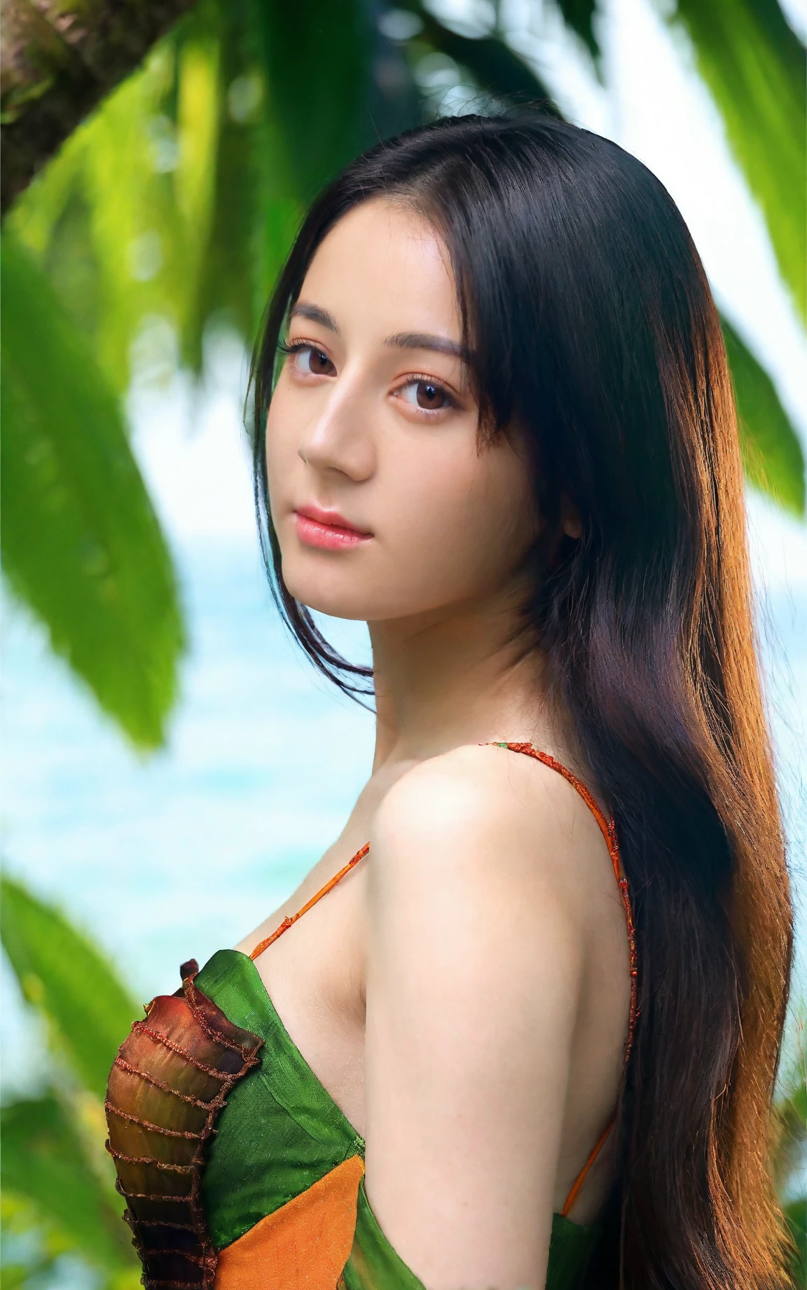 long hair, dilireba, long hair, breasts, solo, white dress, thighs, black hair, looking at viewer, realistic, medium breasts, bare shoulder, <lora:dilireba 55P computer PONY 1e-4 002:1>, (close up, portrait, face only), jungle,
