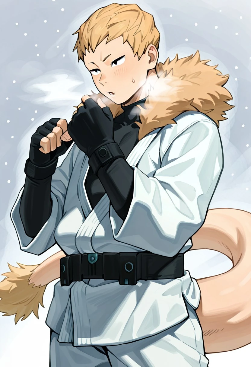 Hero Costume, half fur lined Karate Gi, Blue Fingerless Gloves, Black Belt, Black Boots