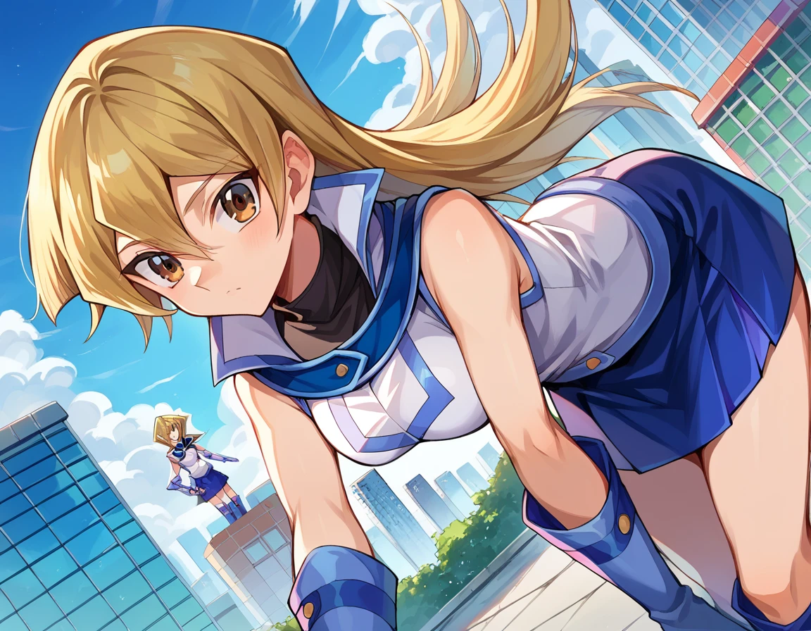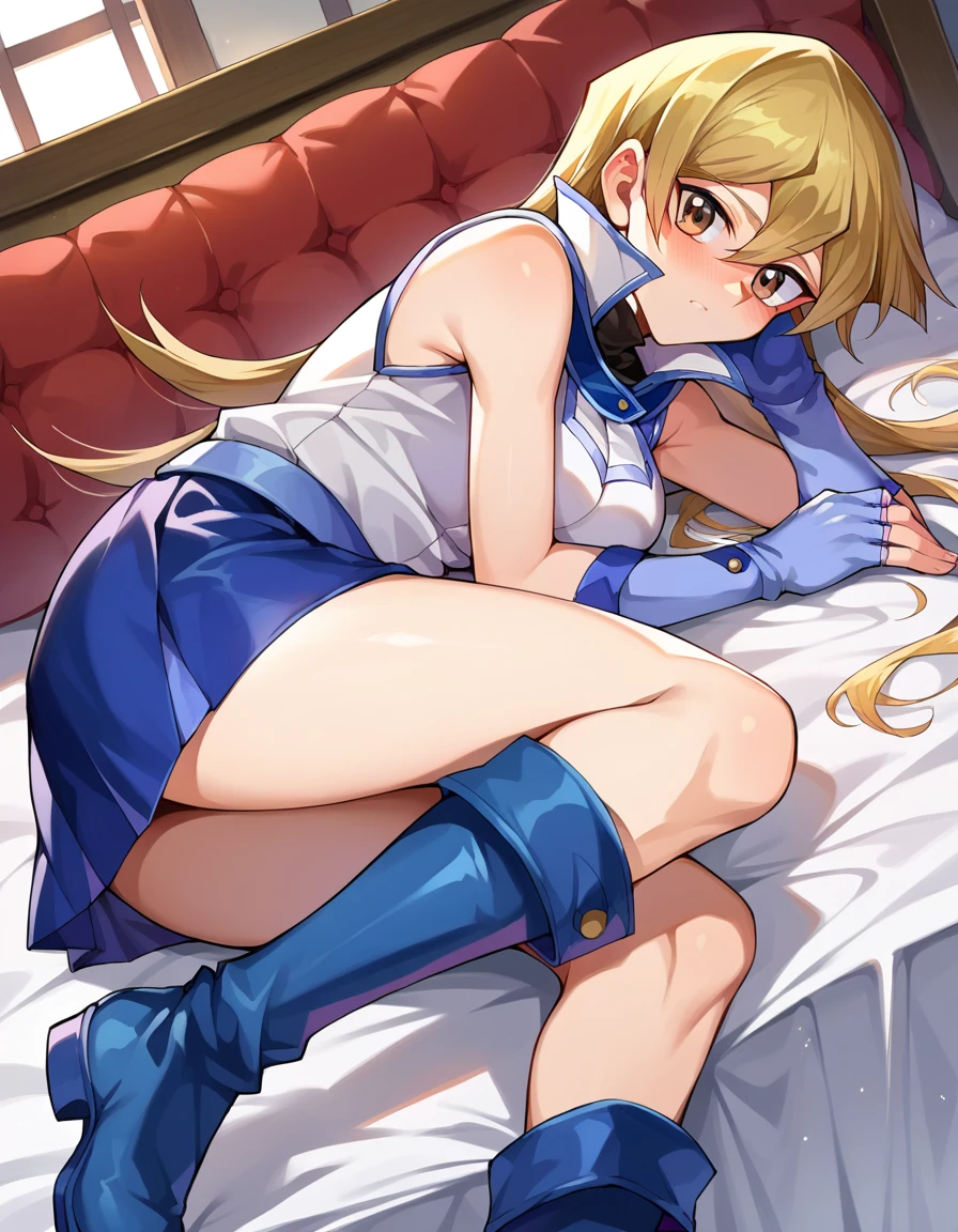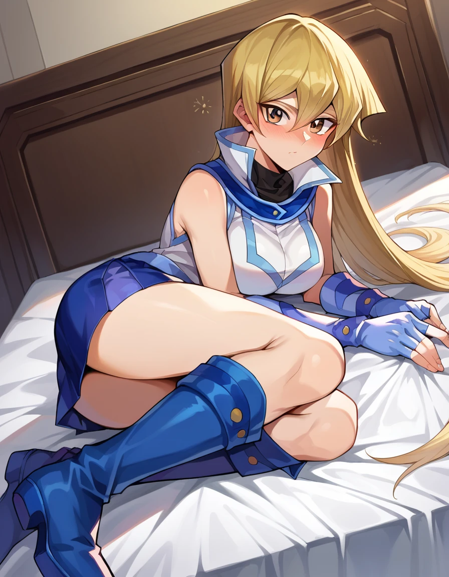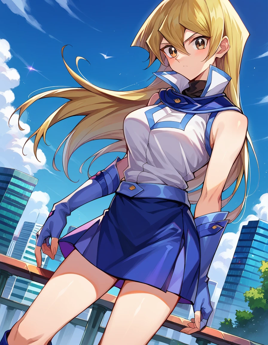 blue footwear, blue gloves, blue skirt, boots, duel academy uniform (yu-gi-oh! gx), elbow gloves, fingerless gloves, gloves, jacket, miniskirt, skirt, sleeveless, sleeveless jacket, sleeveless shirt, white jacket,