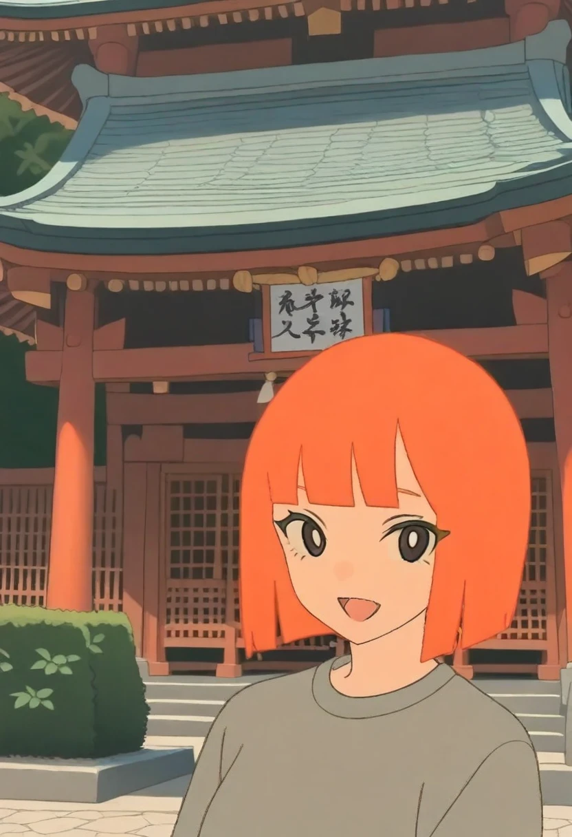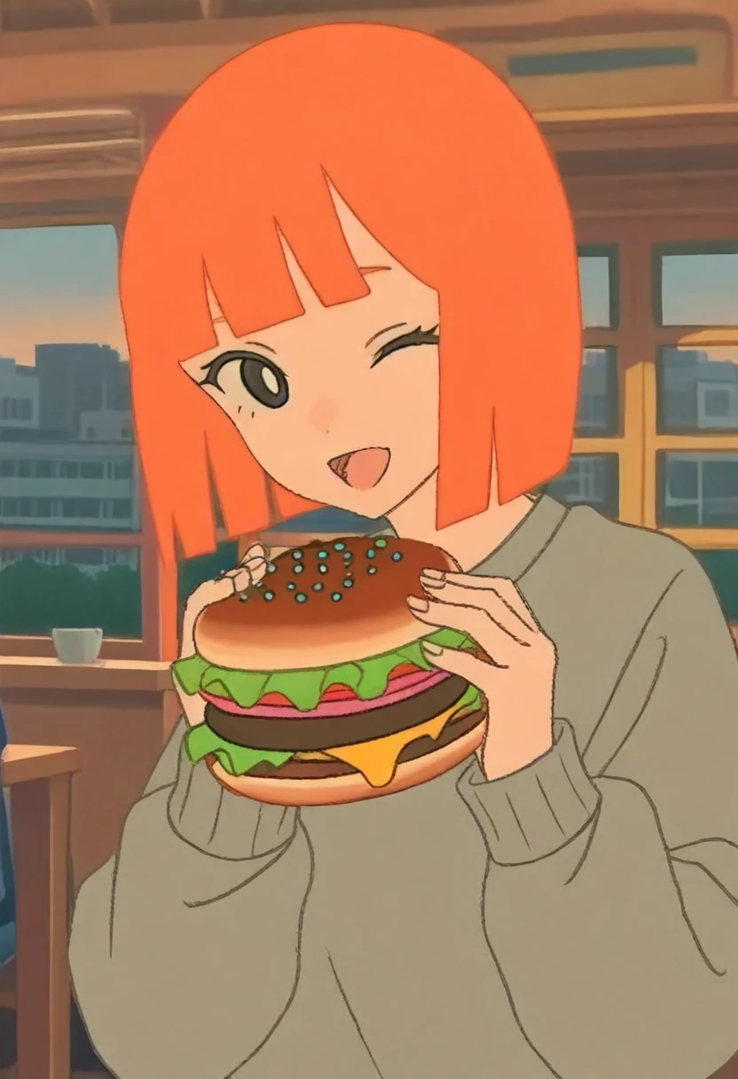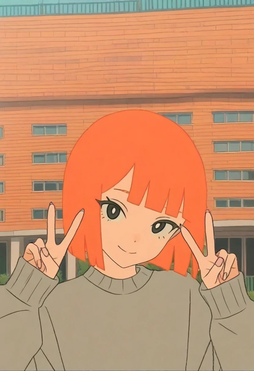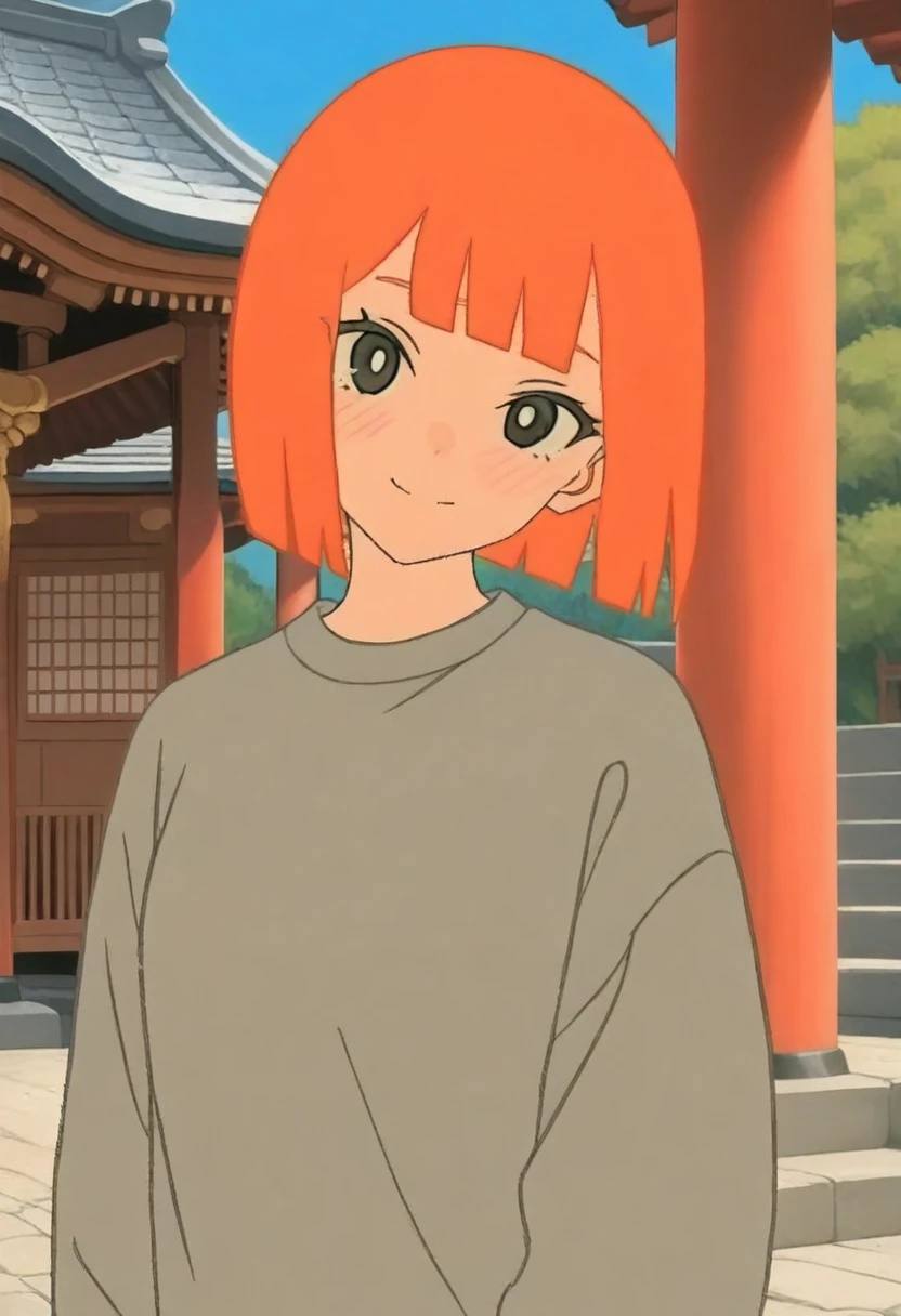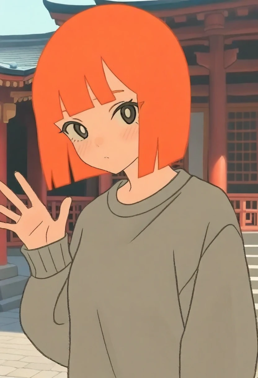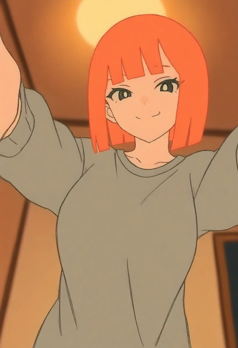 General Prompts: grey sweater, short hair, blunt bangs, orange hair, black eyes, bob cut