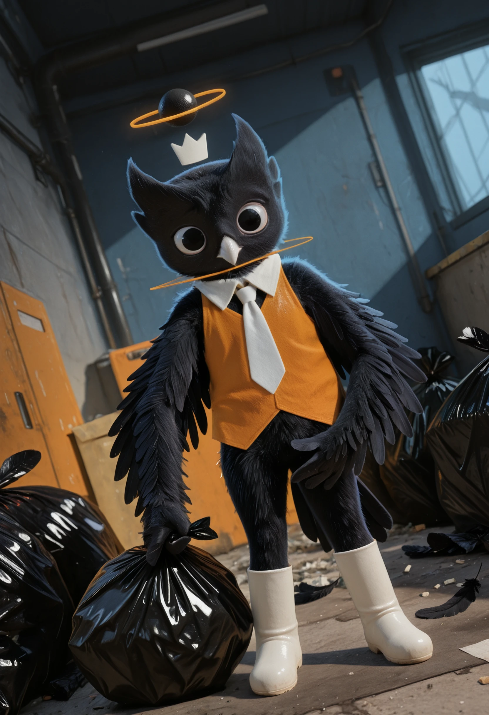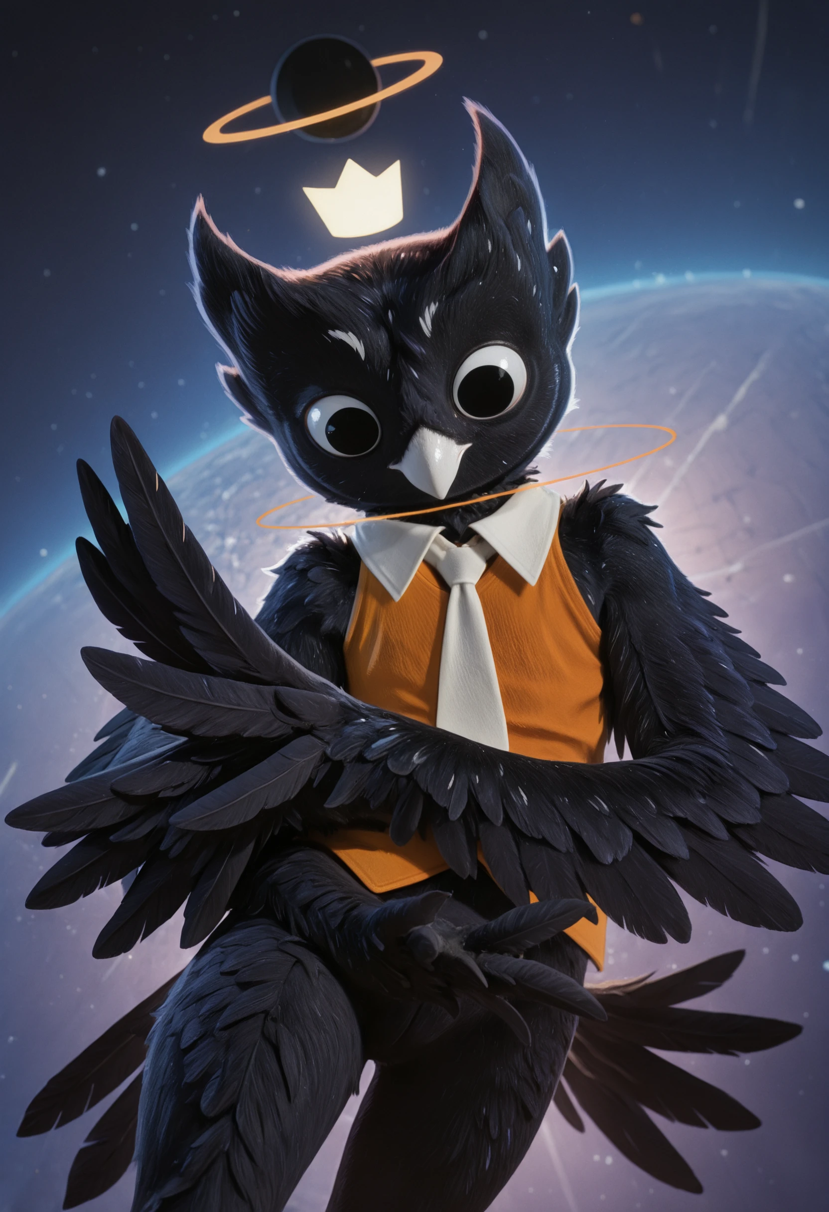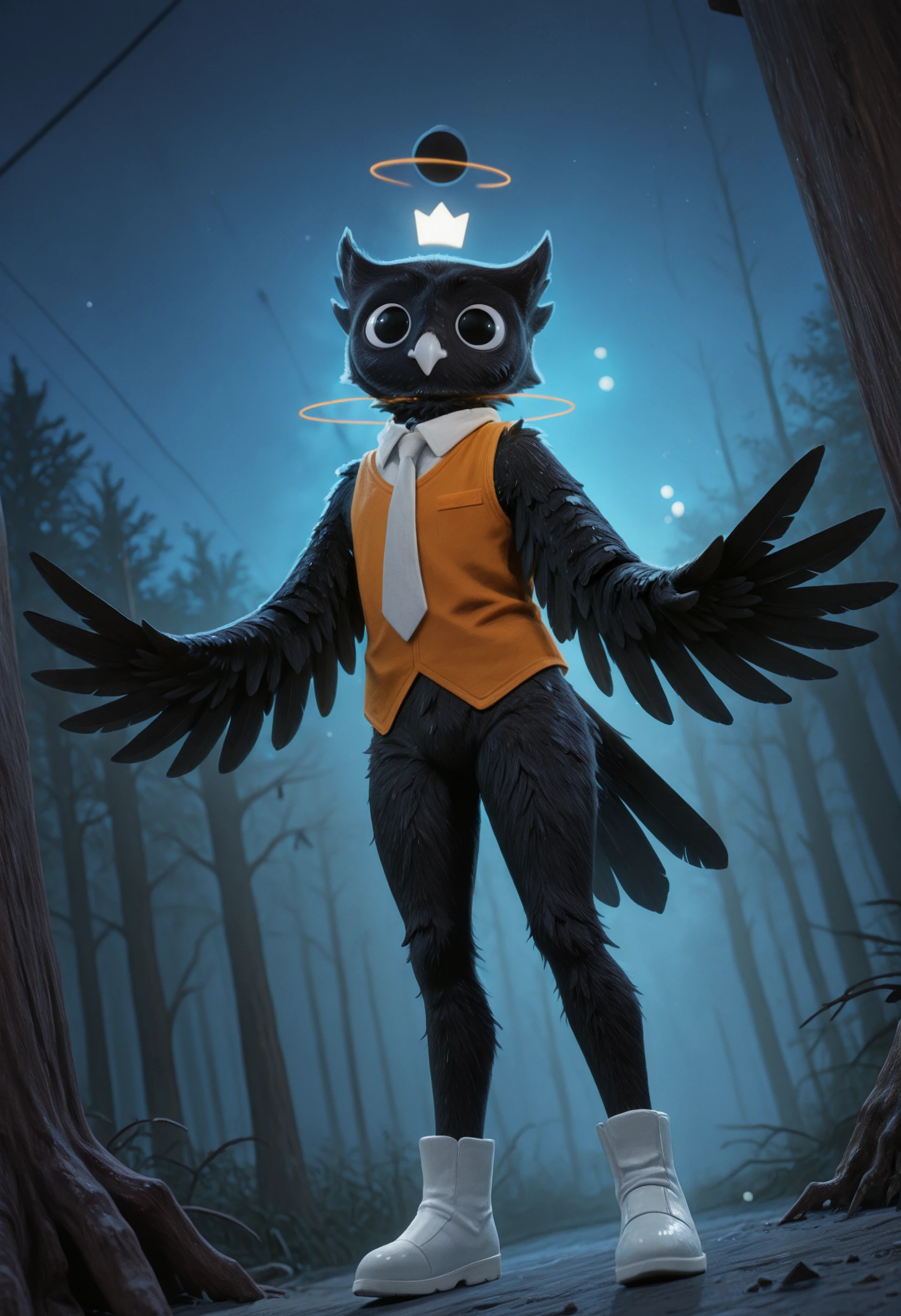st0las_votv, bird, owl, avian, anthro, hi res, clothing, solo, black fur, furry, wings, male, tail, black eyes, male focus, 1boy, halo, feathers, black feathers, white beak, looking at viewer, orange vest, white necktie