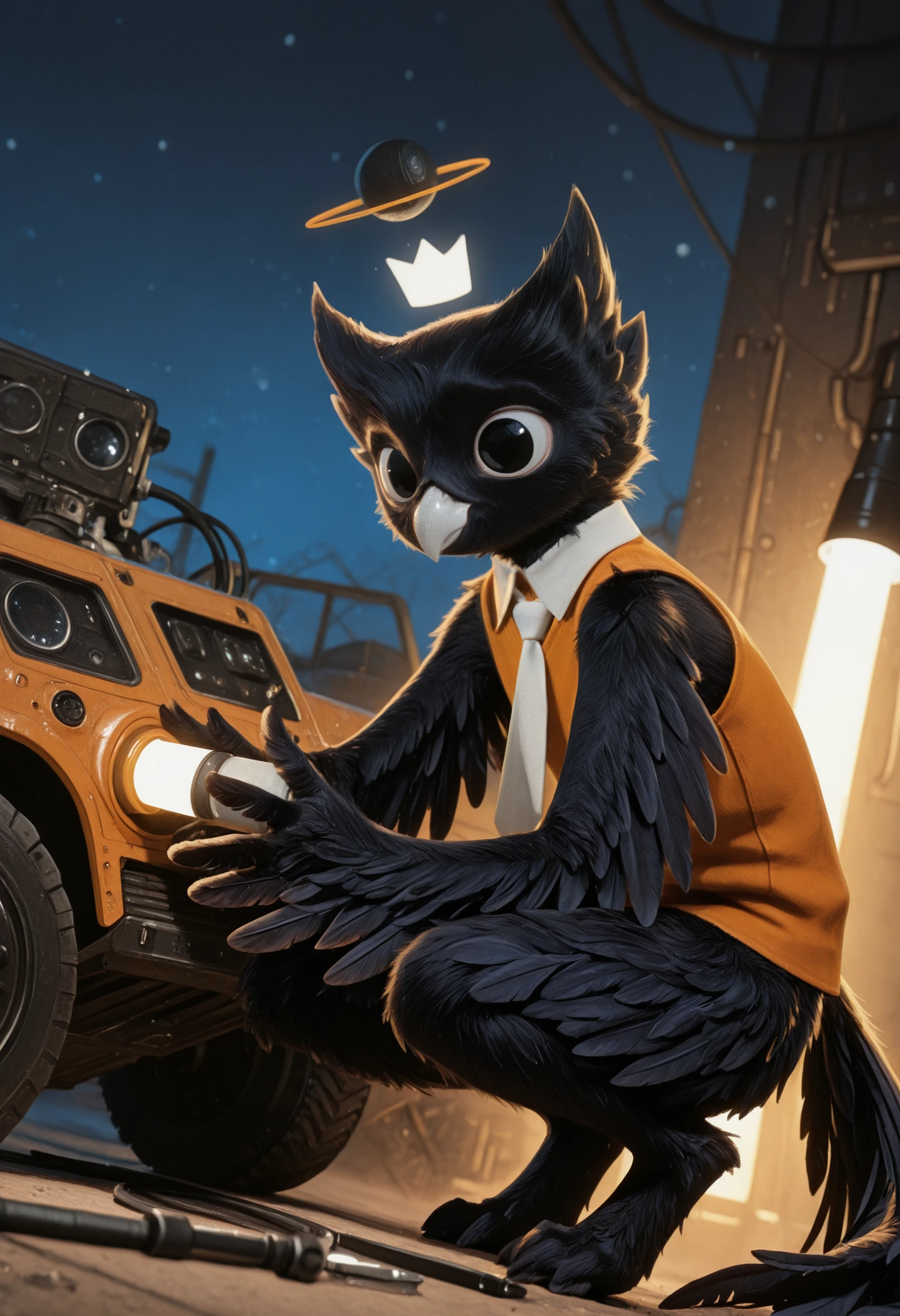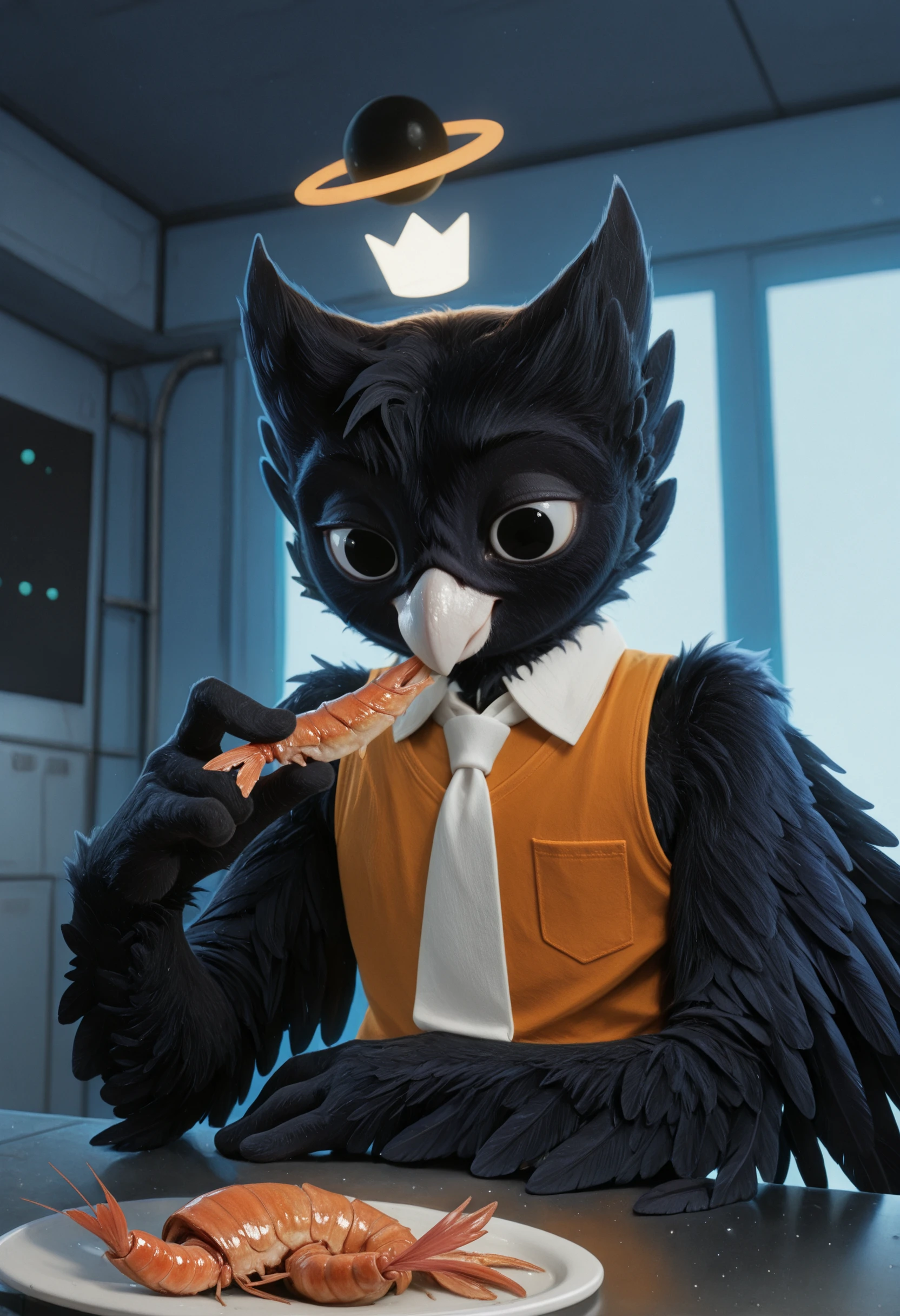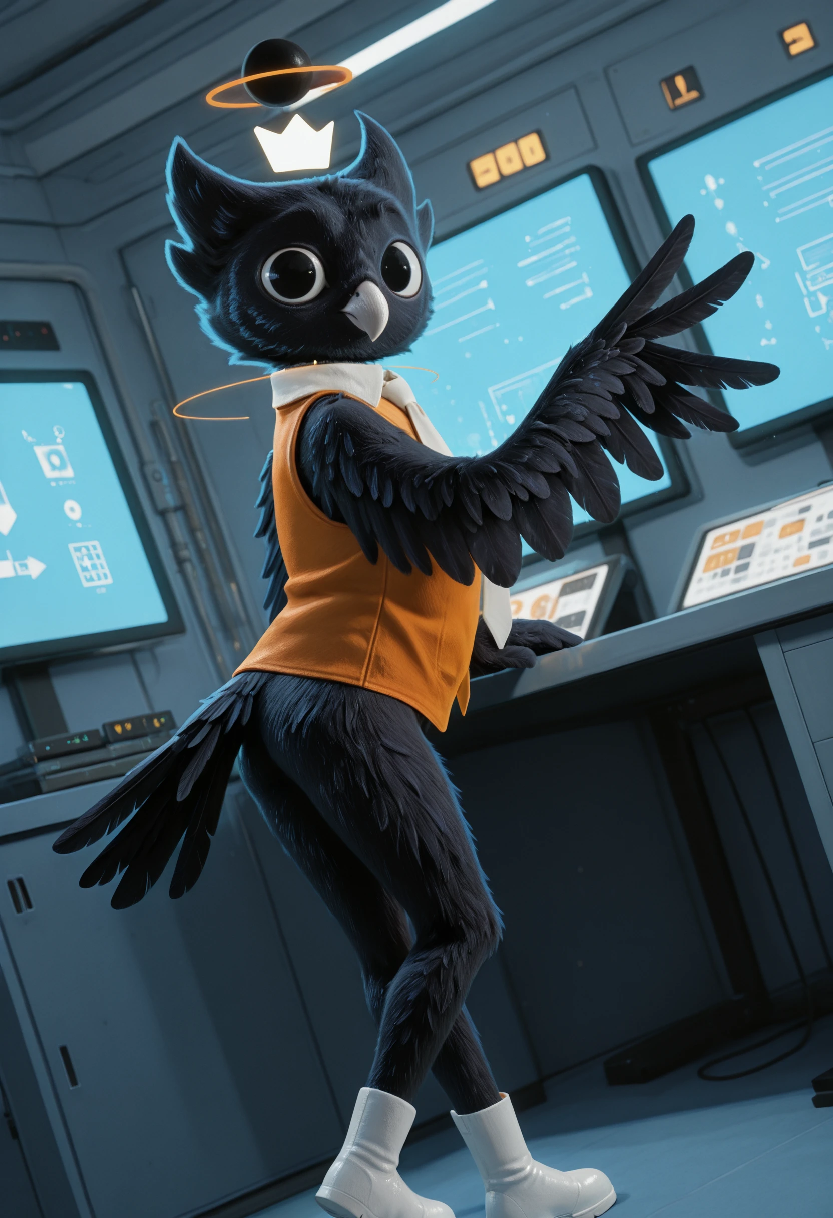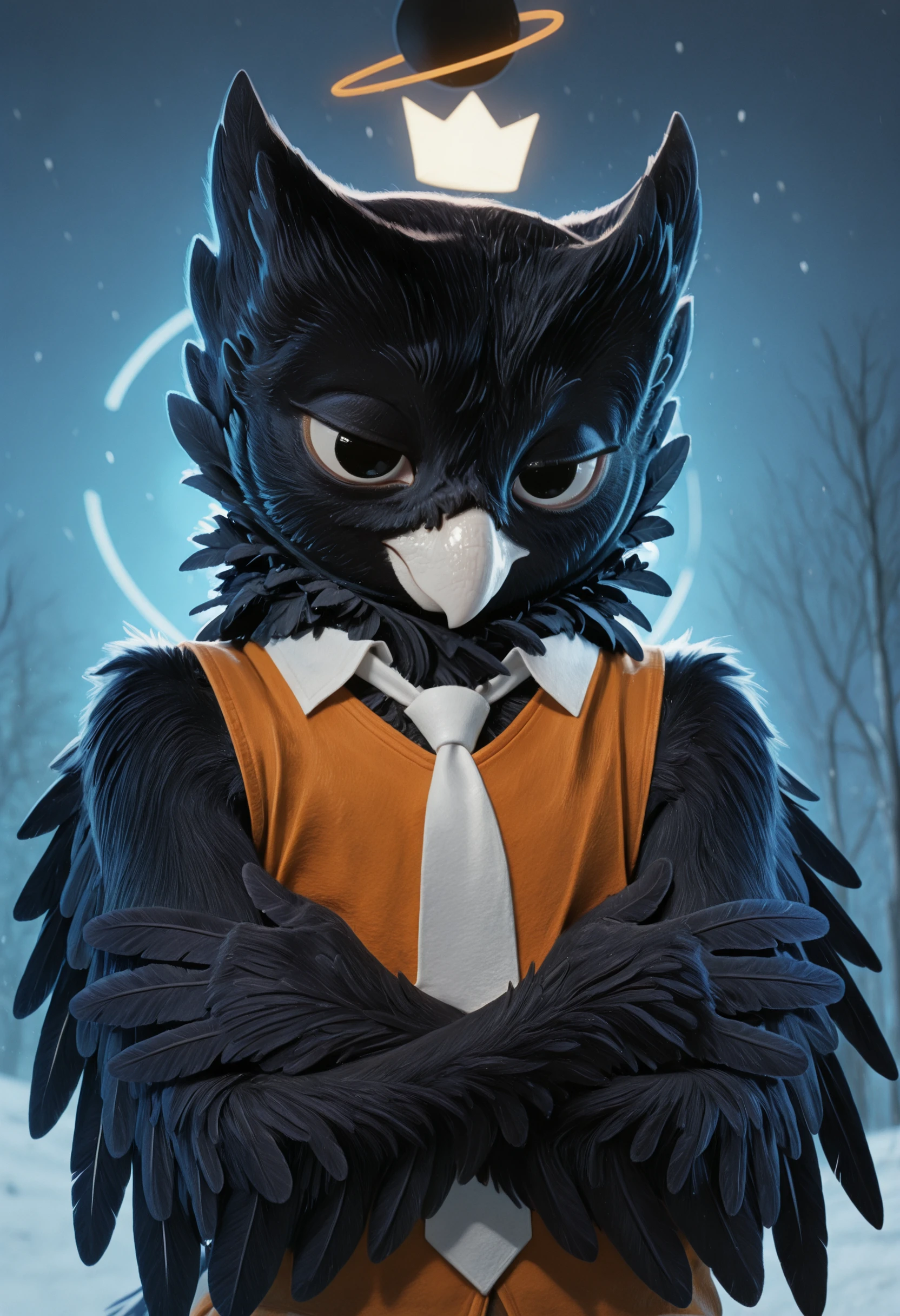 st0las_votv, bird, owl, avian, anthro, hi res, clothing, solo, black fur, furry, wings, male, tail, black eyes, male focus, 1boy, halo, feathers, black feathers, white beak, looking at viewer, orange vest, white necktie
