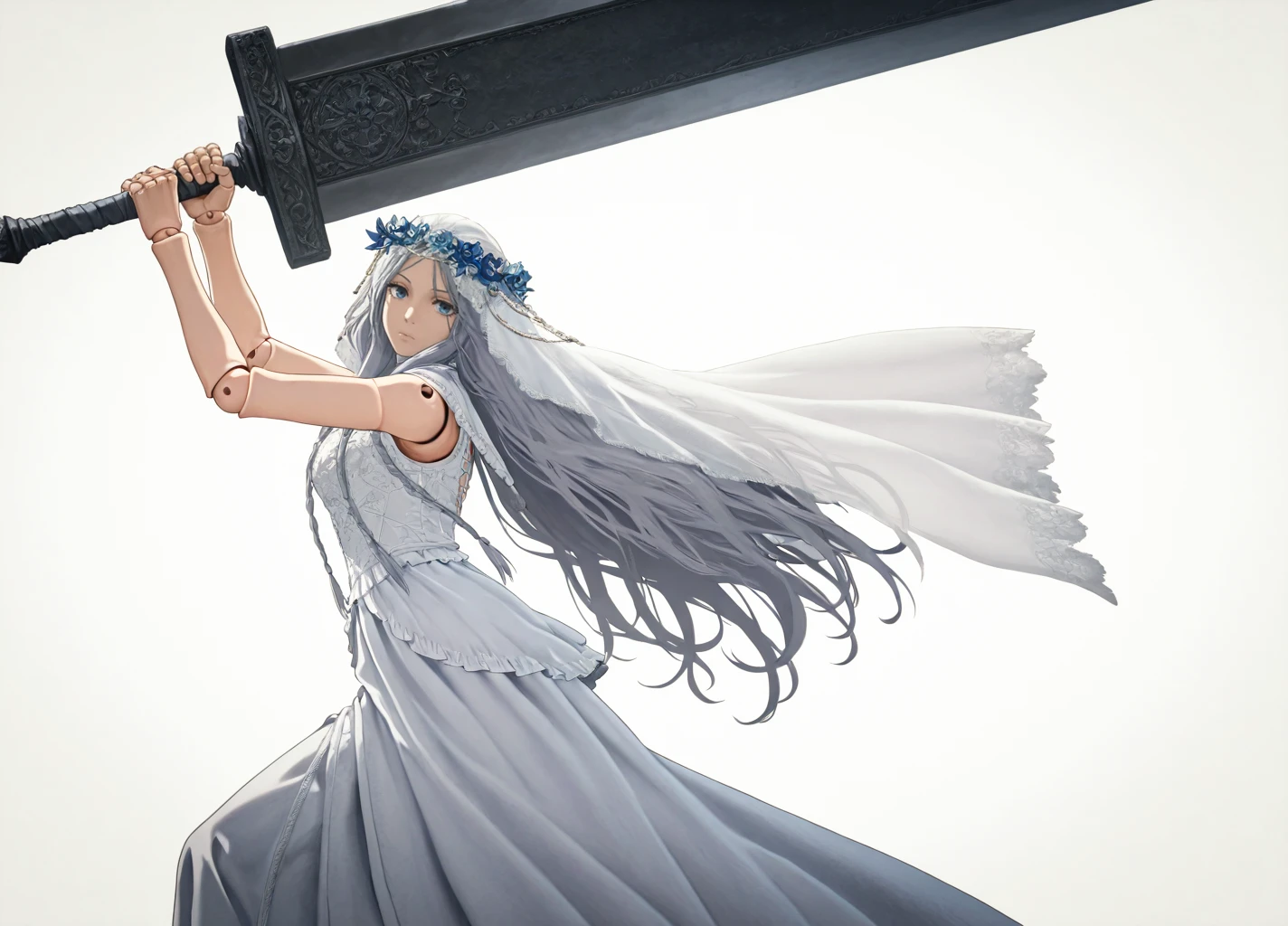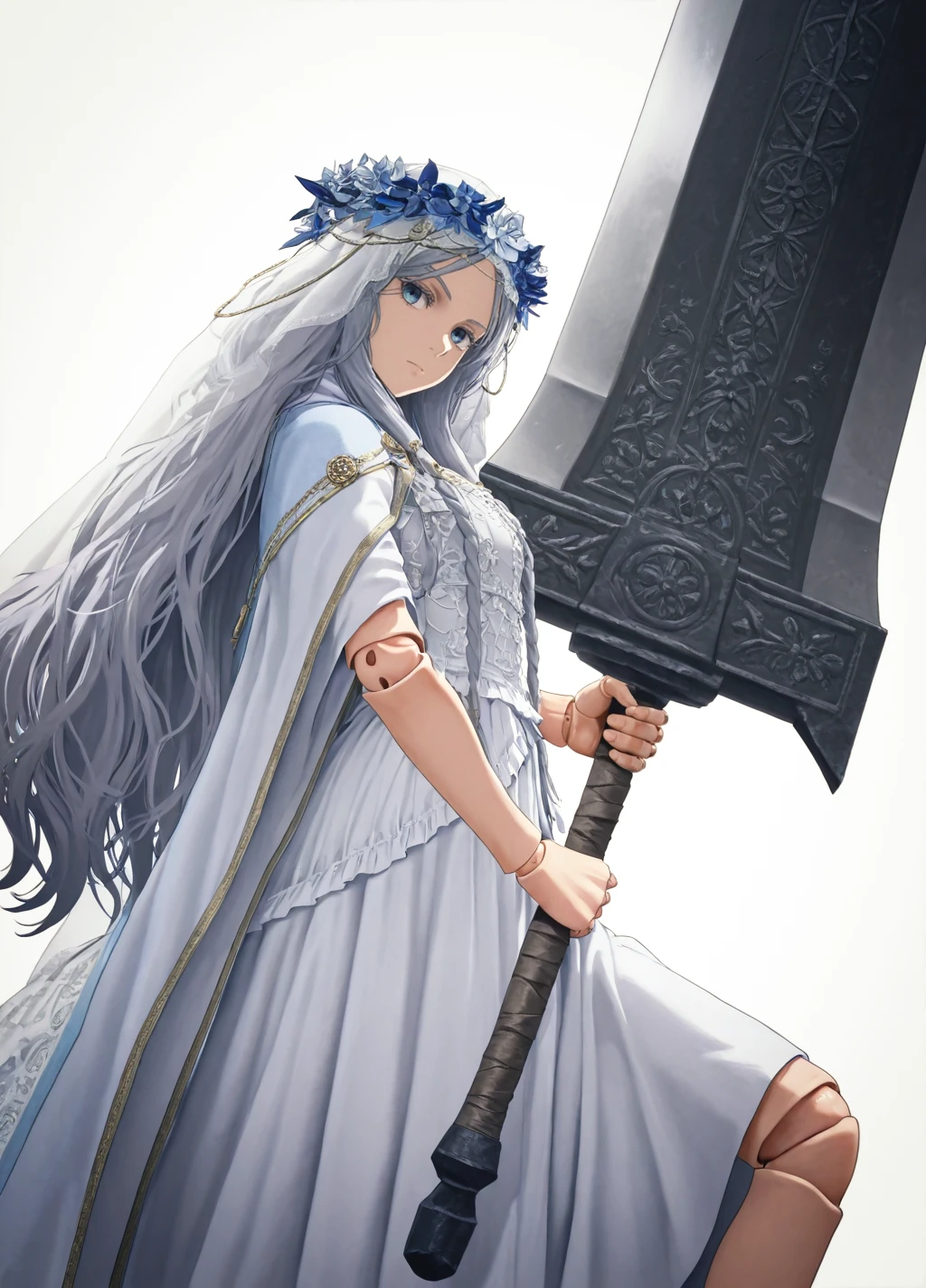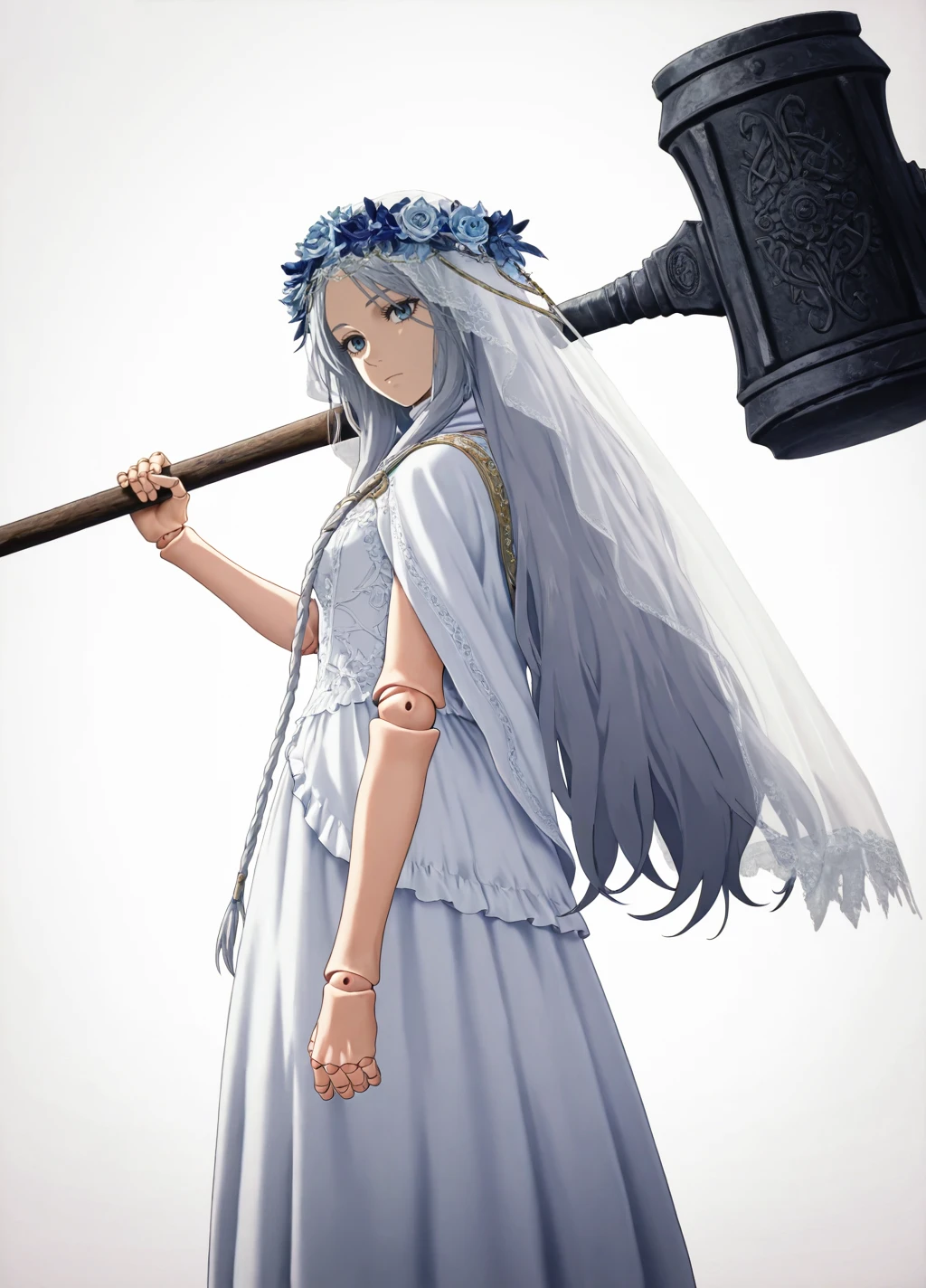 Revenant01, 1girl, solo, dress, long hair, veil, white dress, closed mouth, grey hair, flower, eyelashes,blue eyes, expressionless, doll joints,