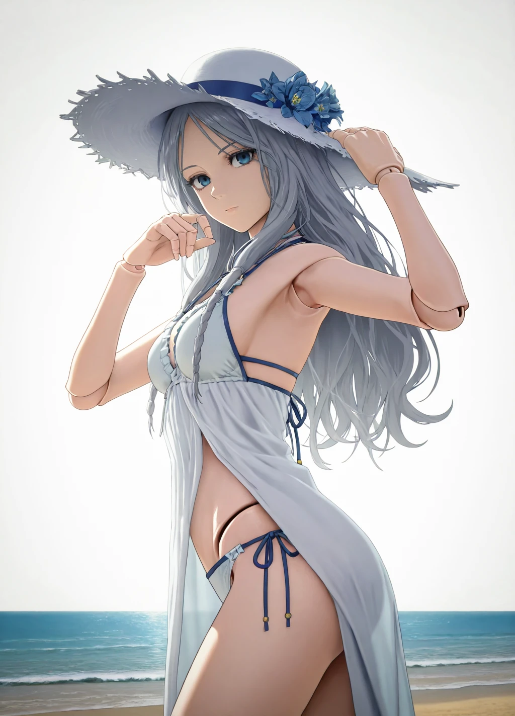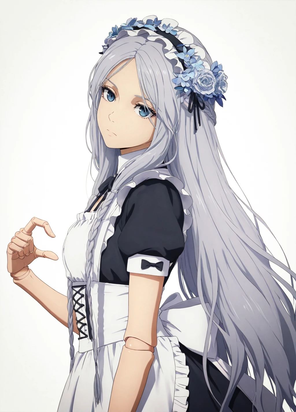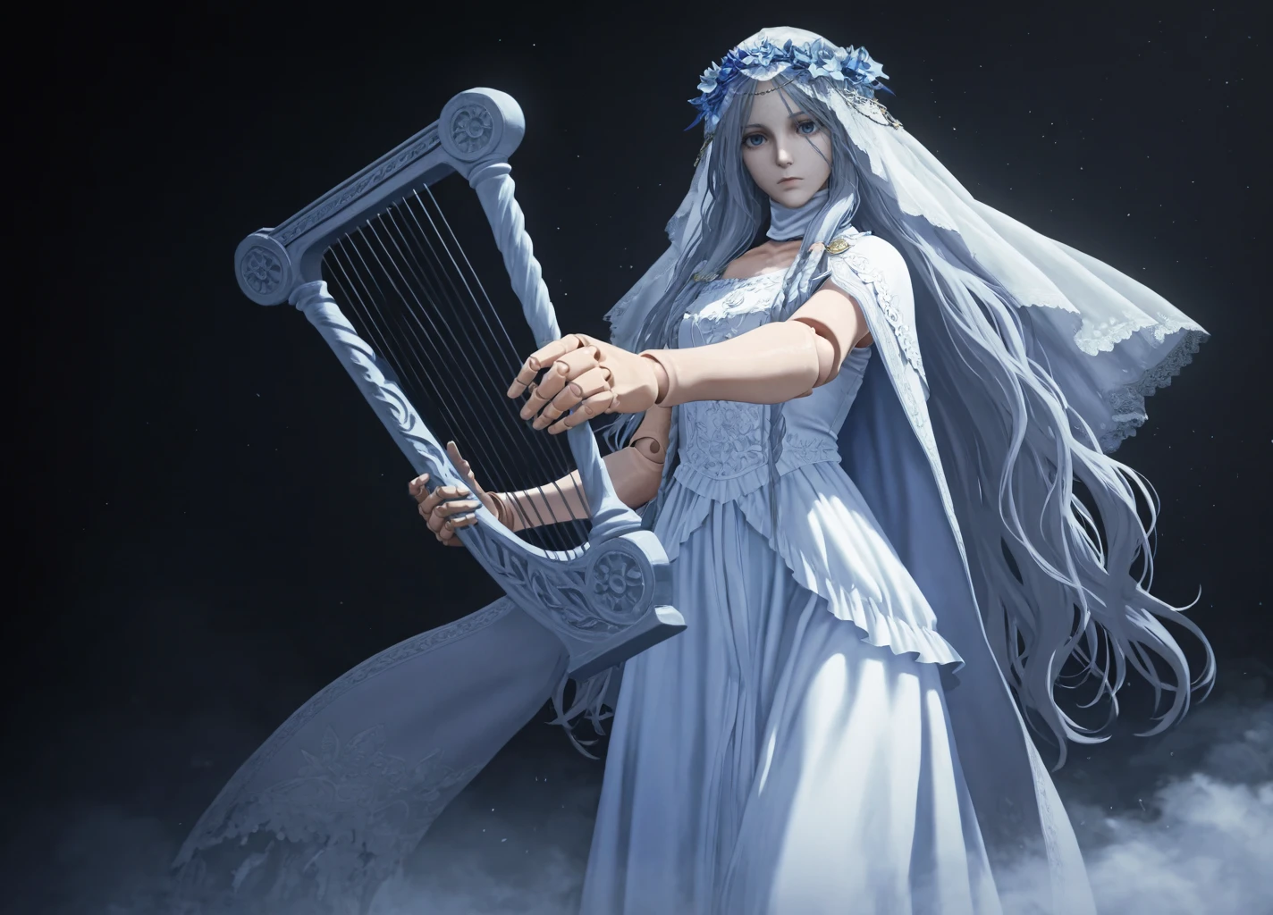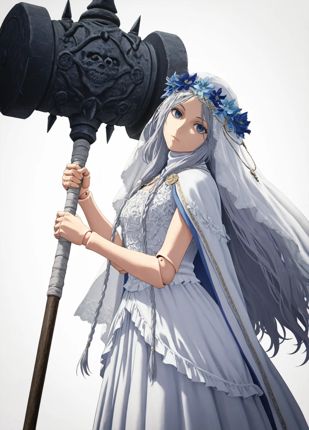 Revenant01, 1girl, solo, dress, long hair, veil, white dress, closed mouth, grey hair, flower, eyelashes,blue eyes, expressionless, doll joints,