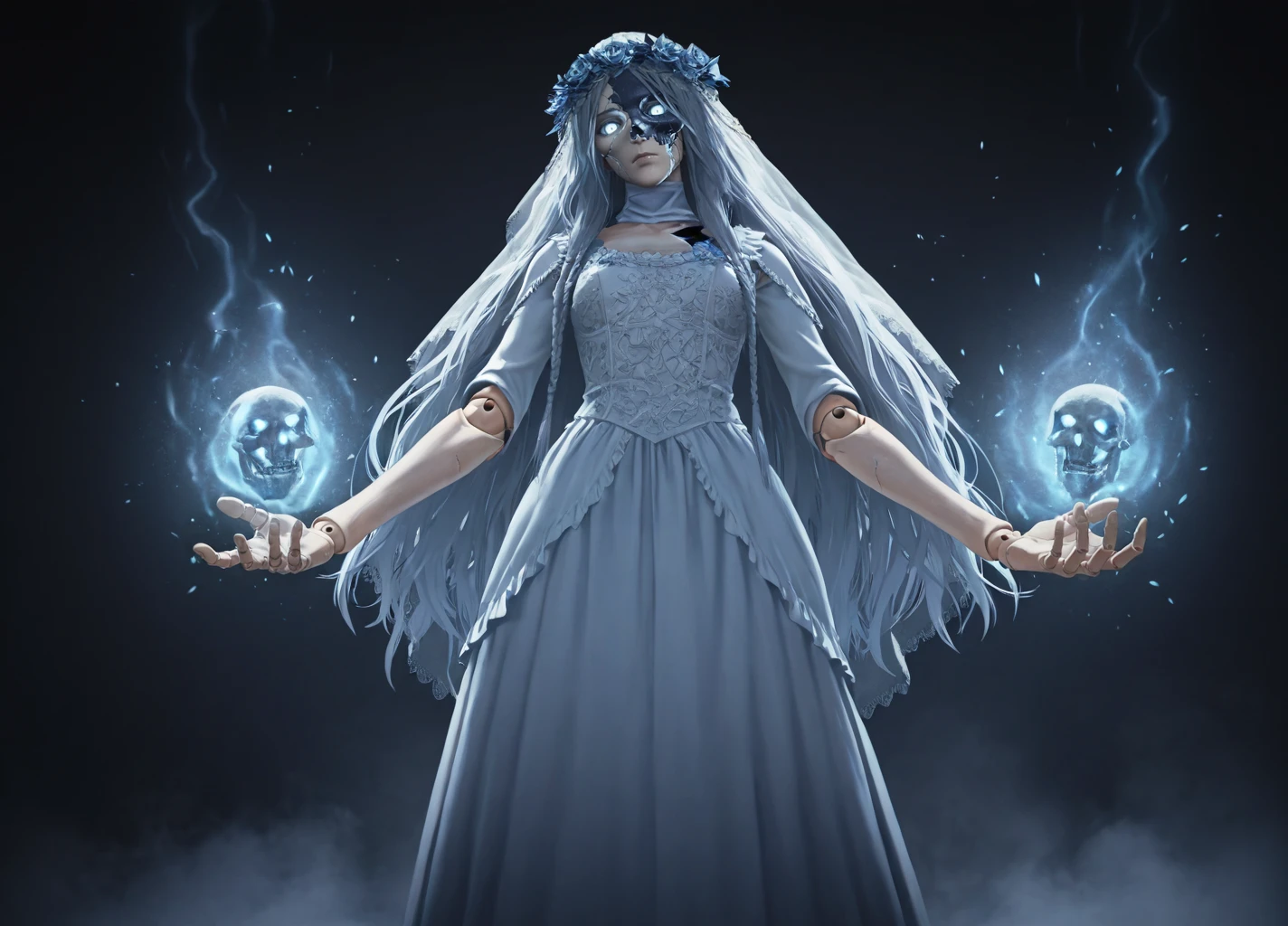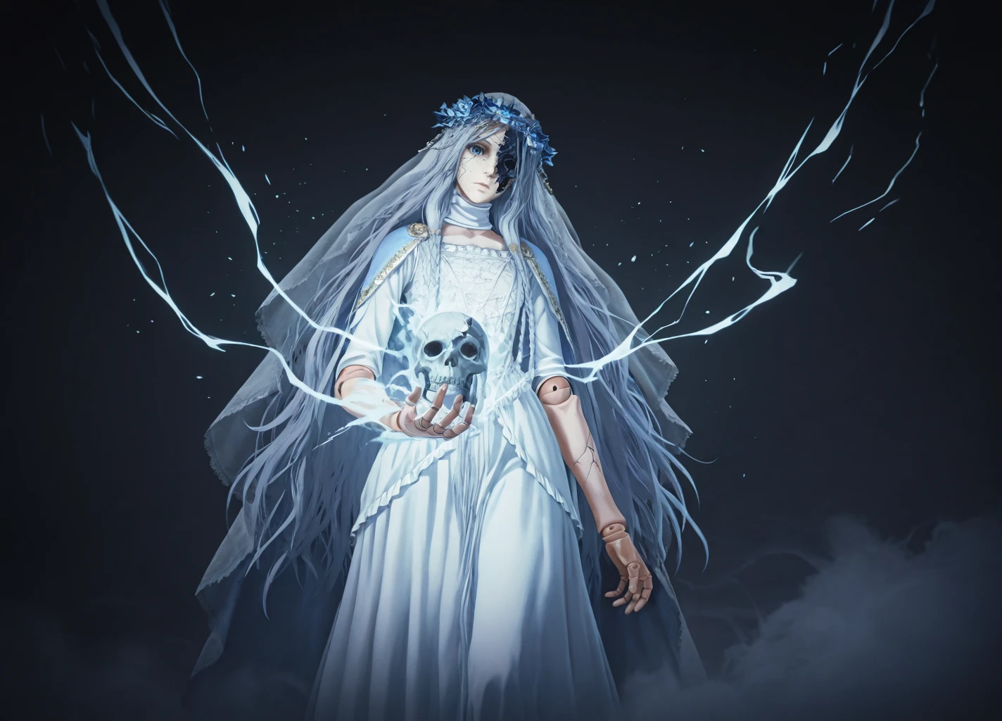 Revenant02,(cracked skin,half skull face),glowing, 1girl, solo, dress, long hair, veil, white dress, closed mouth, grey hair, flower, eyelashes,blue eyes, expressionless, doll joints,