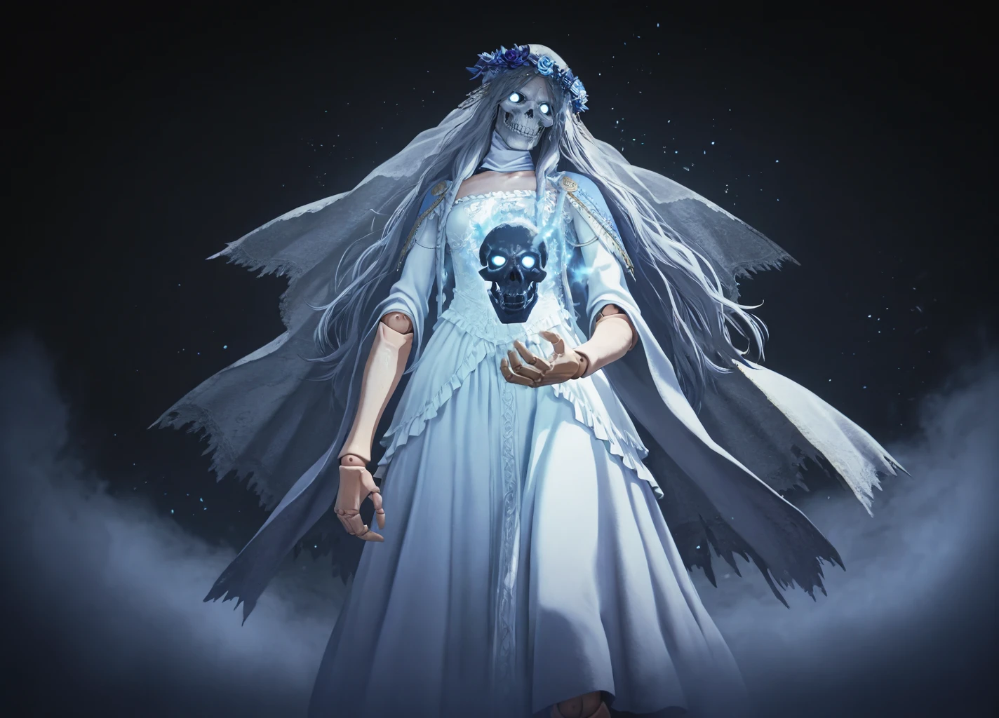 Revenant02,(skull,glowing, glowing eyes), 1girl, solo, dress, long hair, veil, white dress, grey hair, flower, looking at viewer, doll joints,