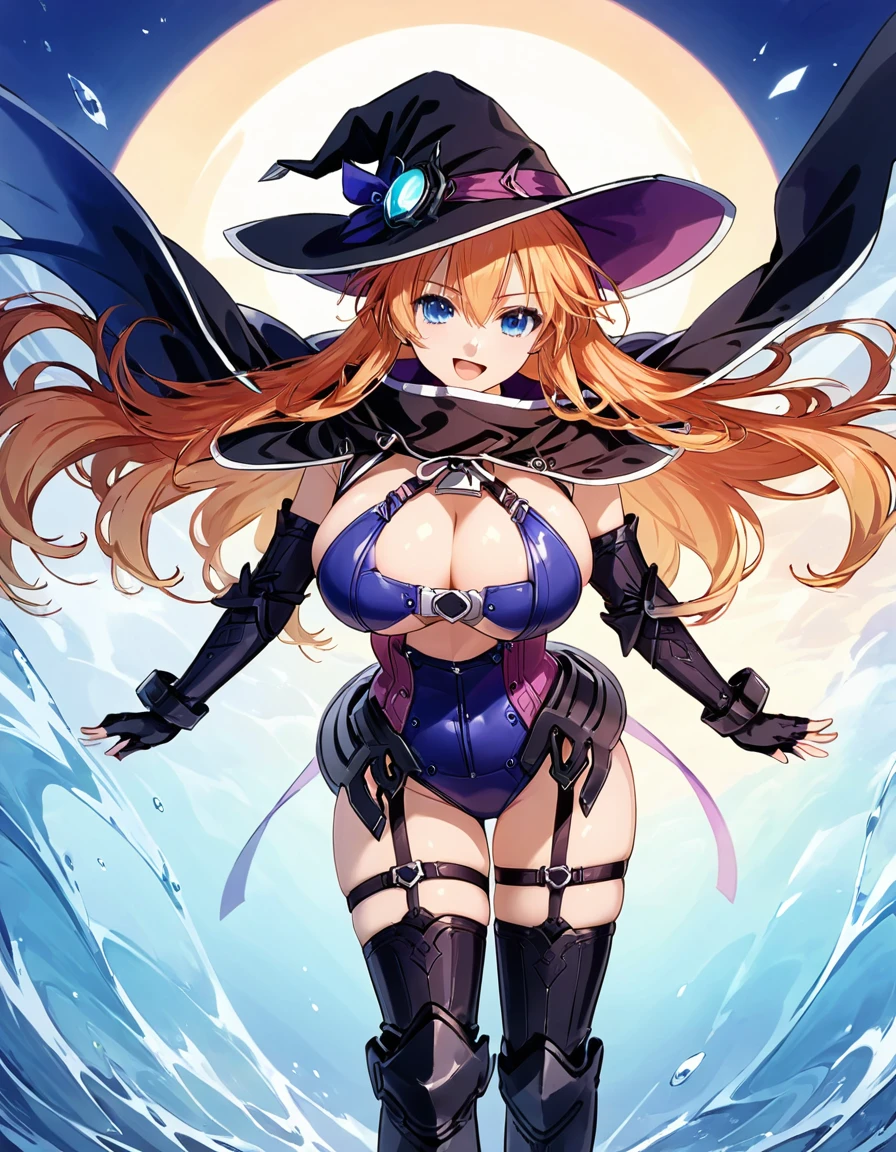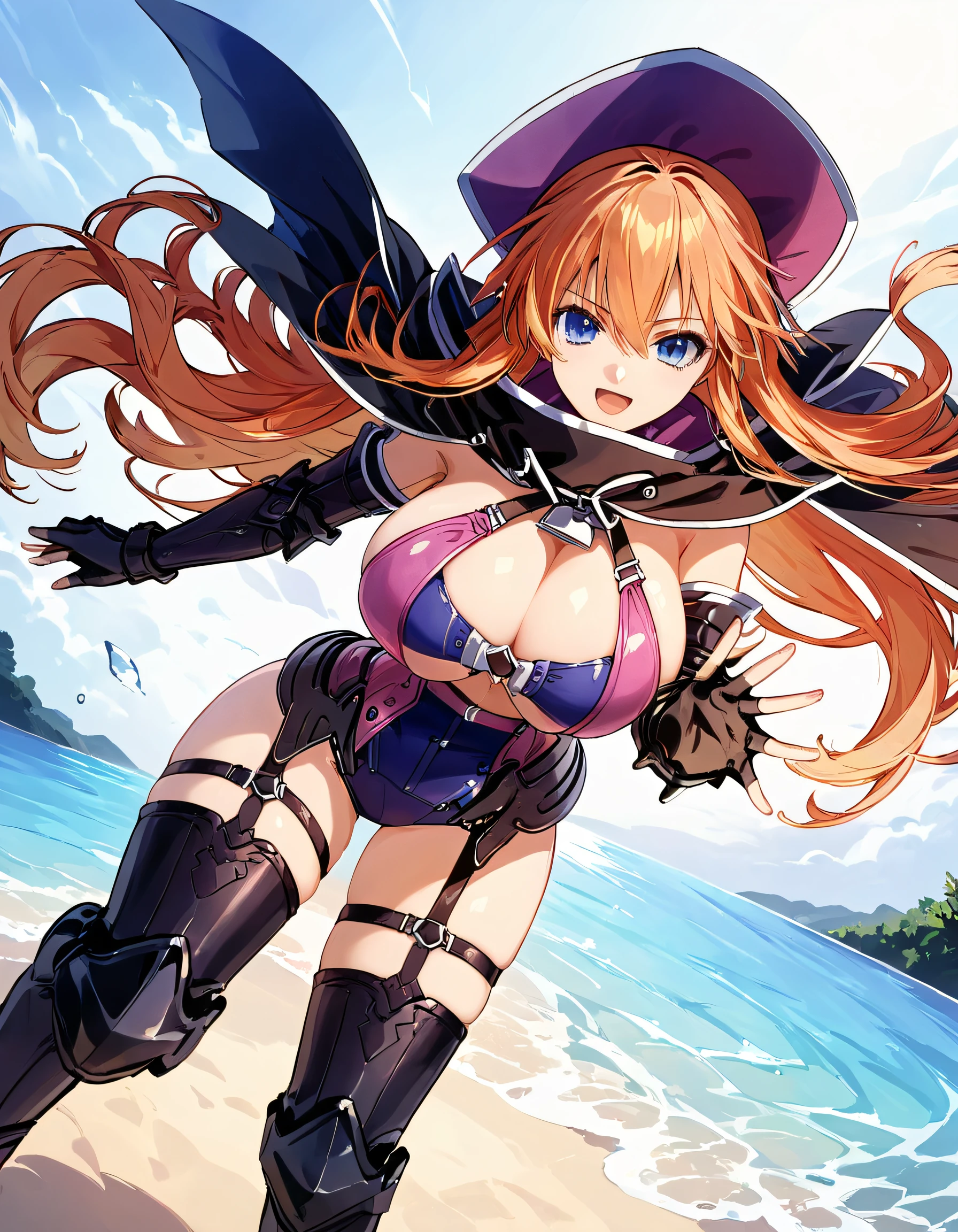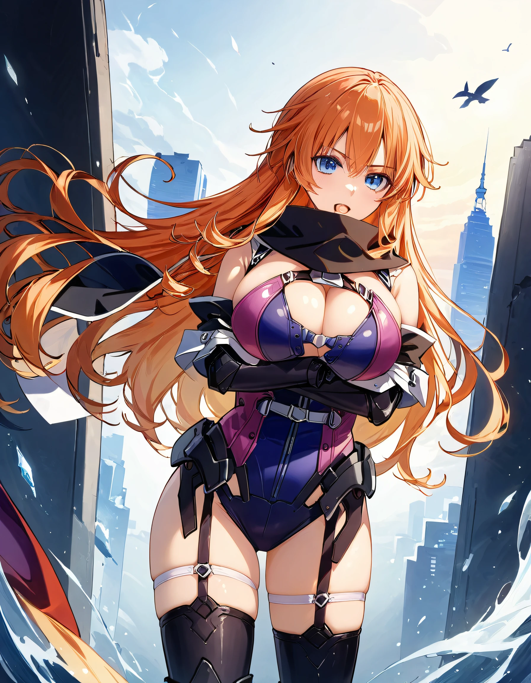 1girl, solo, long hair, breasts, looking at viewer, smile, open mouth, blue eyes, blonde hair, large breasts, thighhighs, gloves, cleavage, hair between eyes, sitting, very long hair, :d, sky, black gloves, black thighhighs, fingerless gloves, armor, clothing cutout, covered navel, garter straps, cleavage cutout, crossed legs