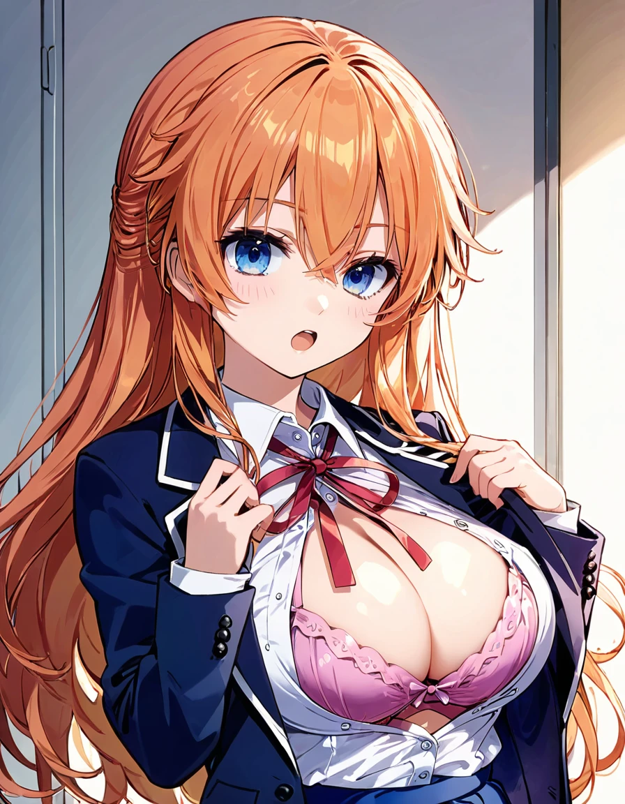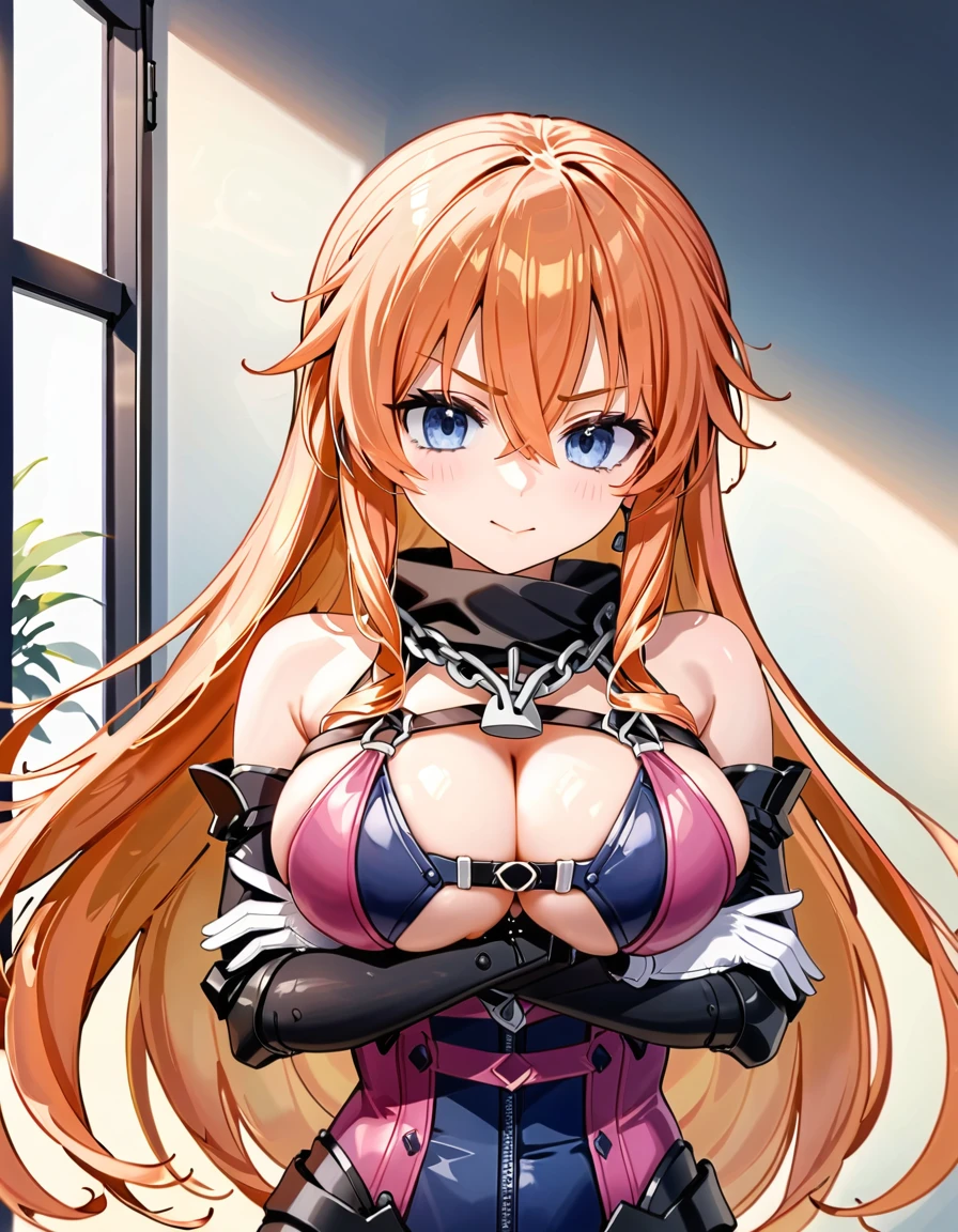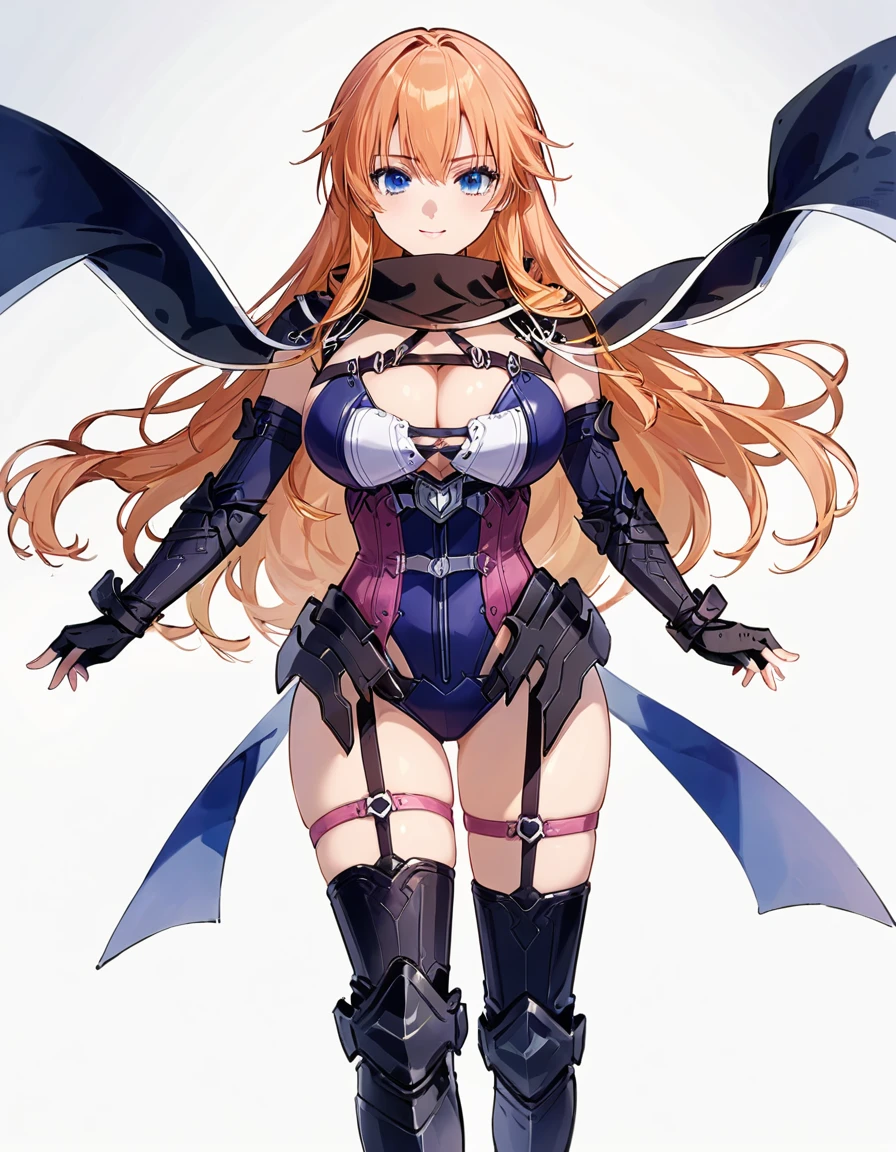 1girl, solo, long hair, breasts, looking at viewer, smile, open mouth, blue eyes, blonde hair, large breasts, thighhighs, gloves, cleavage, hair between eyes, sitting, very long hair, :d, sky, black gloves, black thighhighs, fingerless gloves, armor, clothing cutout, covered navel, garter straps, cleavage cutout, crossed legs